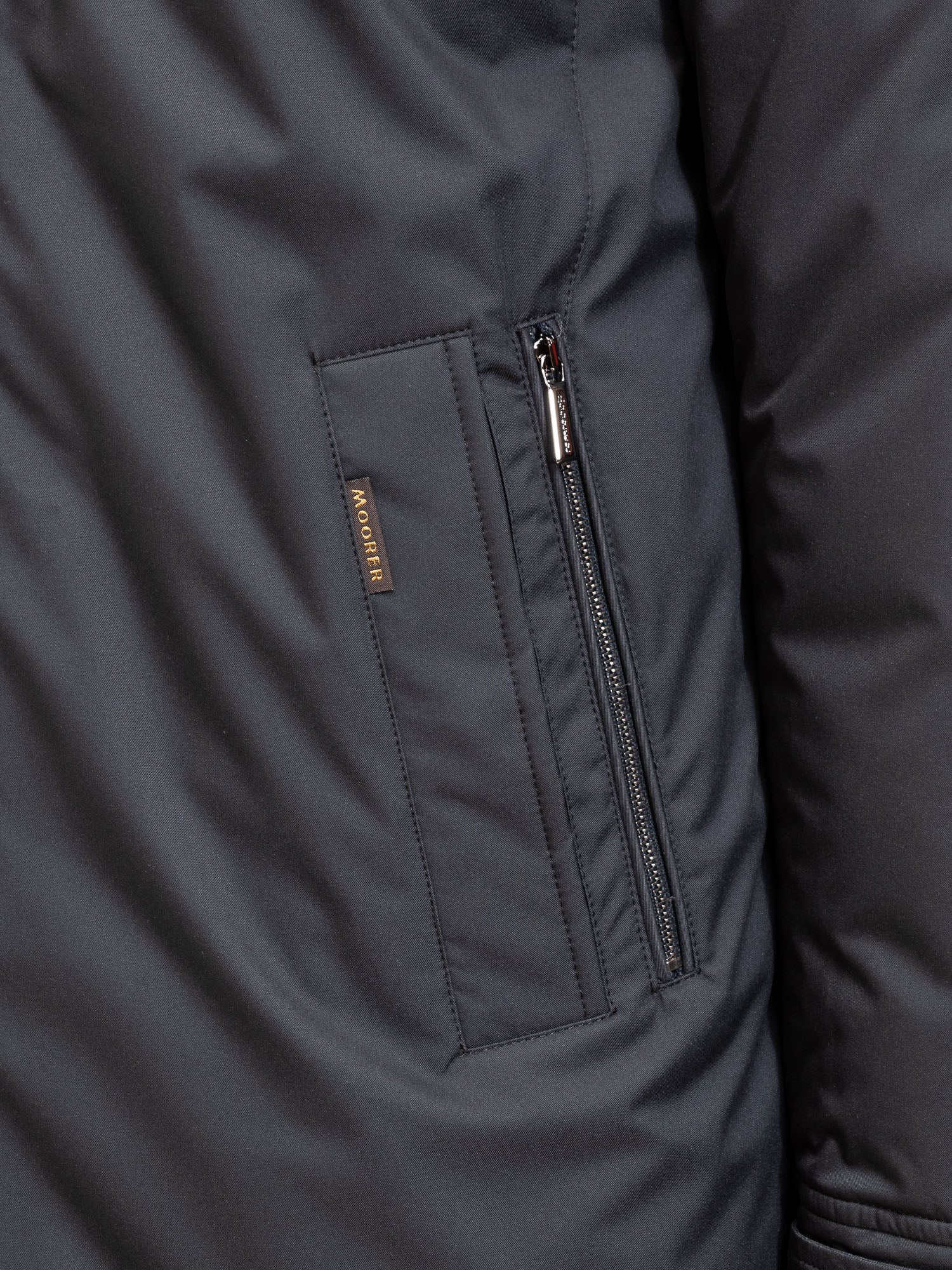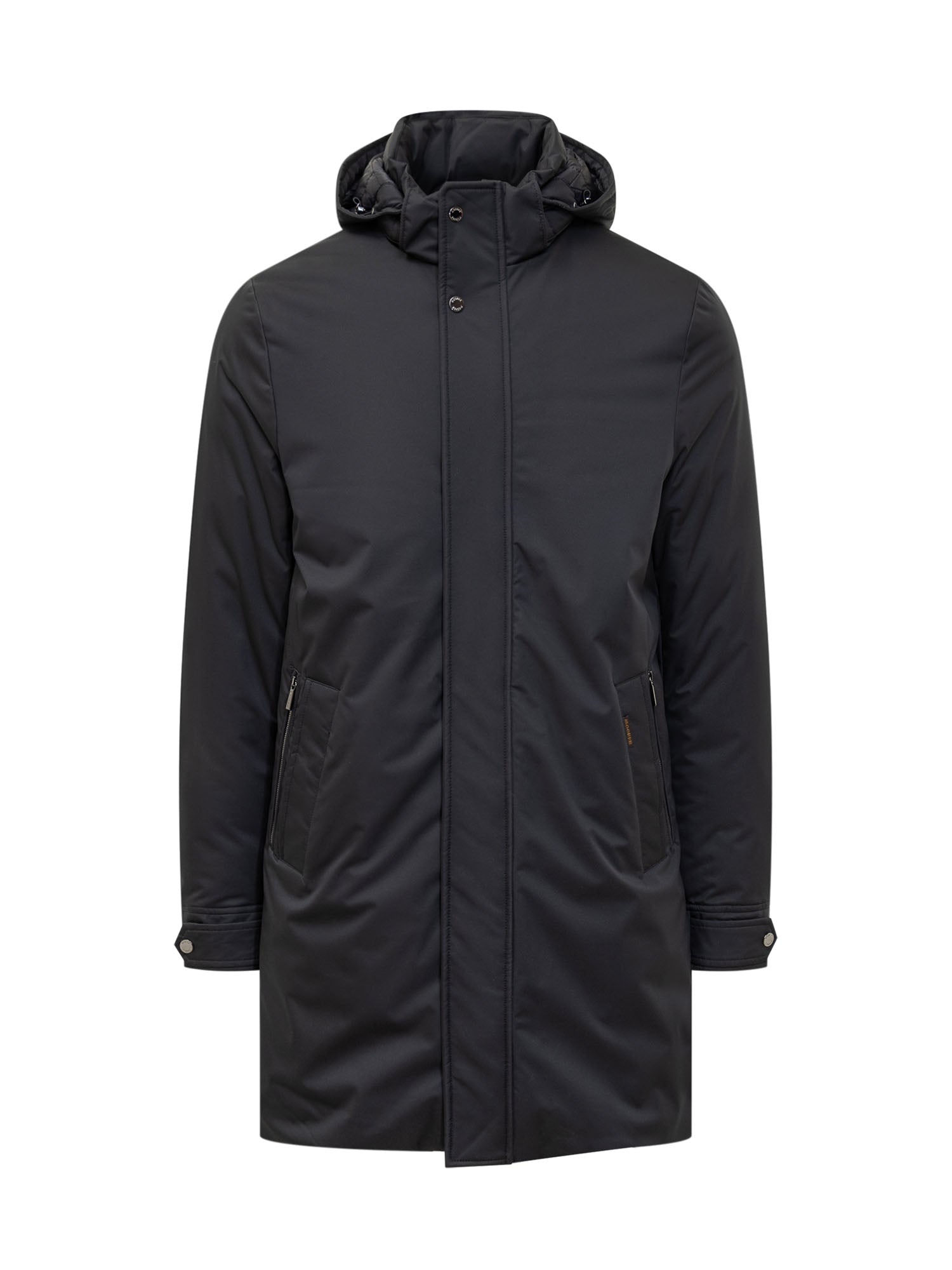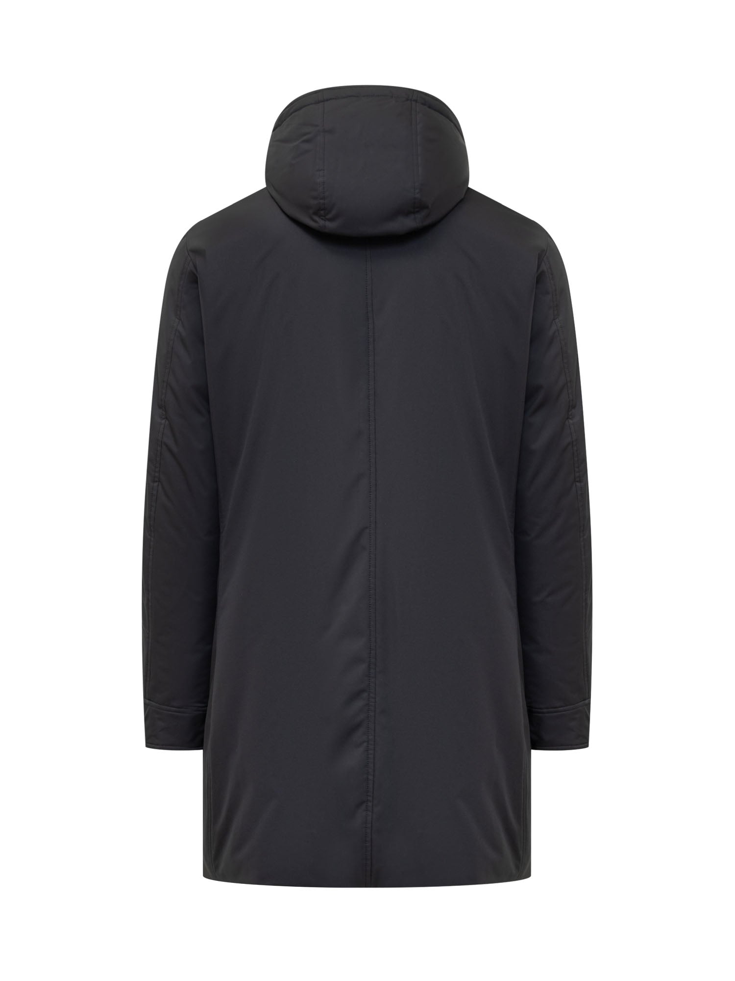 Giubbino a maniche lunghe con cappuccio. Cappuccio con coulisse. Chiusura con bottoni e zip. Polsi con bottoni. Quattro tasche laterali. Targhetta logo ricamata sulla tasca.