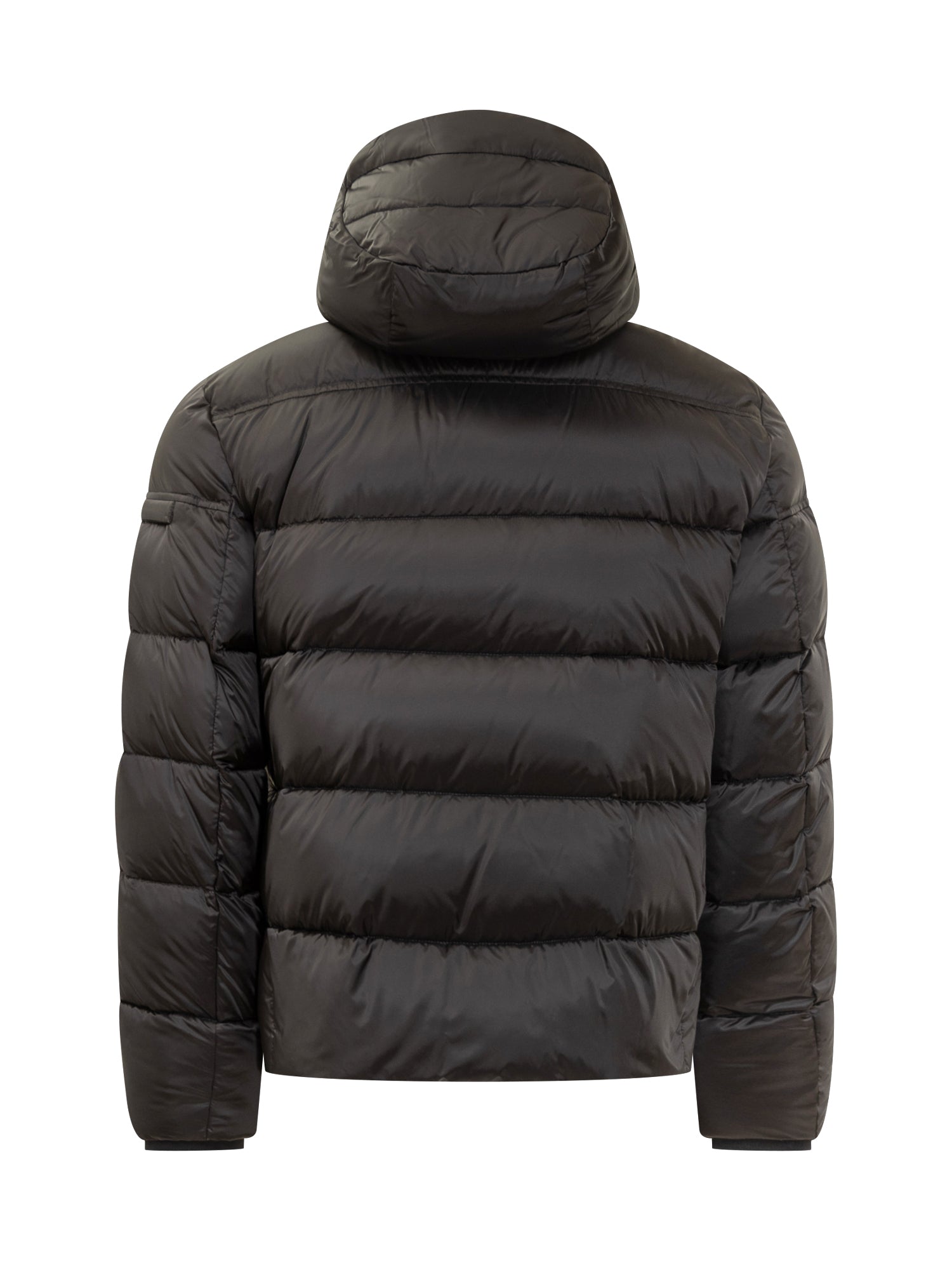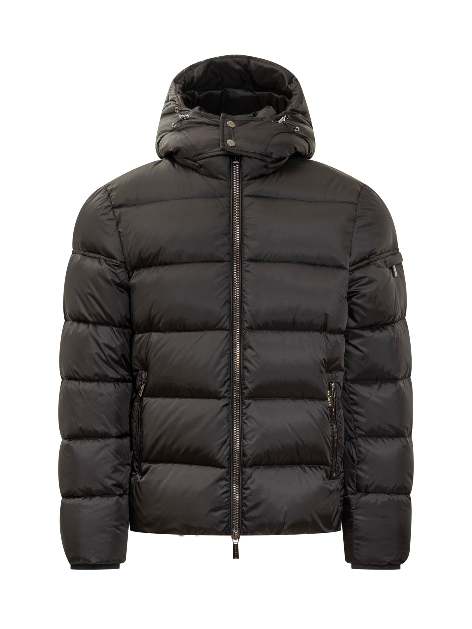 Piumino Brett-SH Moorer in tessuto tecnico nero lucido. Imbottitura calda, cappuccio regolabile e zip frontale a doppio cursore.