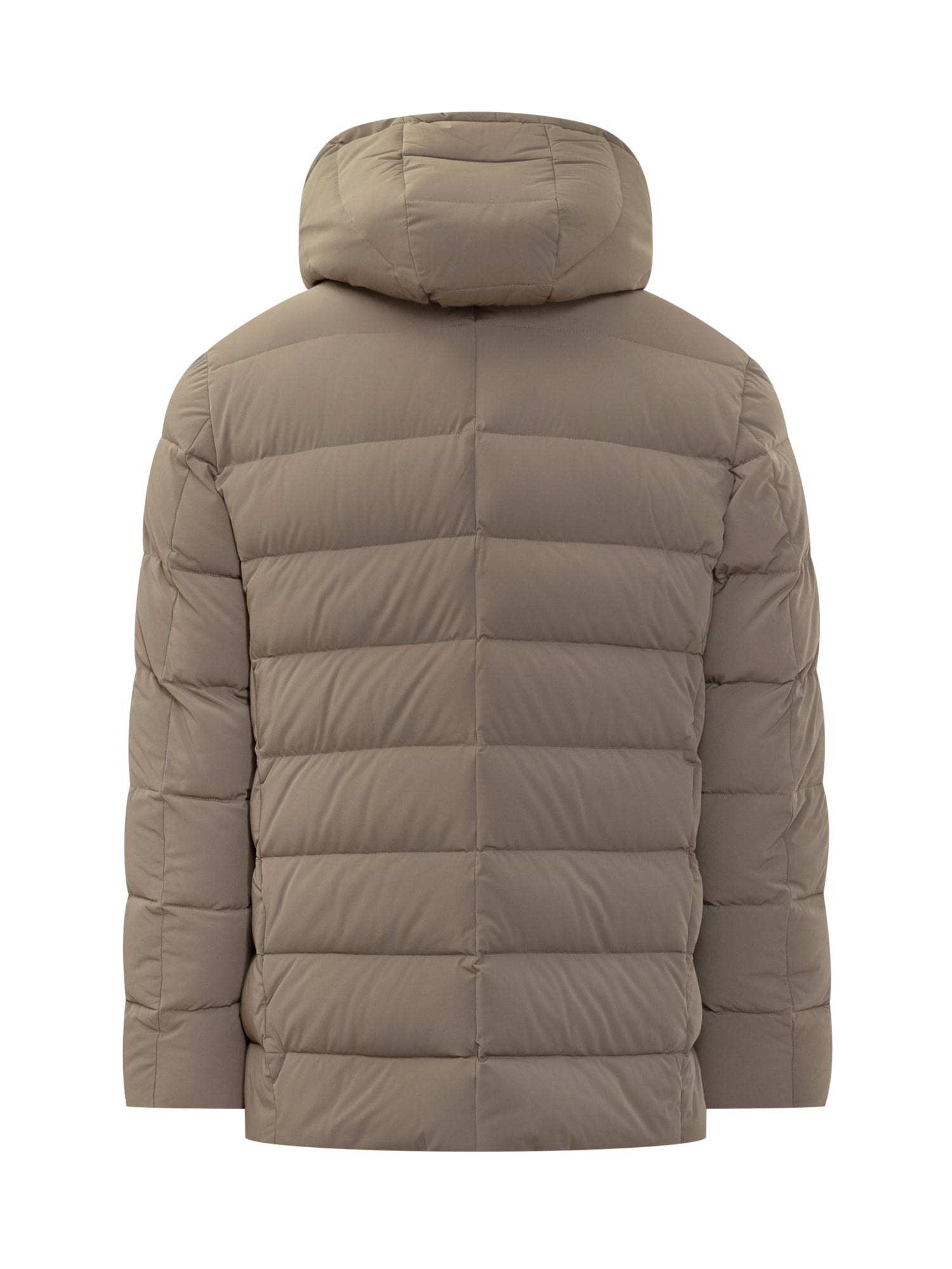 Piumino Florio-KN Moorer in tessuto tecnico beige, con imbottitura calda e cappuccio removibile.