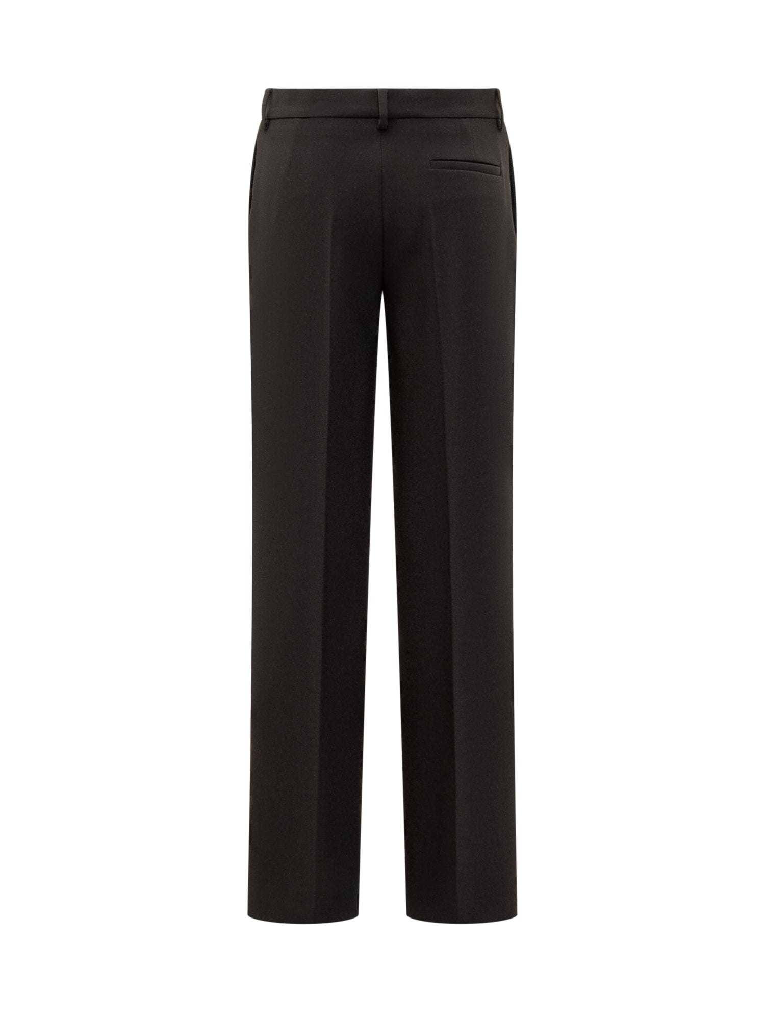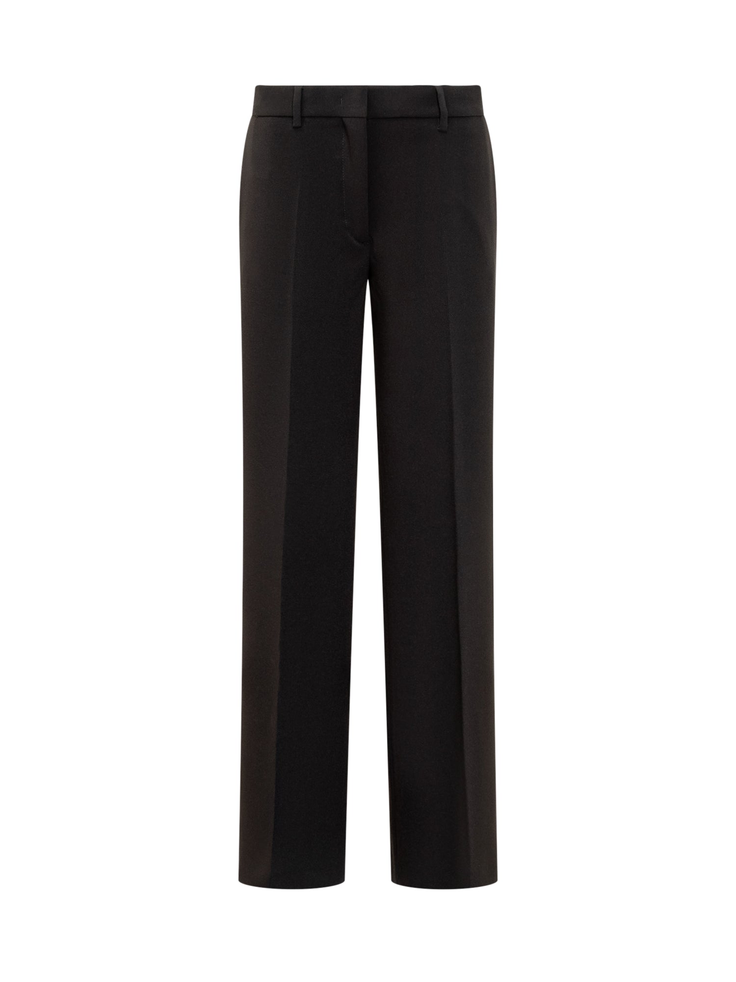 Pantalone lungo svasato. Chiusura con gancini, bottone e zip. Passanti per cintura. Due tasche a filetto verticali laterali. Tasca a filetto sul retro. Modello con piega stirata.