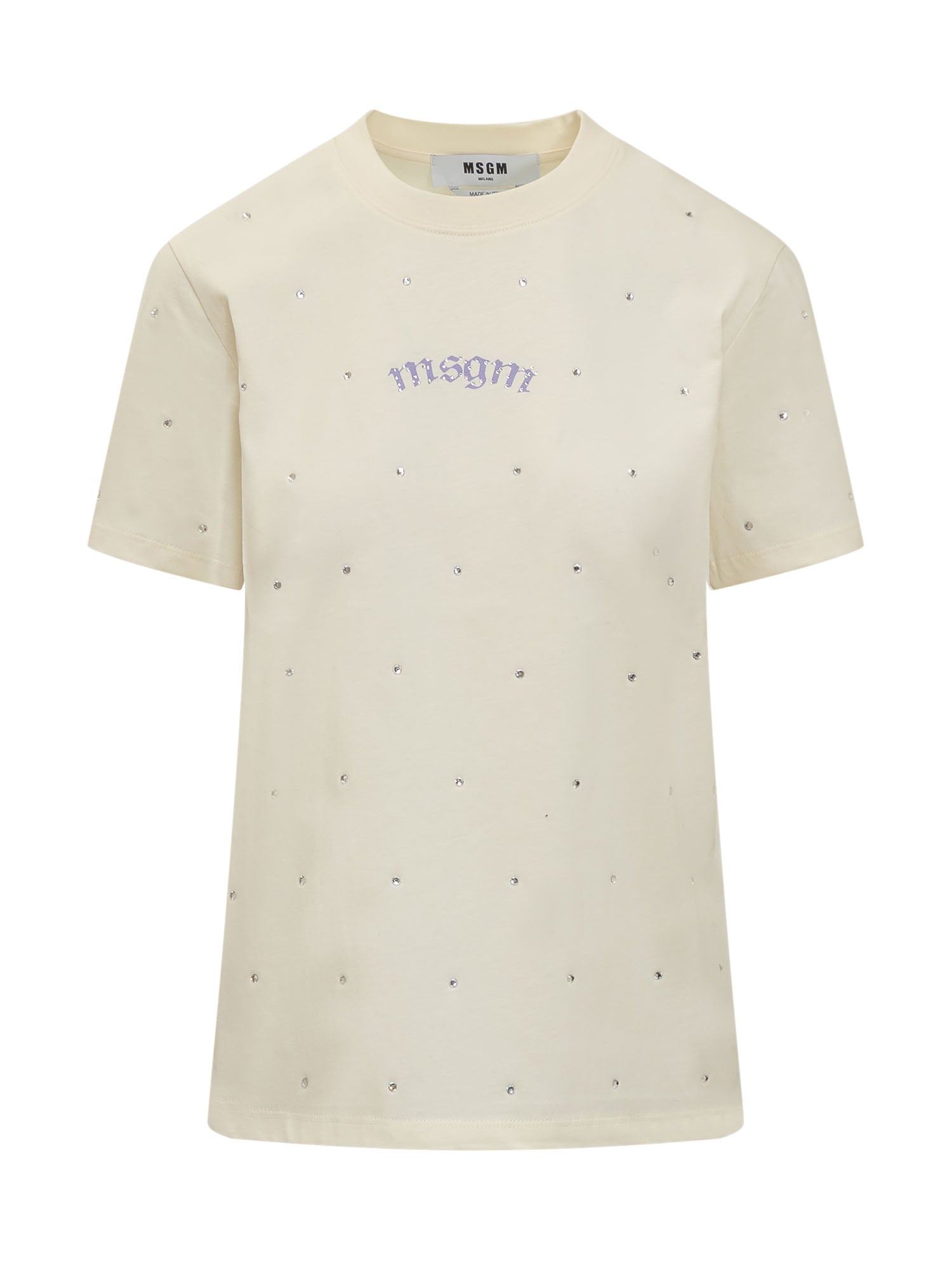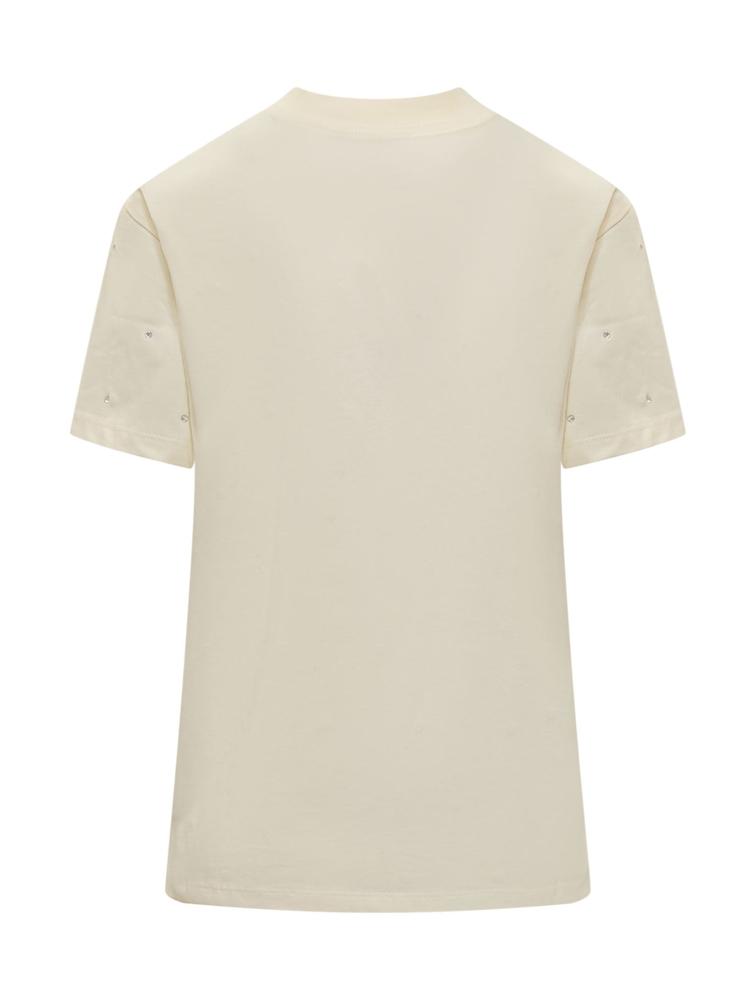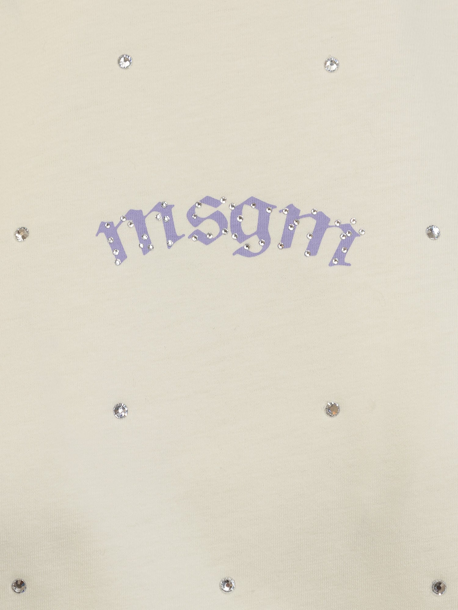 T-shirt beige. Girocollo. Logo sul davanti. Strass all-over.