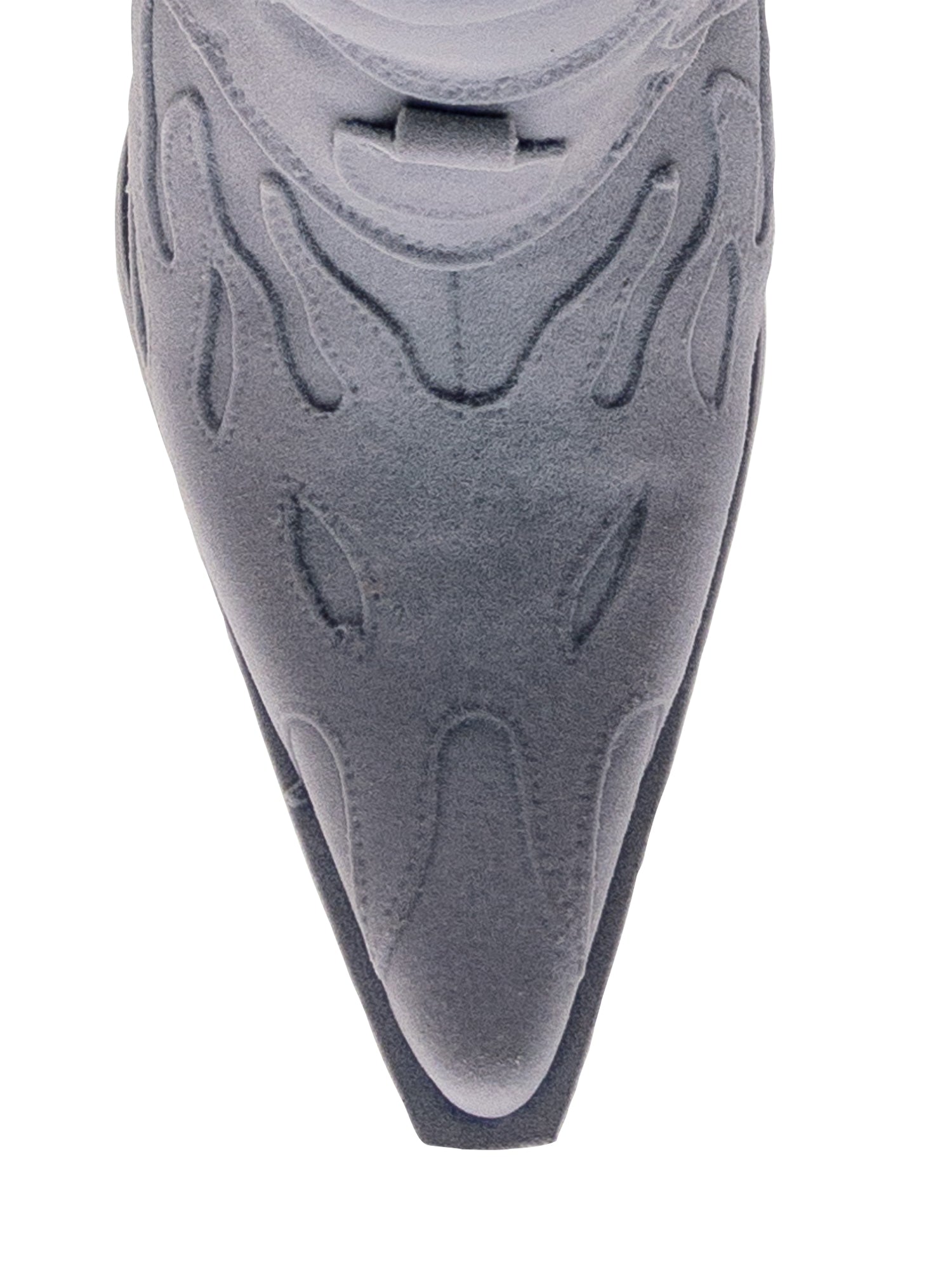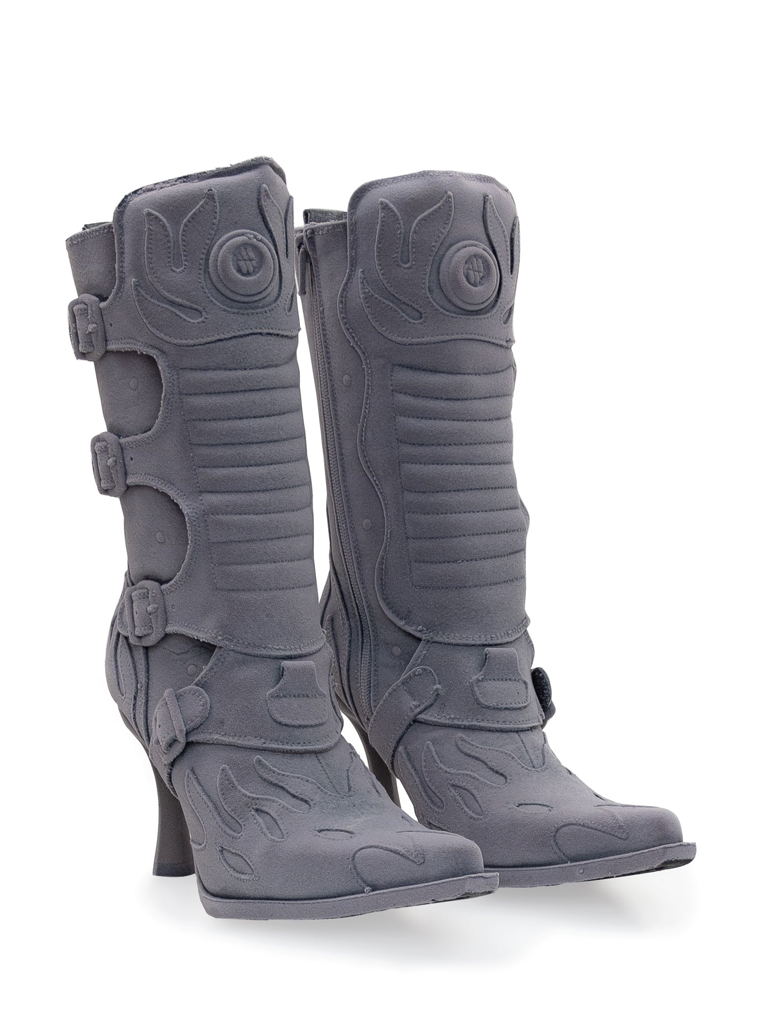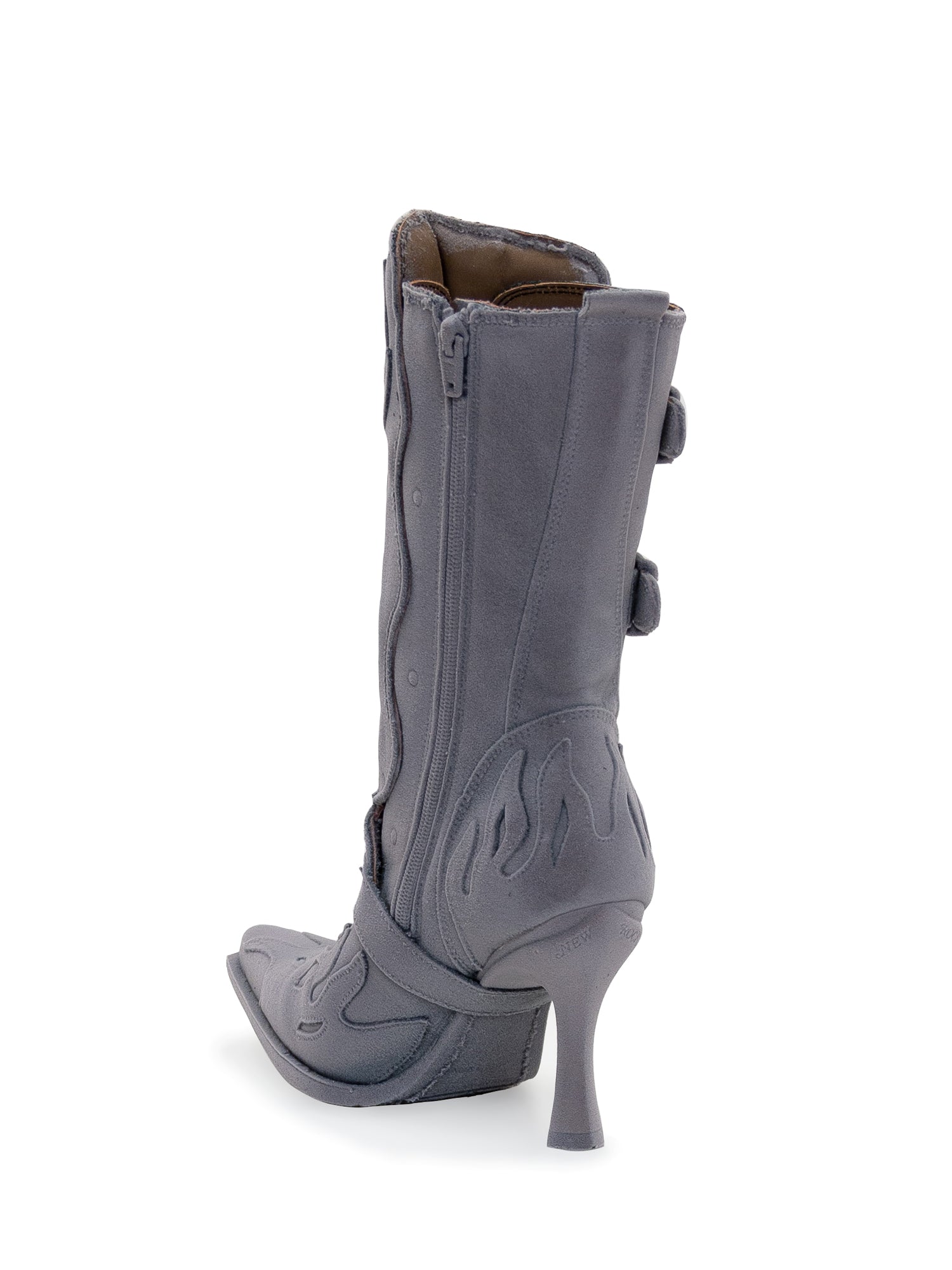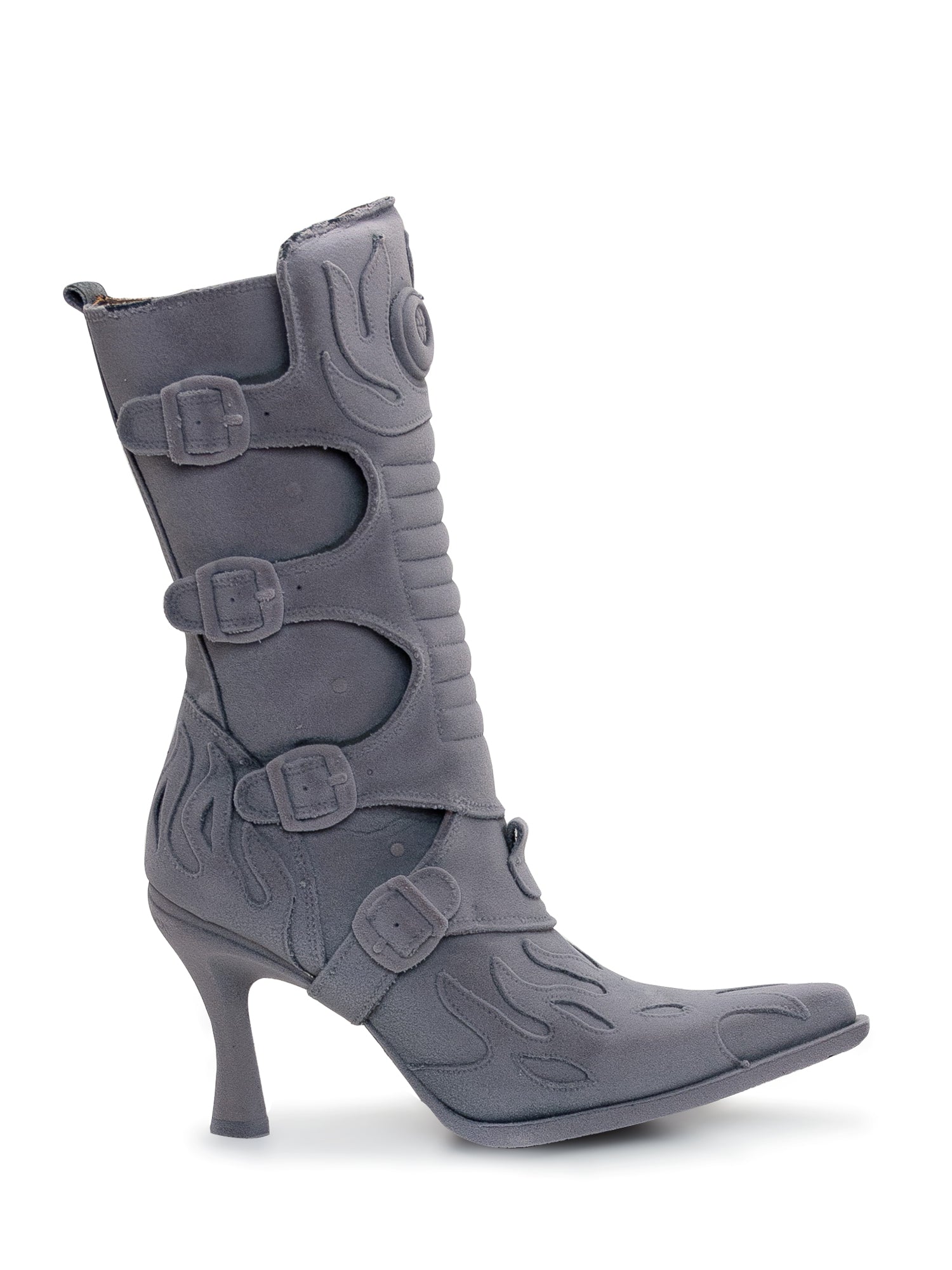 Stivale alto grigio con tacco. Pelle scamosciata. Chiusura con zip sul lato. Dettaglio fibbie sul lato. Fiamme patch su punta e tallone.