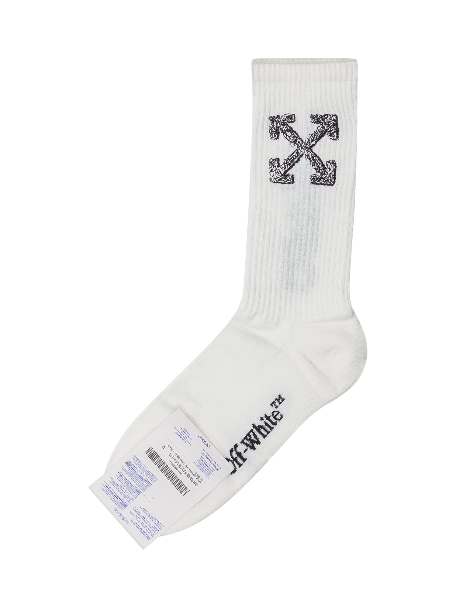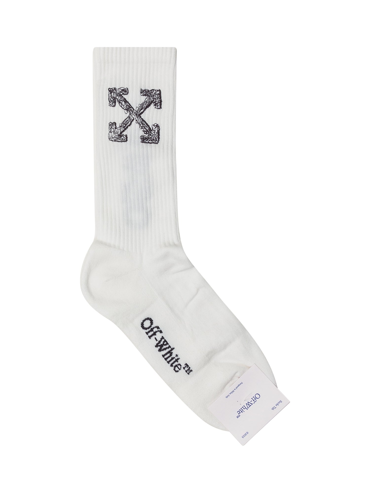 Calzini Off-White in cotone bianco con motivo frecce ricamato nero e logo sul piede.