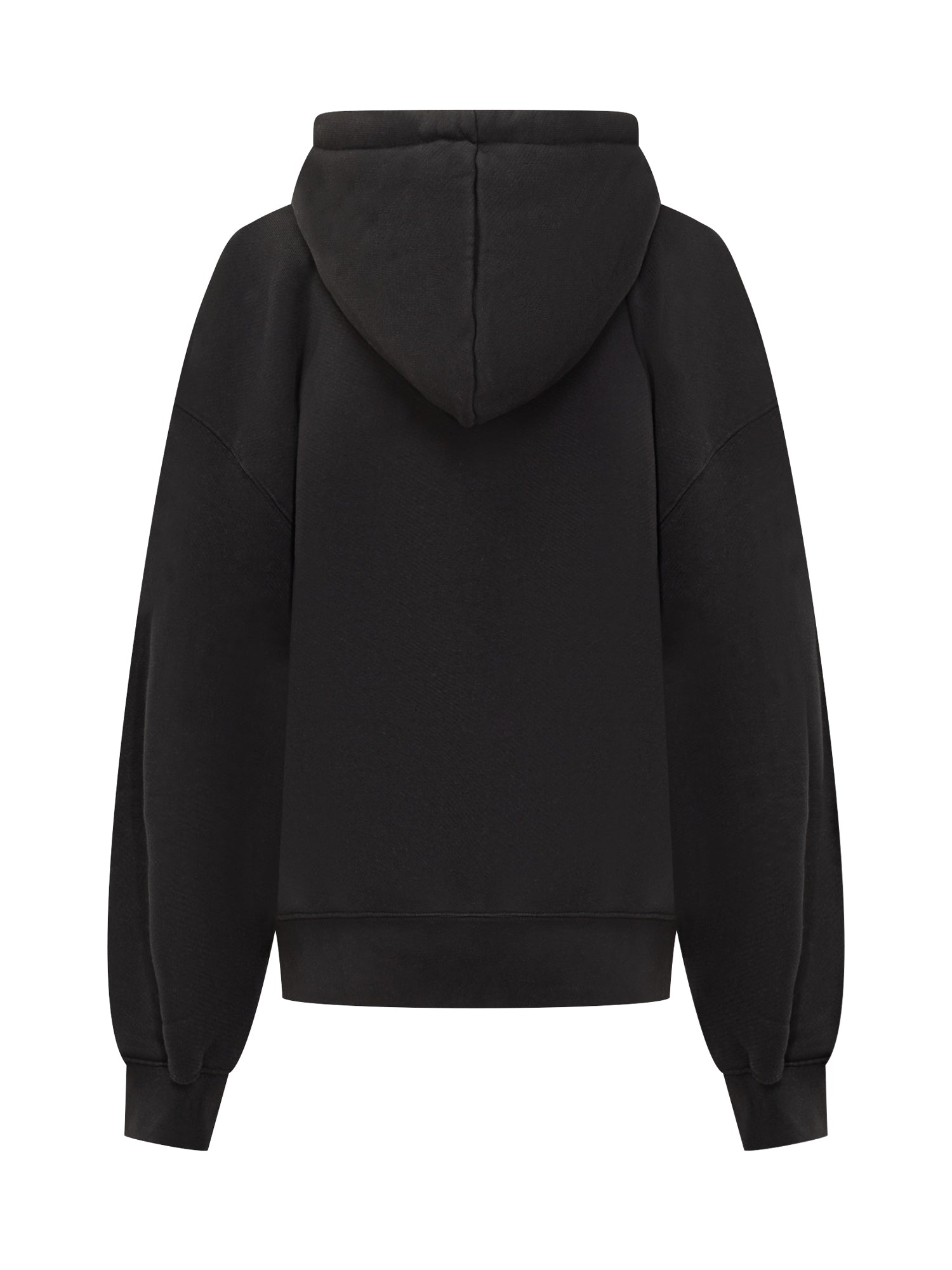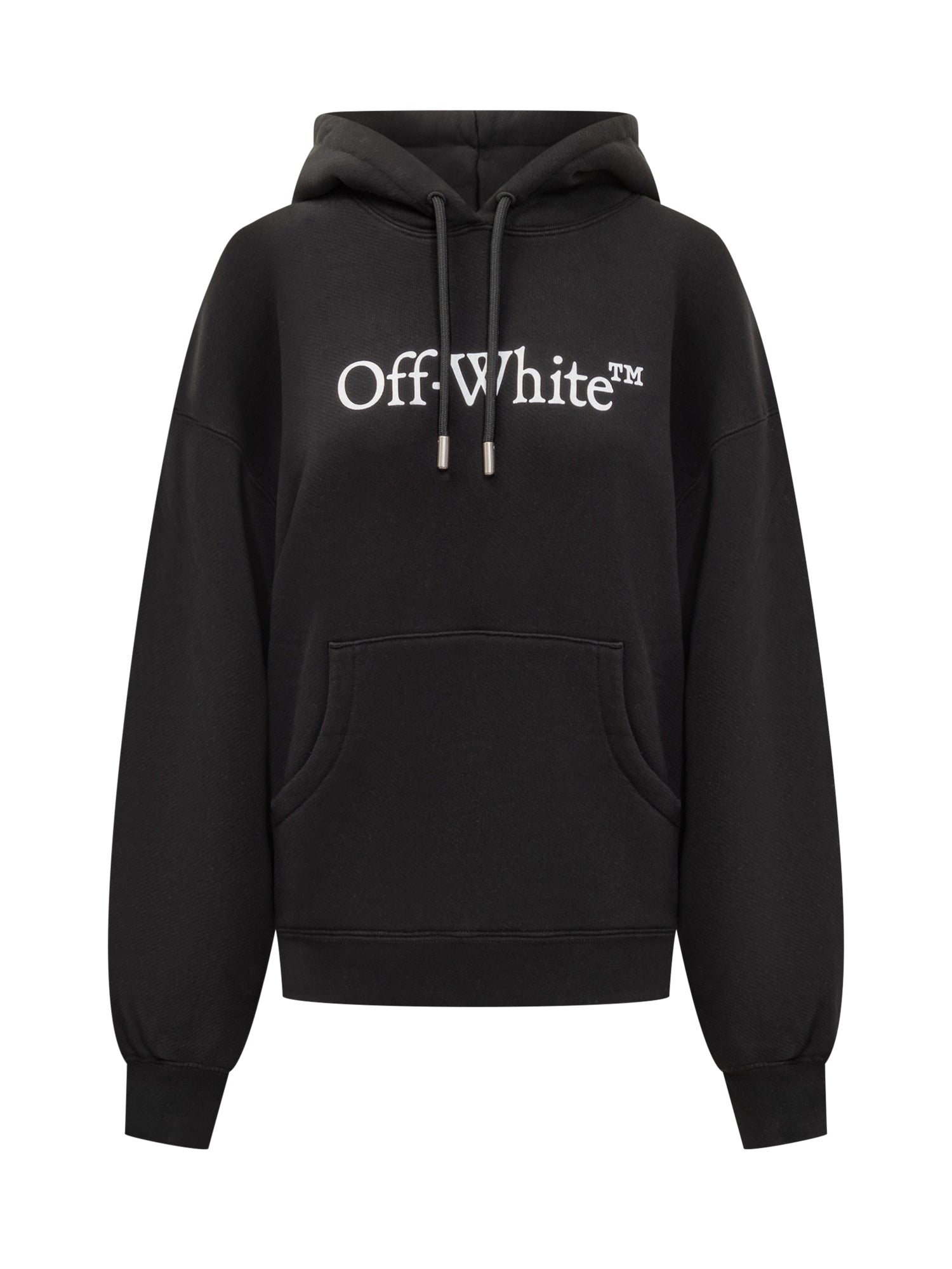 Felpa oversize Off-White in cotone nero con cappuccio, tasca a marsupio e logo bianco sul petto.