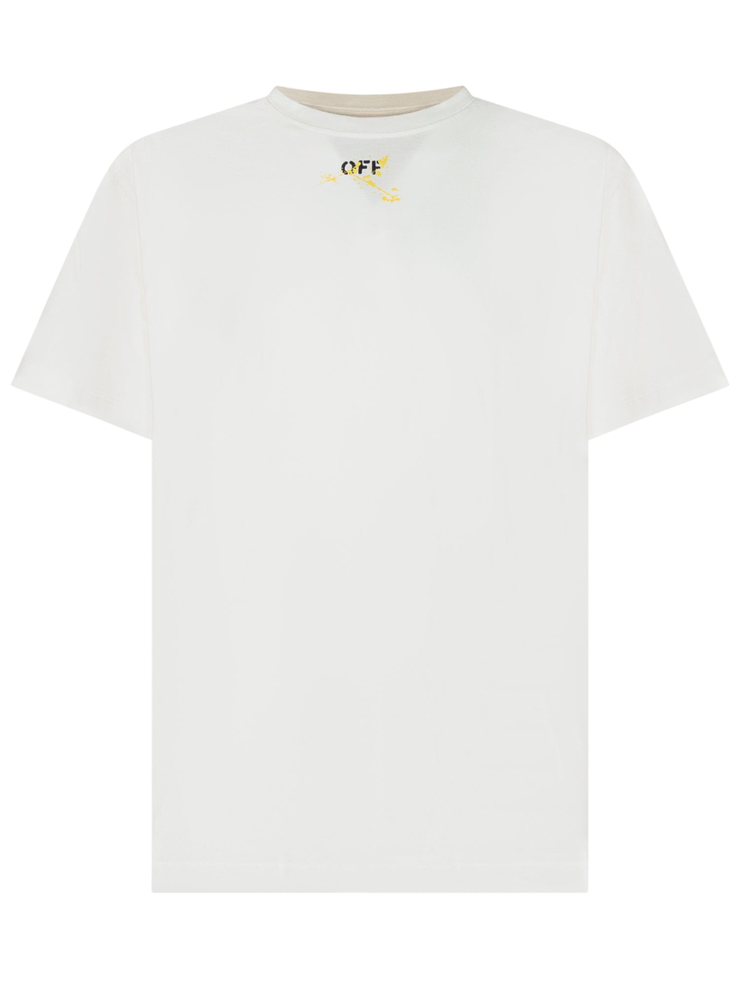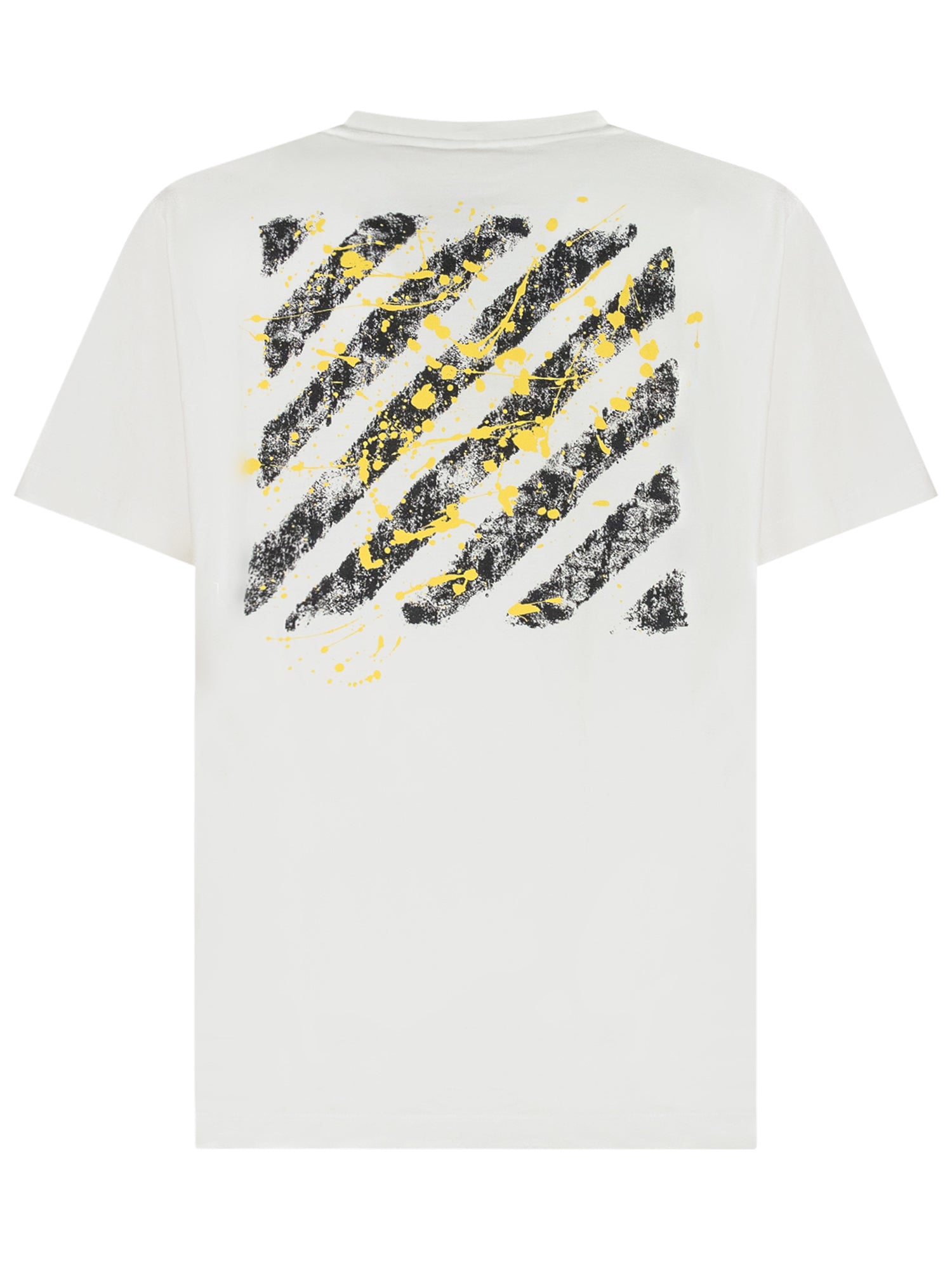 T-shirt bianca Off-White Kids in cotone con stampa OFF frontale e grafica a righe effetto graffiti sul retro nei toni nero e giallo.