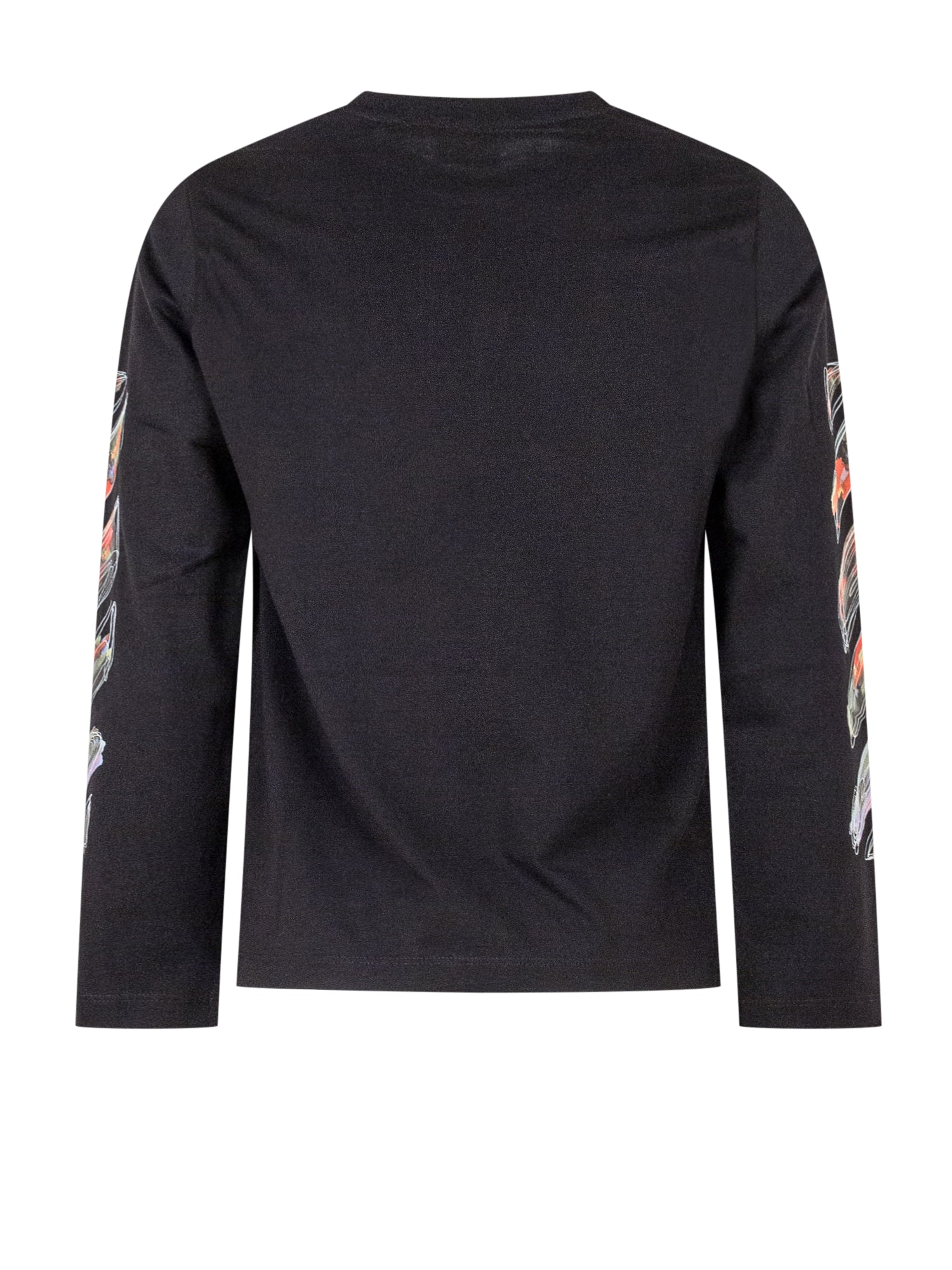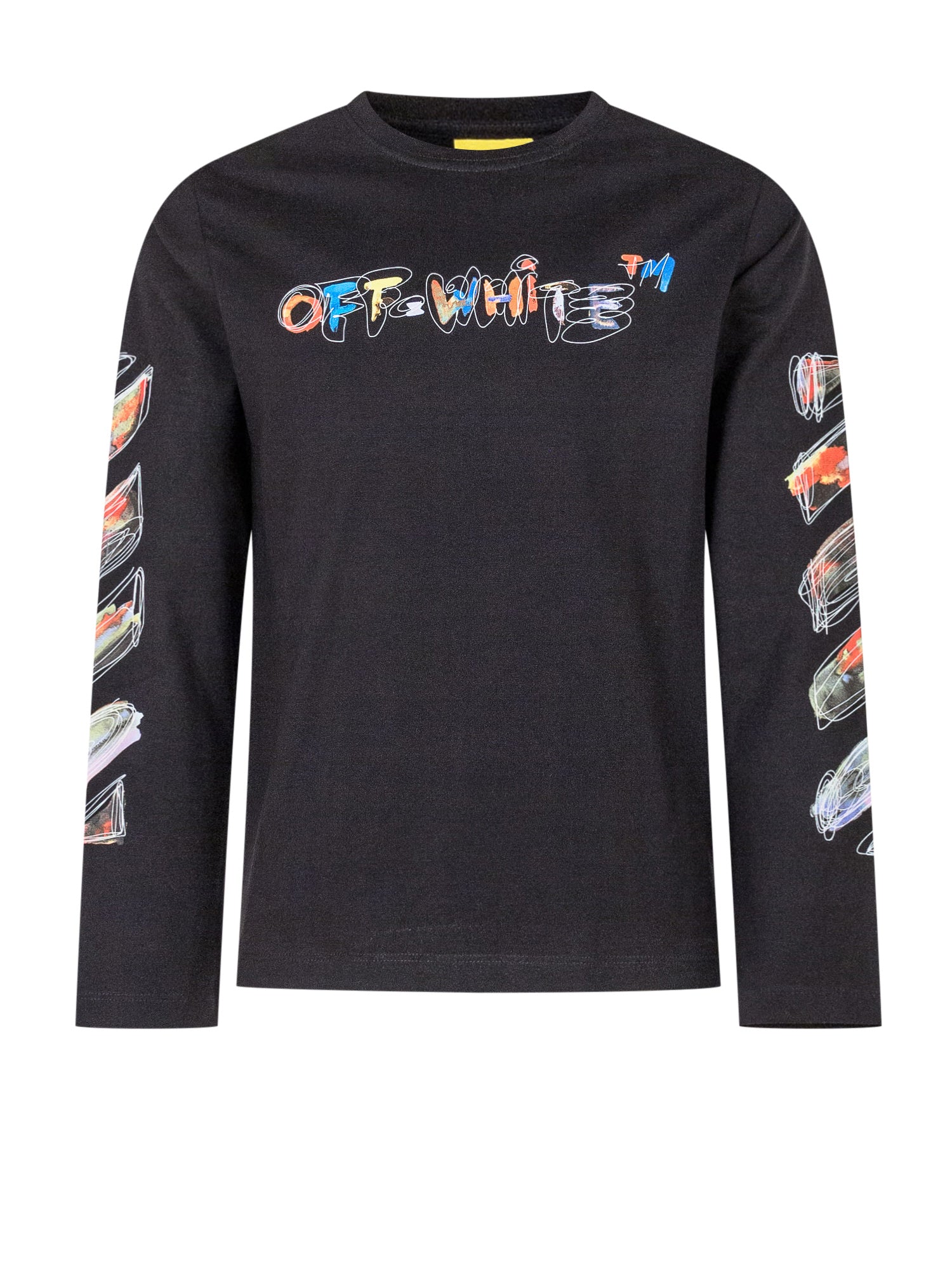 T-shirt nera a maniche lunghe Off-White Kids in cotone con logo multicolor effetto graffiti sul davanti e sulle maniche.