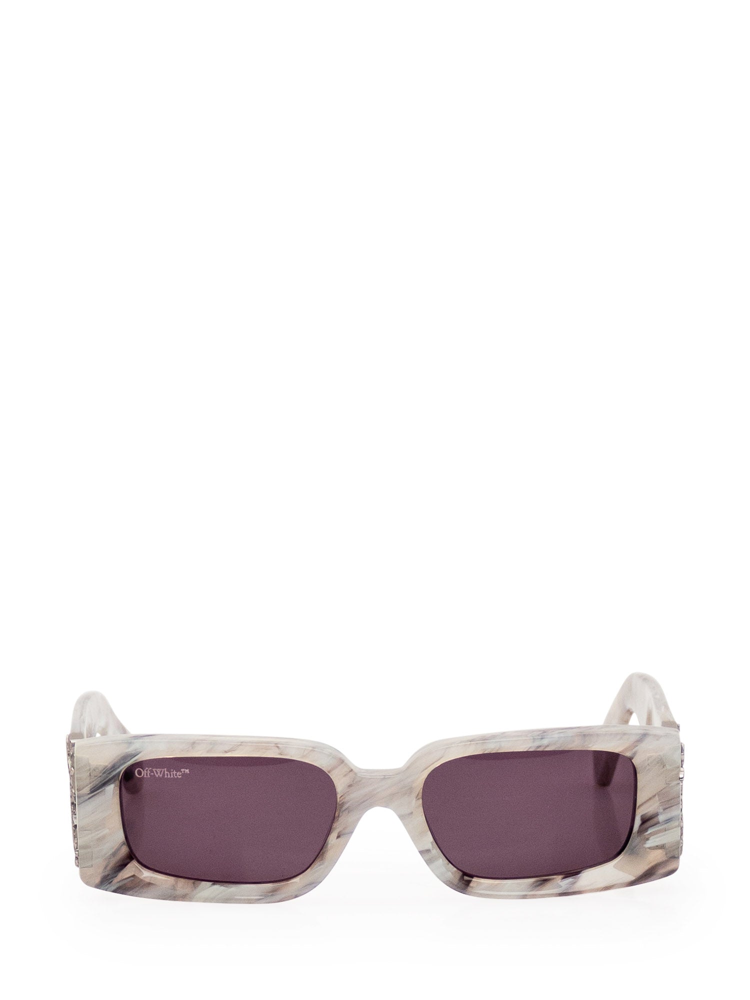 Occhiali da sole grigi con effetto marmo. Montatura rettangolare con motivo Arrow sui lati. Lenti scure.
