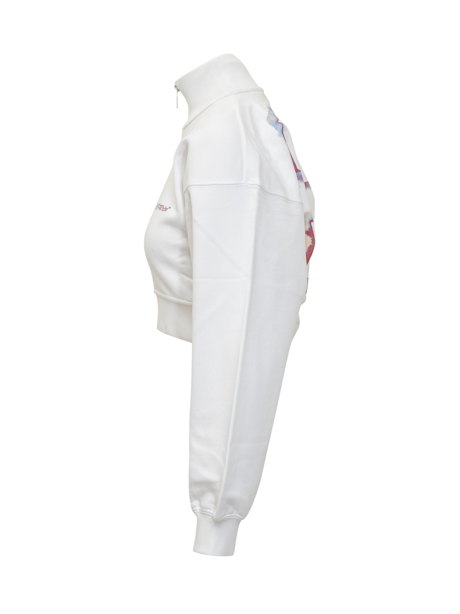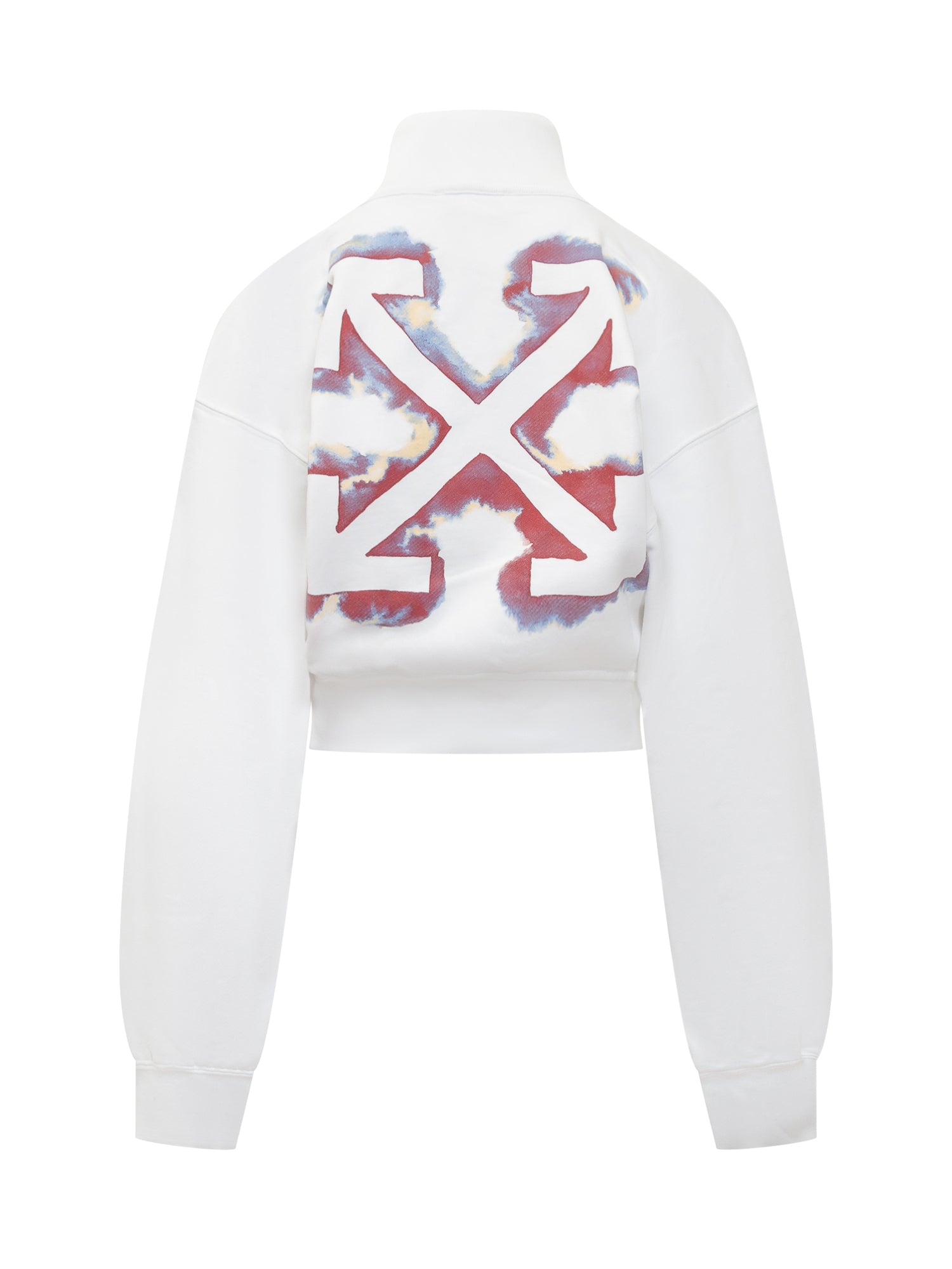 Felpa crop bianca Off-White con chiusura a zip, collo alto e logo frontale ricamato. Sul retro, iconica stampa Arrow effetto nuvola.