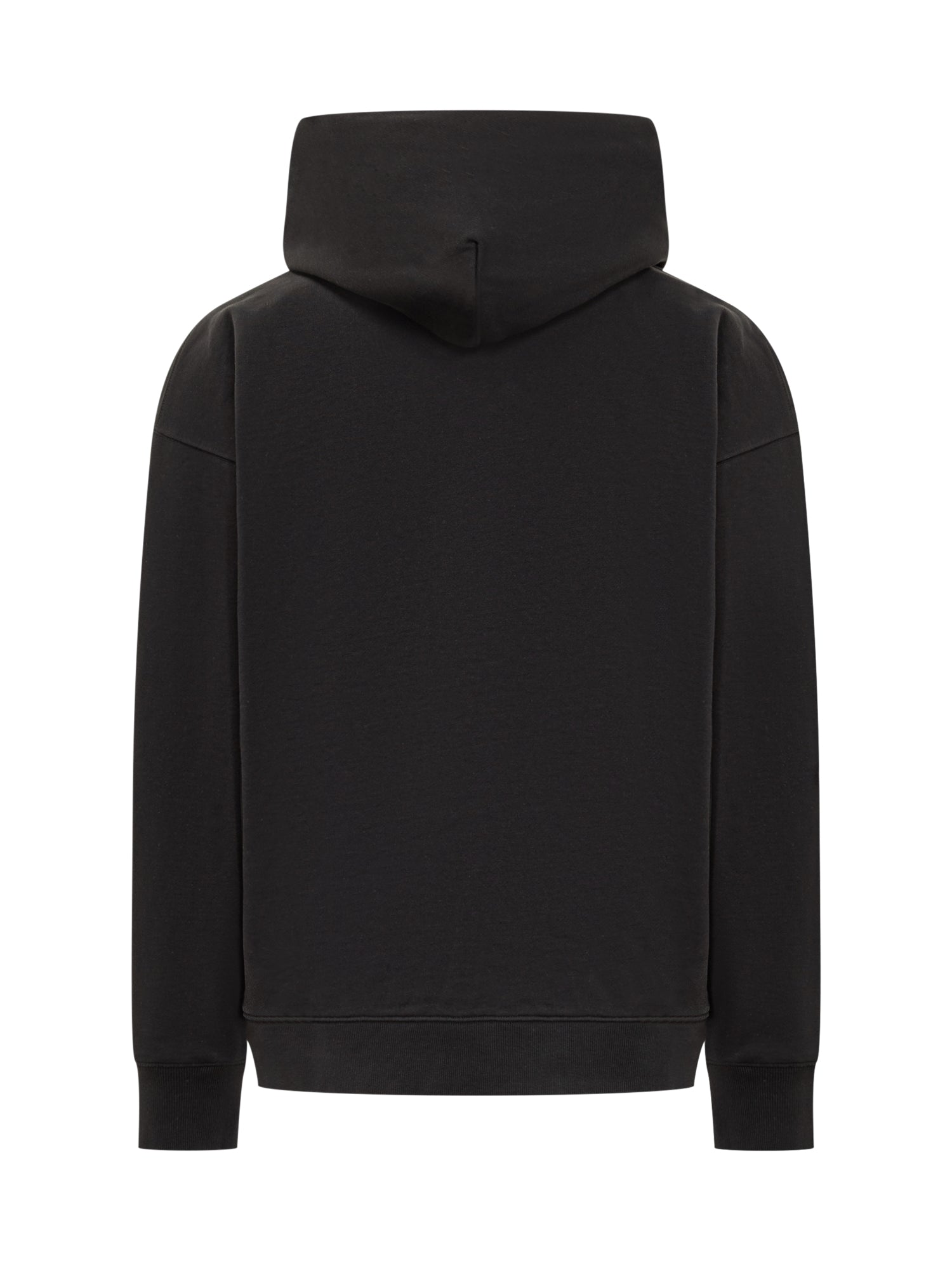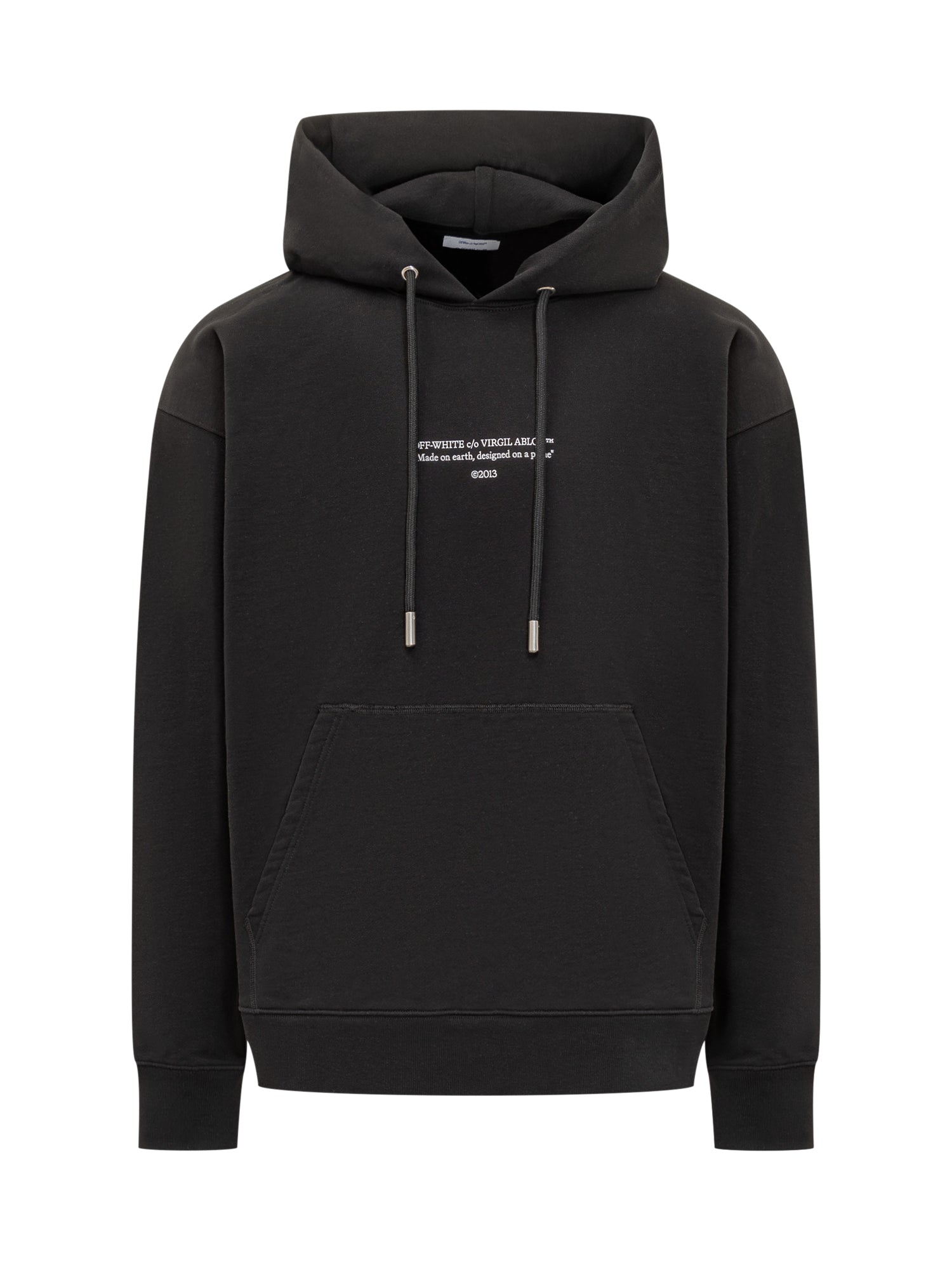 Felpa nera con cappuccio Off-White in cotone, caratterizzata da tasca a marsupio e stampa logo testuale sul petto.
