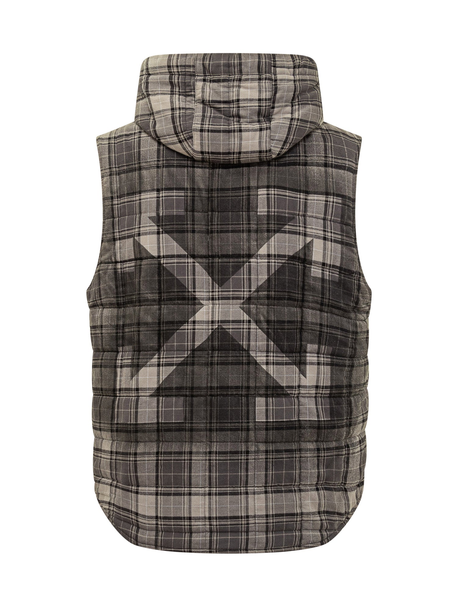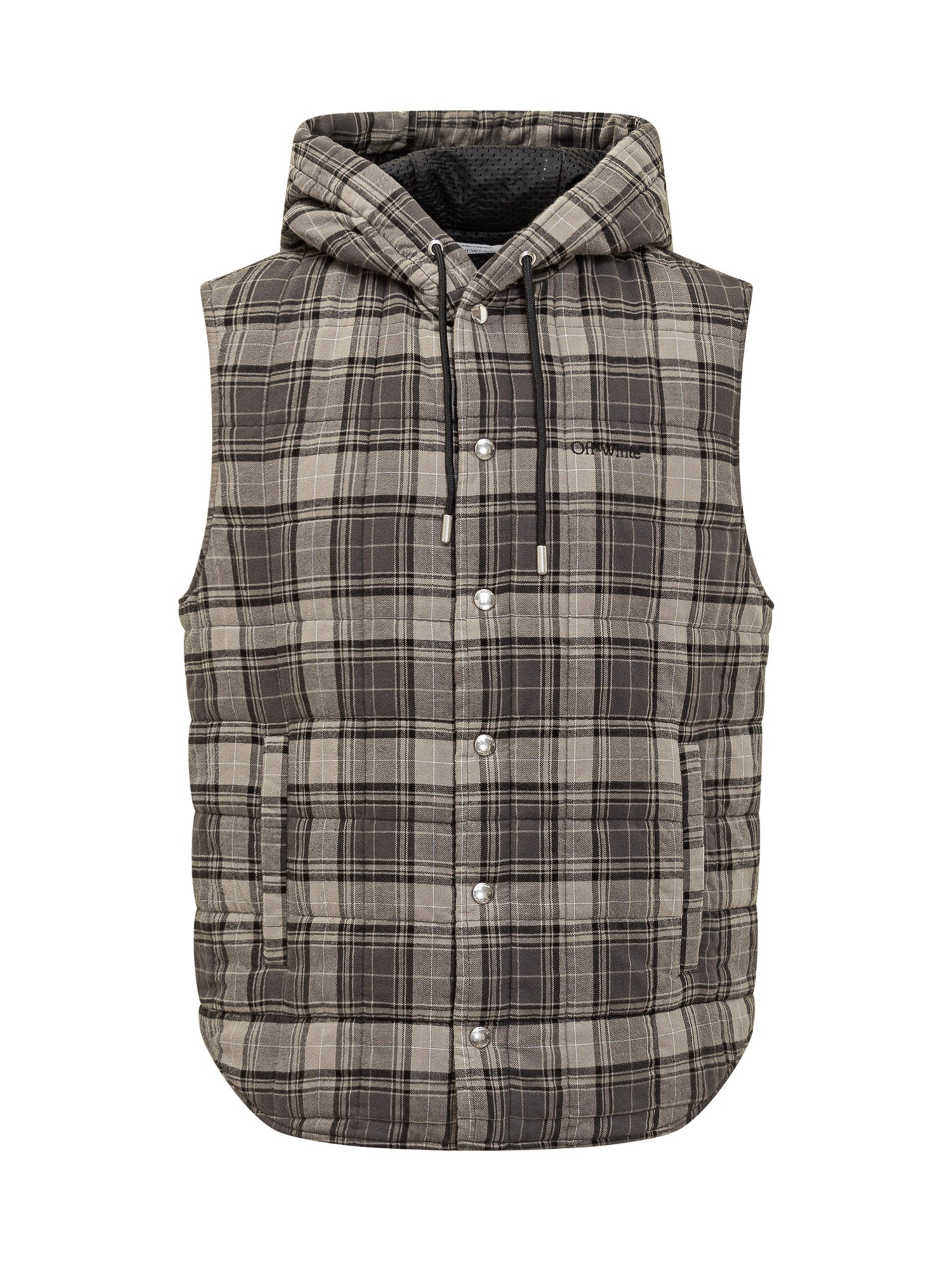 Gilet Off-White imbottito in tessuto a quadri beige e nero con cappuccio regolabile e chiusura a bottoni automatici.