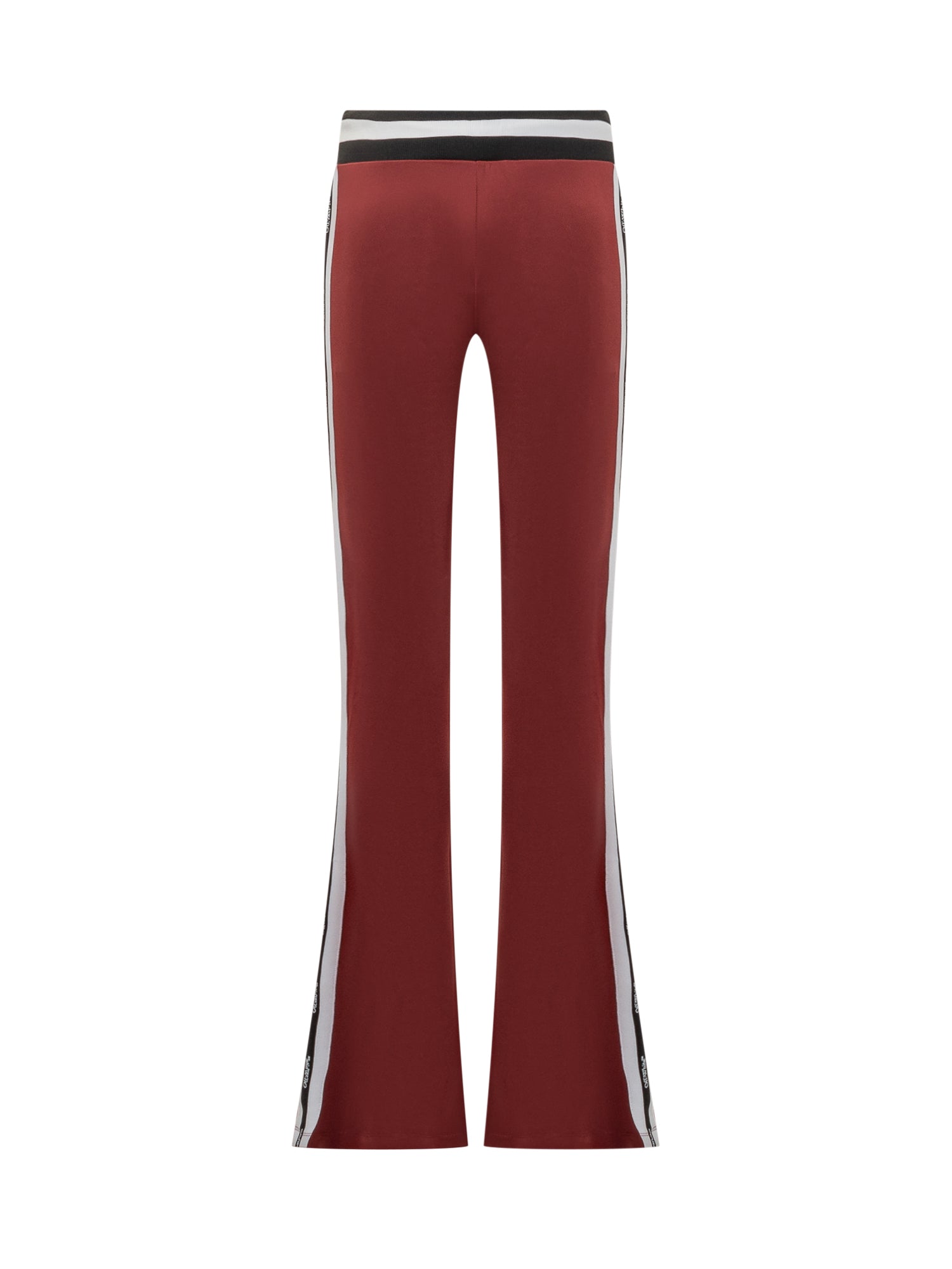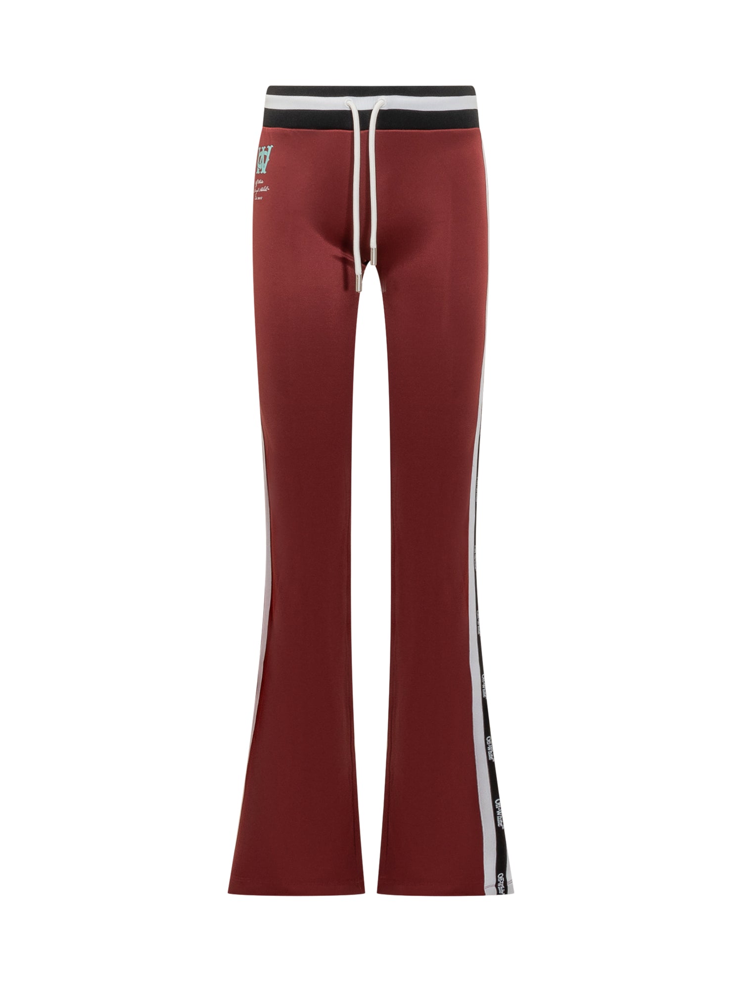 Pantaloni Off-White rossi in tessuto tecnico con coulisse in vita, bande laterali e linea svasata.