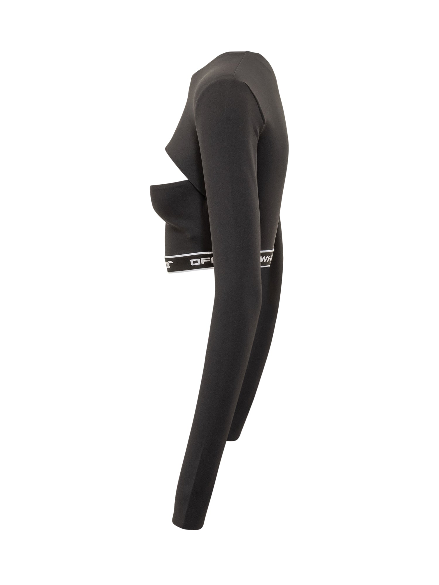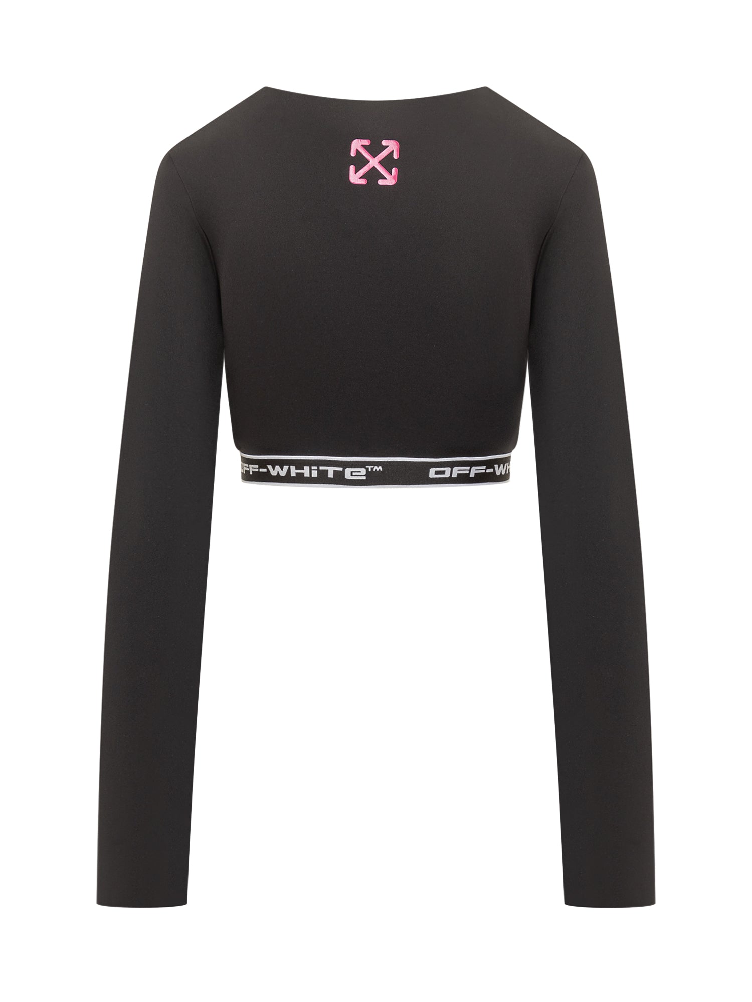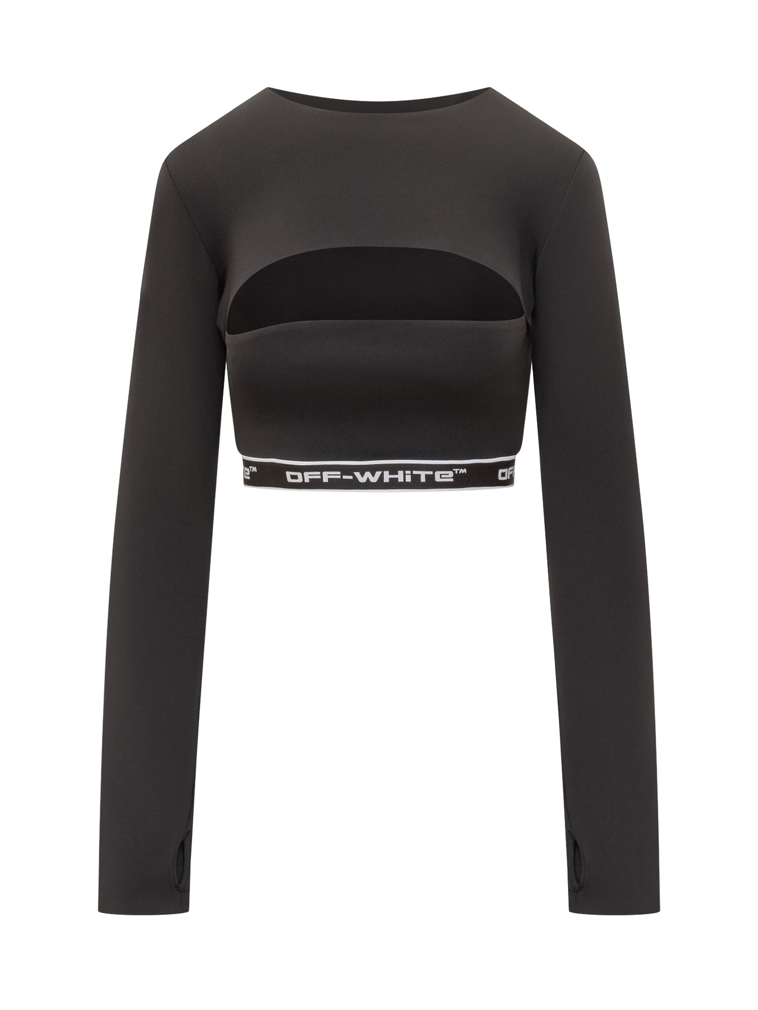 Top nero a maniche lunghe Off-White con dettaglio cut out sul petto e fascia elastica logata. Realizzato in tessuto tecnico, unisce stile audace e comfort sportivo.