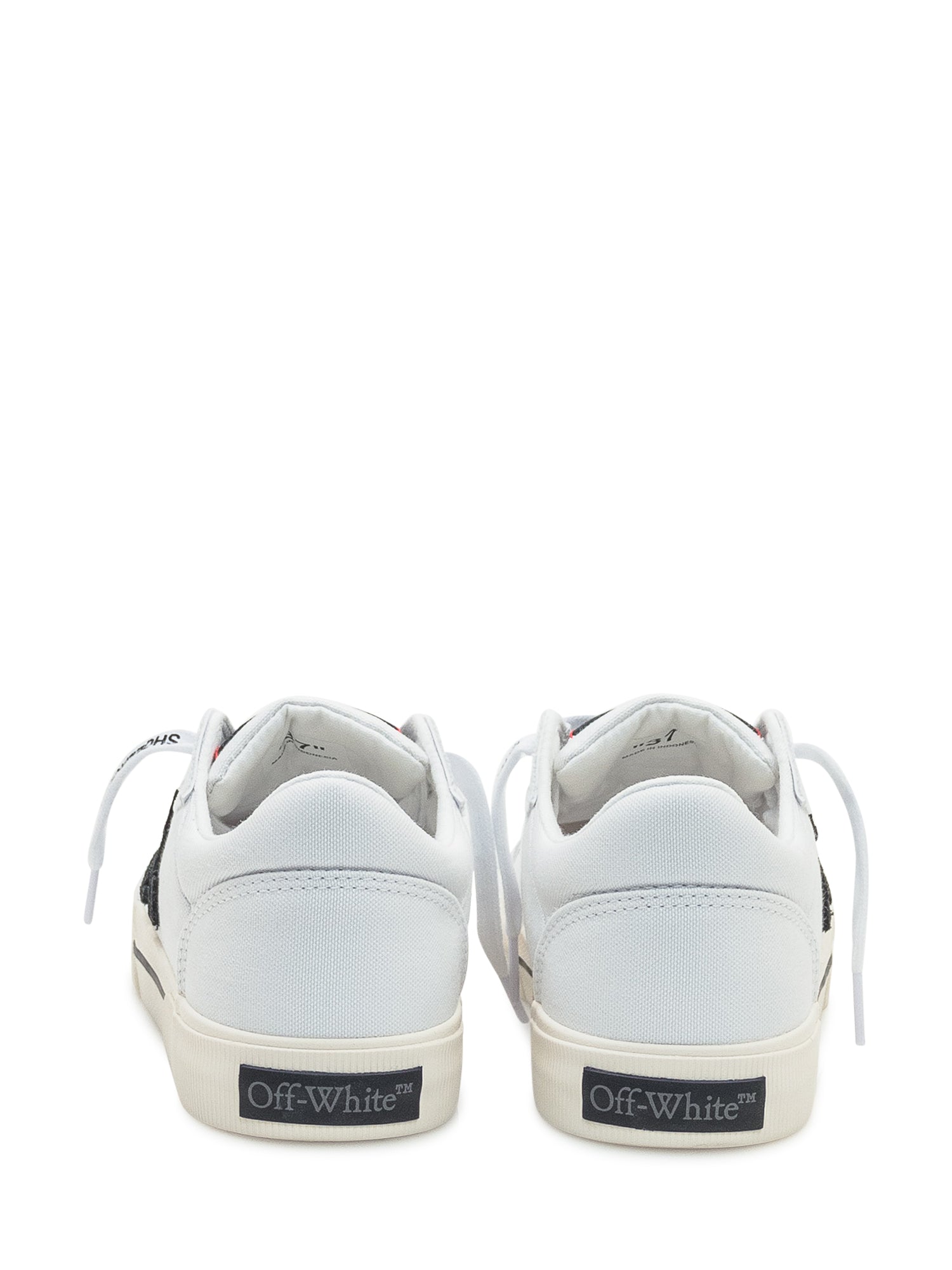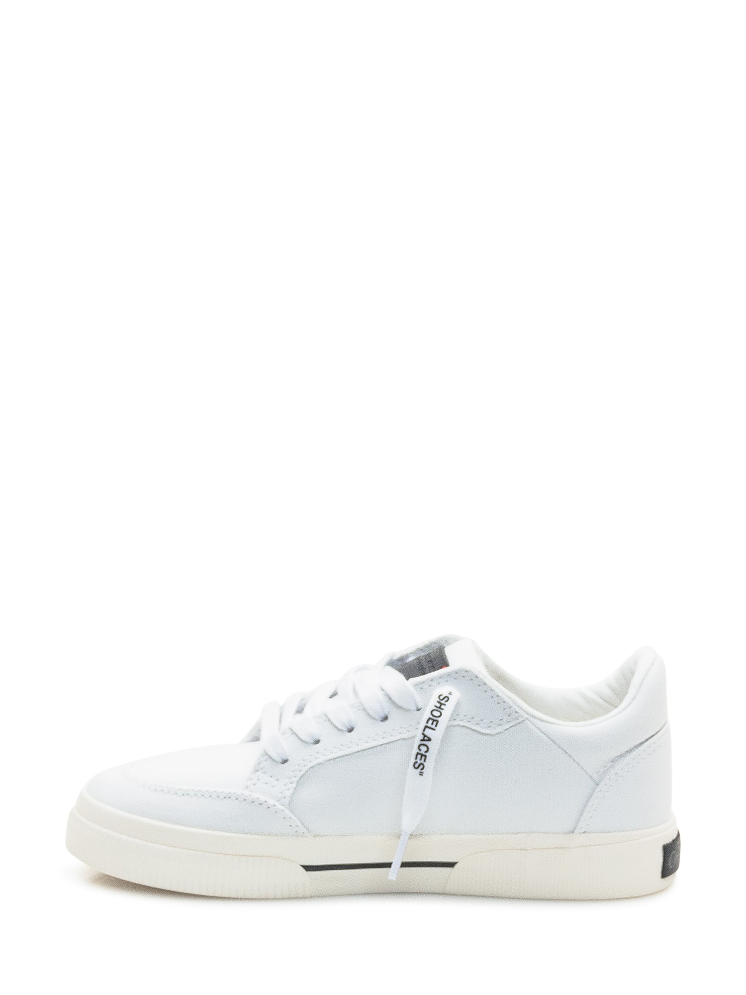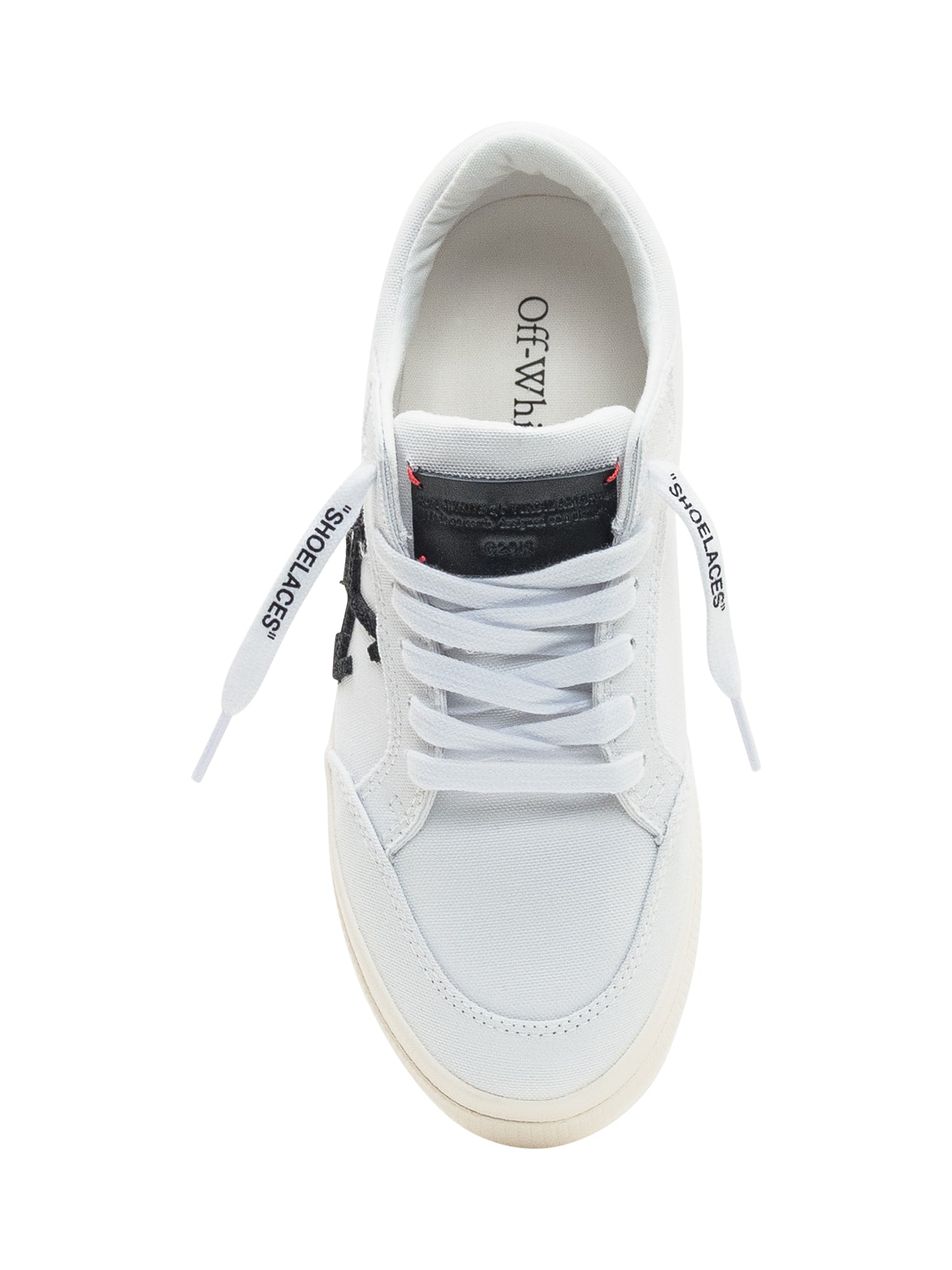 Sneakers Off-White in tela bianca con iconica freccia nera ricamata sul lato e lacci con scritta stampata.
