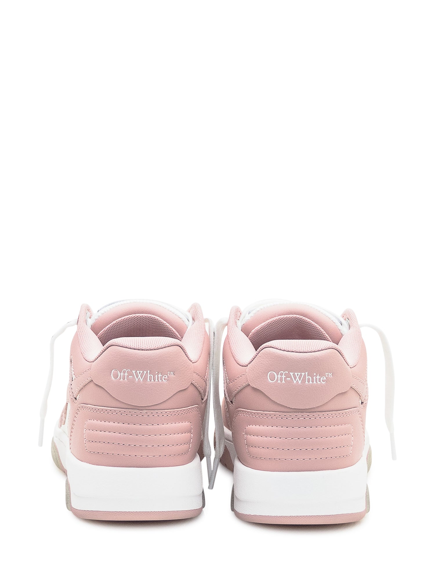 Sneakers Off-White in pelle rosa e bianca con iconica freccia laterale, linguetta con etichetta e dettagli con lacci stampati.