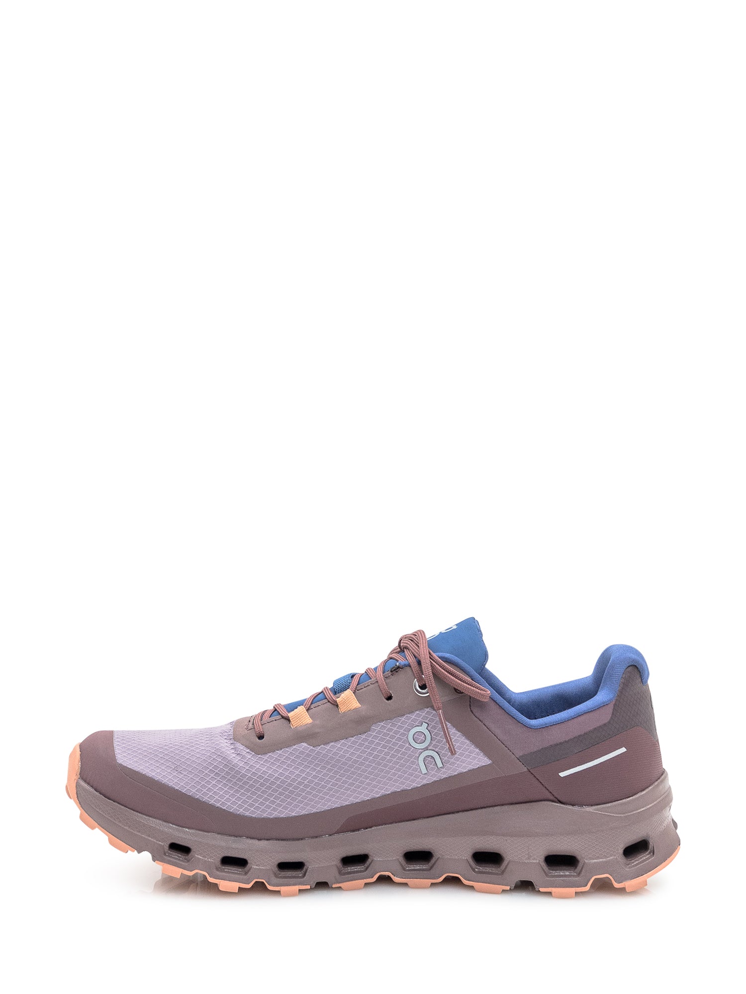 Sneakers On Cloudvista Waterproof in tessuto tecnico lilla e marrone con dettagli blu. Impermeabili e leggere, garantiscono comfort e trazione ottimale su ogni terreno. Ideali per trail e outdoor.
