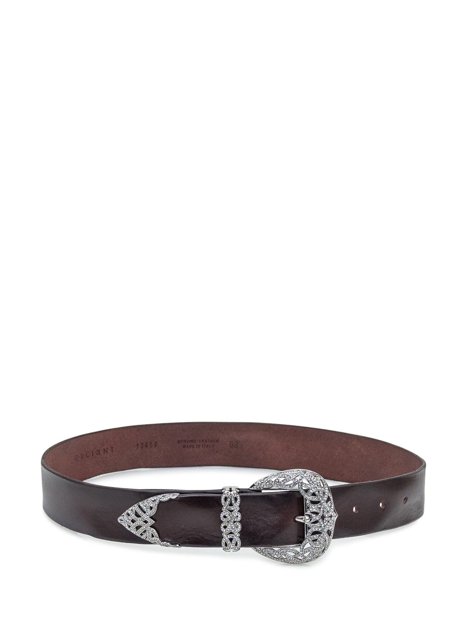 Cintura Orciani in pelle marrone, arricchita da una fibbia gioiello dal design ricercato.