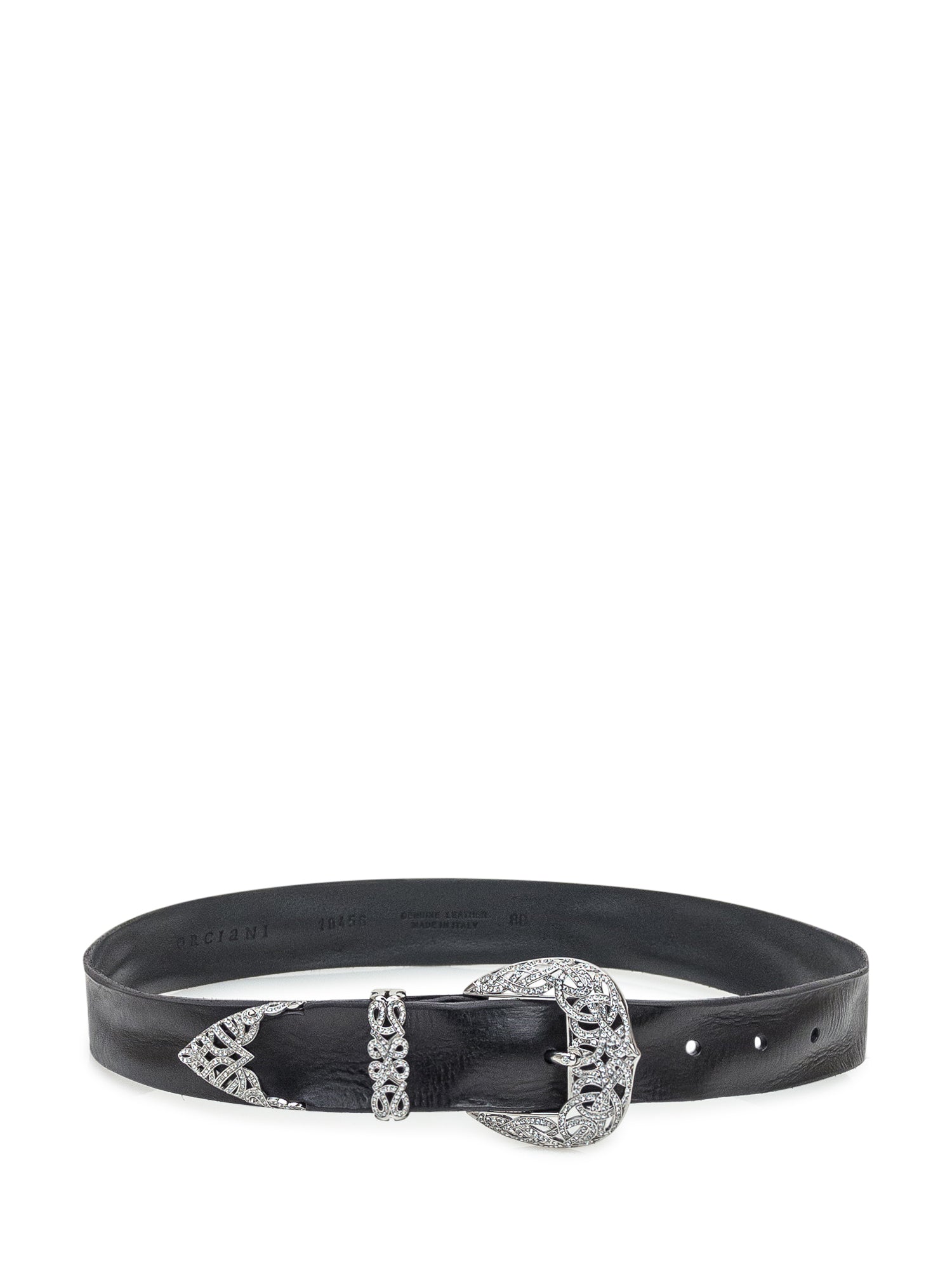 Cintura Orciani in pelle nera, caratterizzata da una fibbia decorata in stile gioiello.