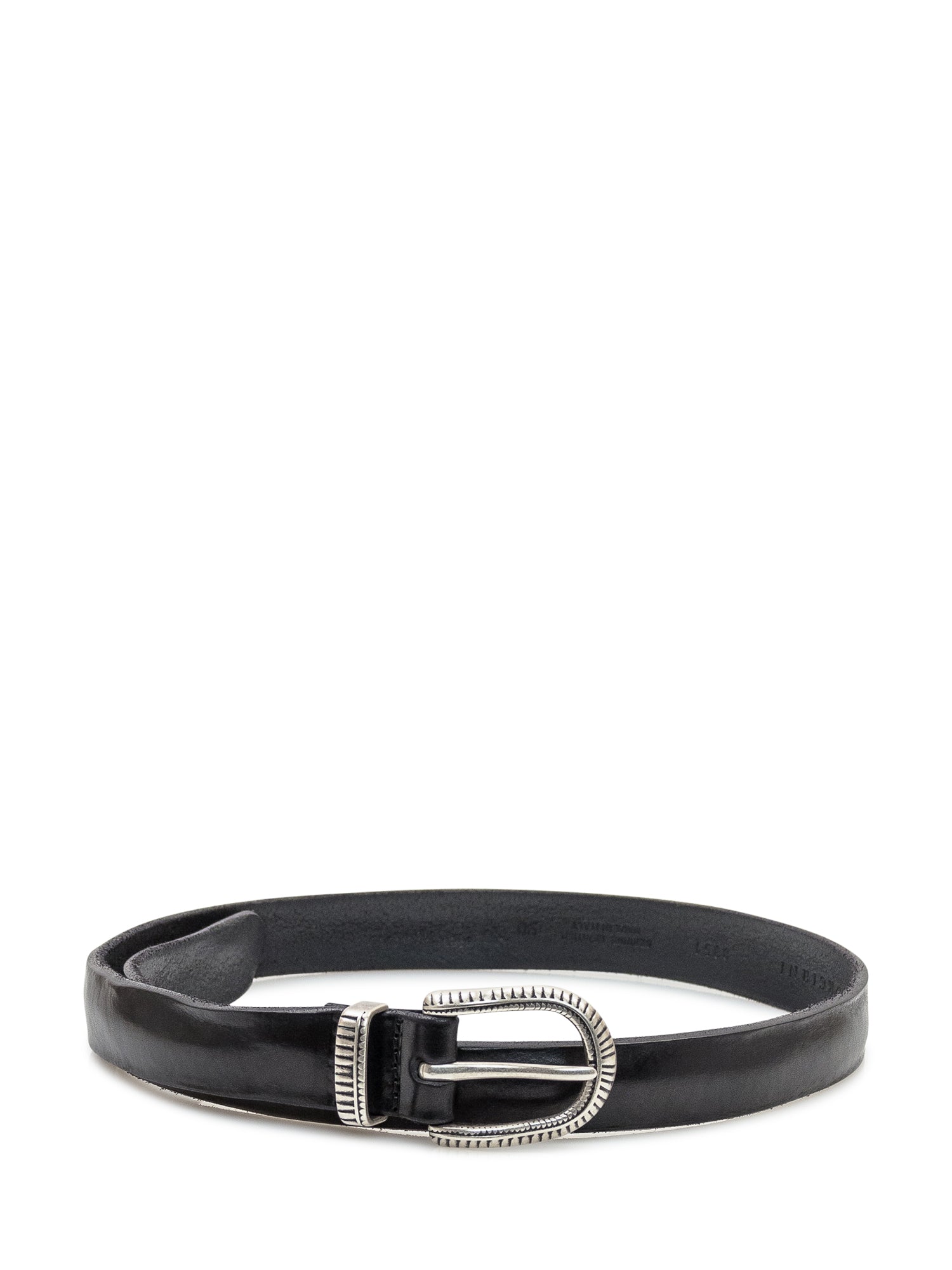 Cintura Orciani in pelle nera con fibbia decorata in metallo argentato.