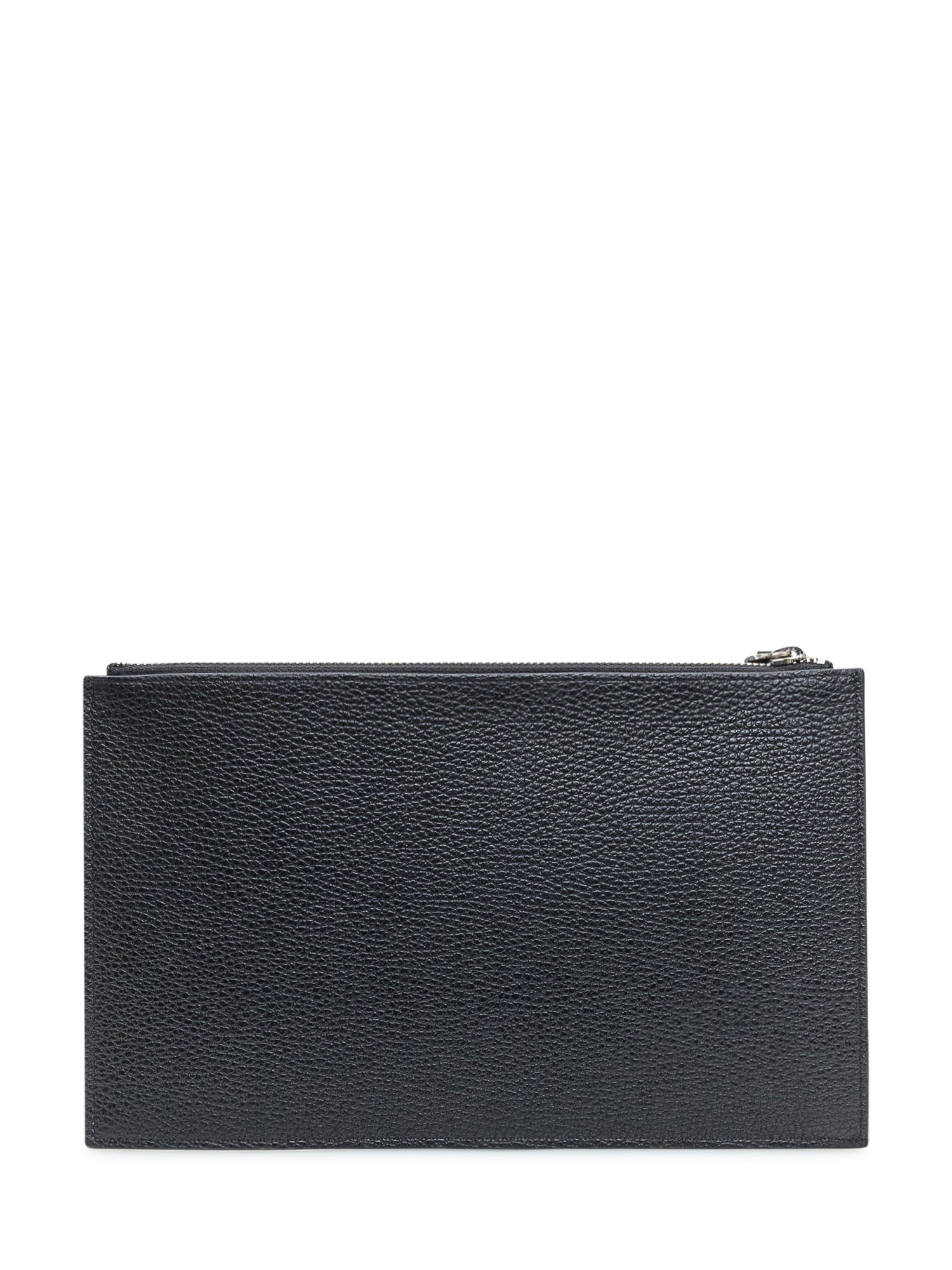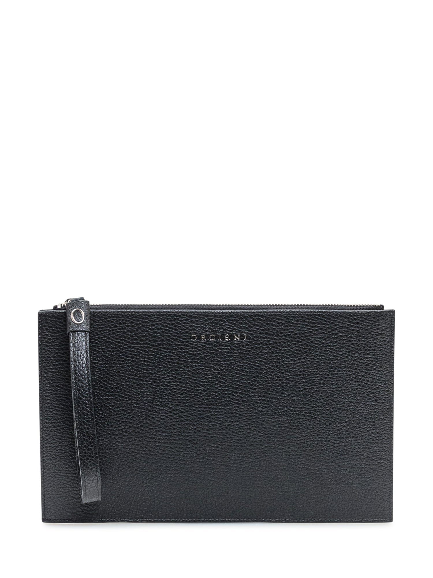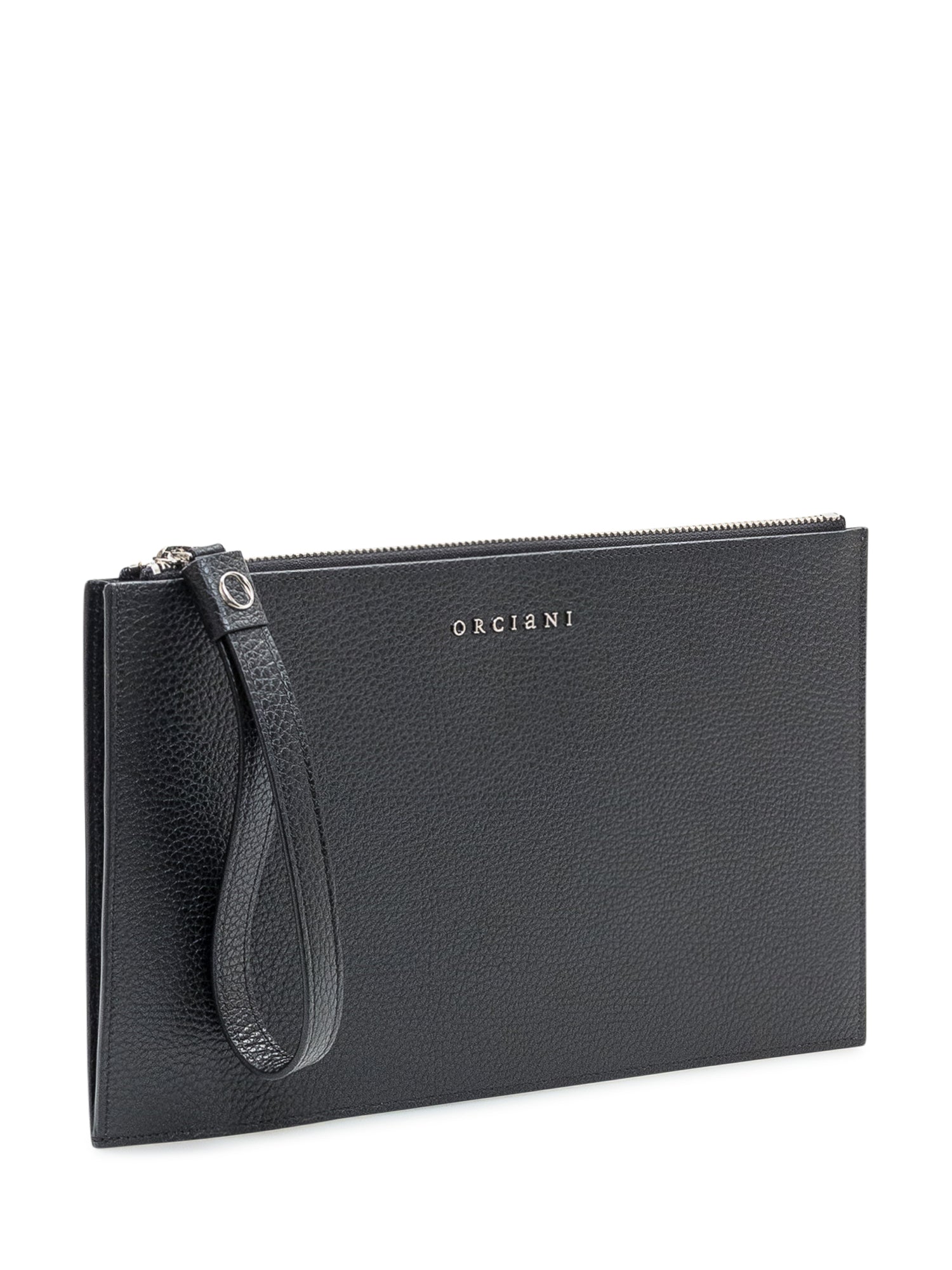 Pochette Orciani in pelle martellata nera con chiusura a zip e cinturino da polso. Linee pulite ed eleganti per un accessorio pratico e raffinato.