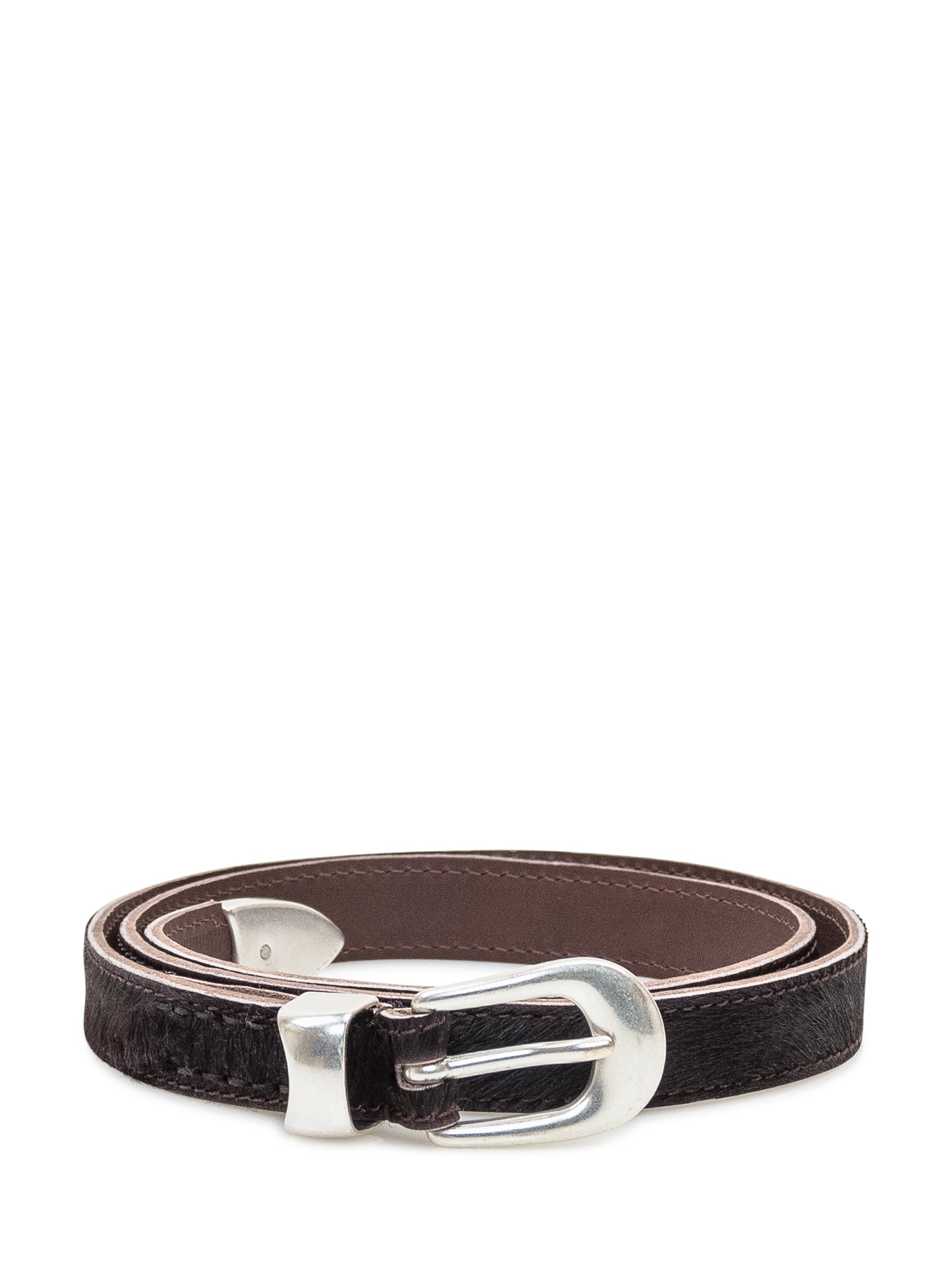 Cintura Our Legacy in pelle nera con texture effetto pelo e fibbia in metallo lucido.
