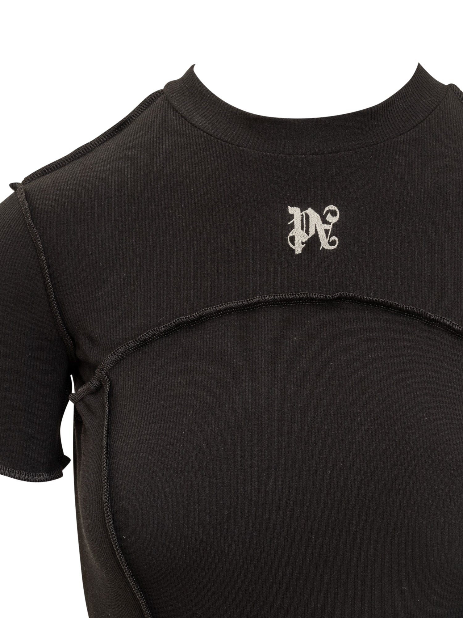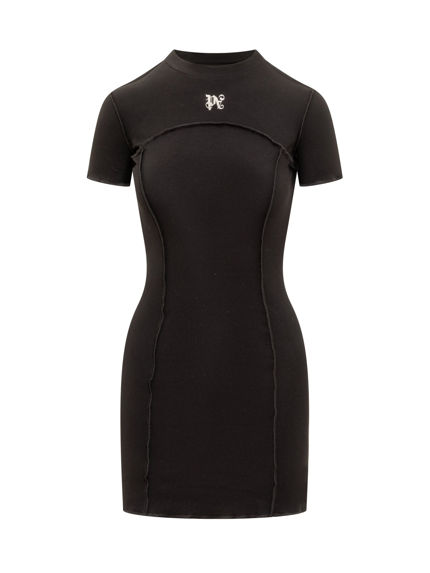 Abito midi a maniche corte in jersey di cotone a costine. Collo alto. Schiena nuda. Cuciture-decoro. Monogram PA ricamato sul davanti.