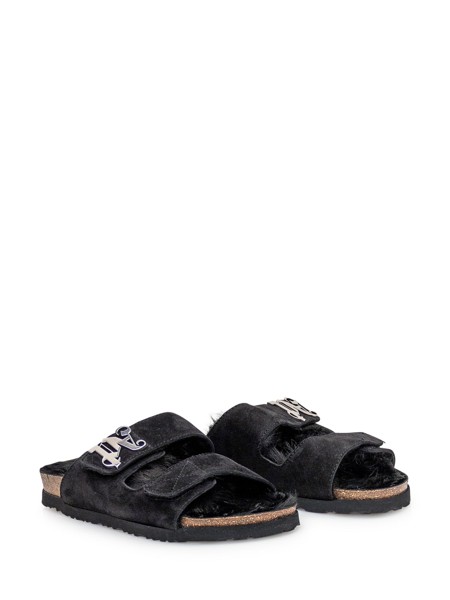 Ciabatta nera. Chiusura a strappo. Interno pelliciia. Logo metallizzato sulla prima fascia.