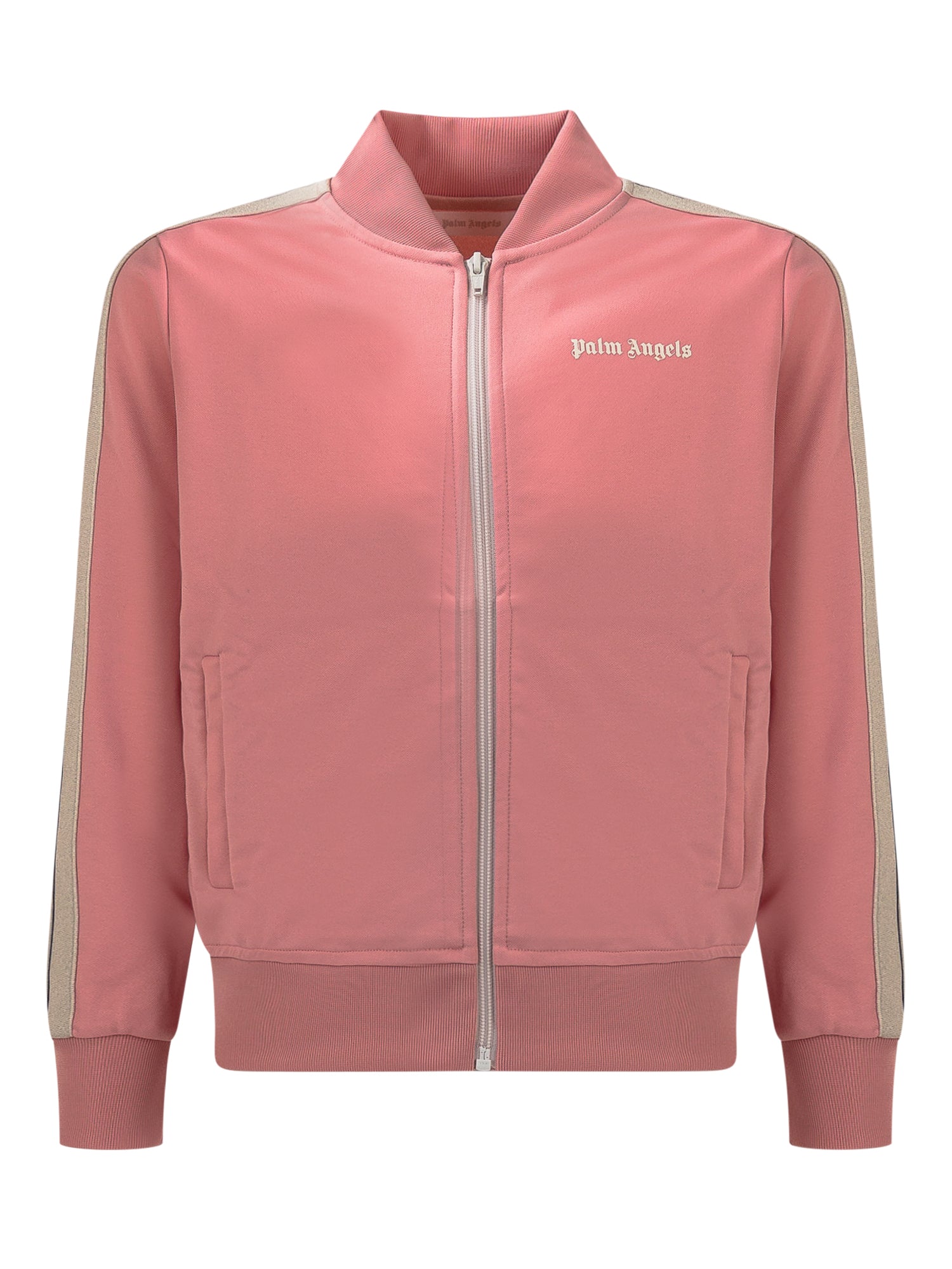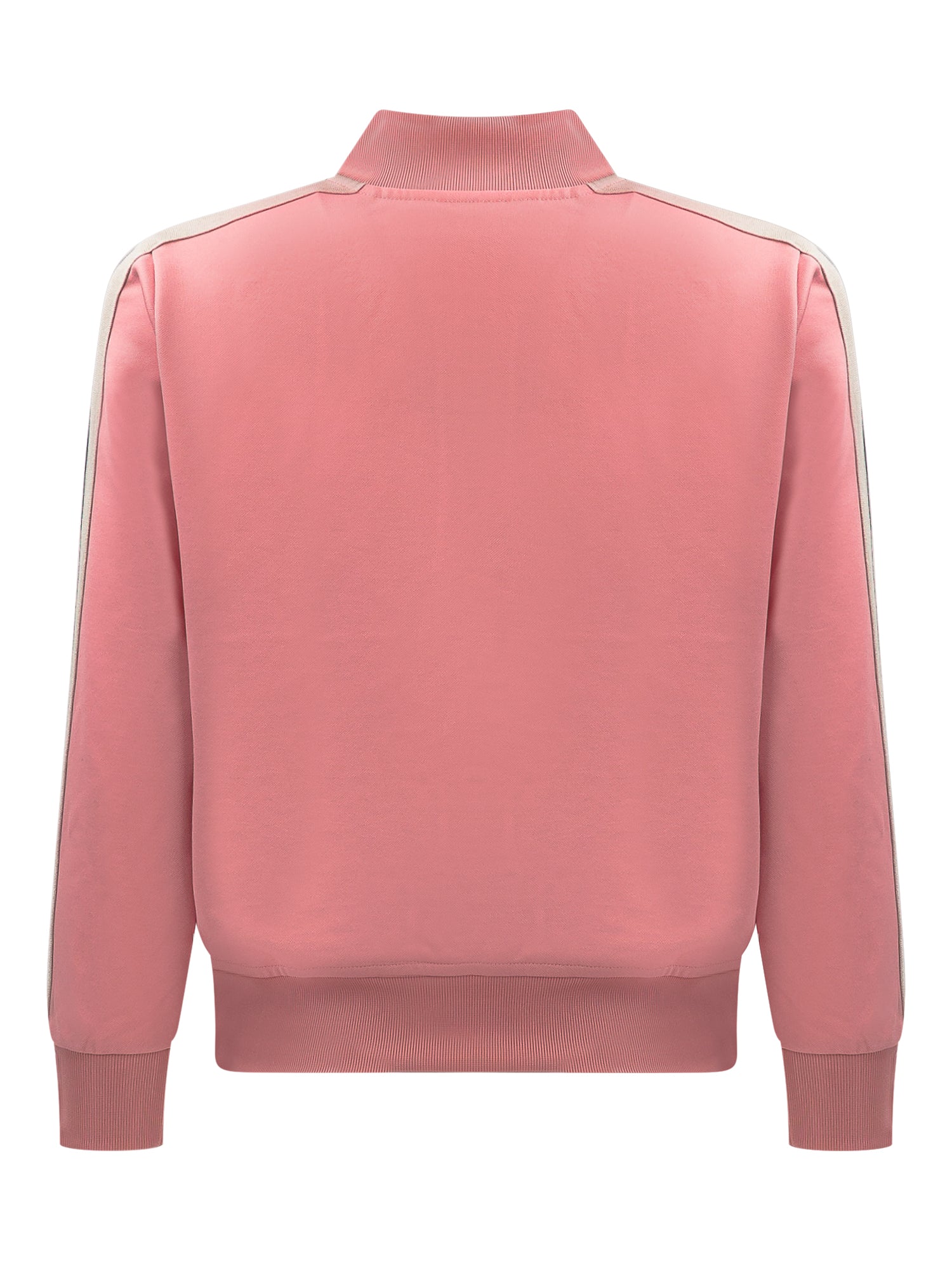 Felpa rosa a maniche lunghe. Collo e orlo a costine. Due tasche frontali. Chiusura con zip sul davanti. Bande laterali. Logo stampato sul davanti.