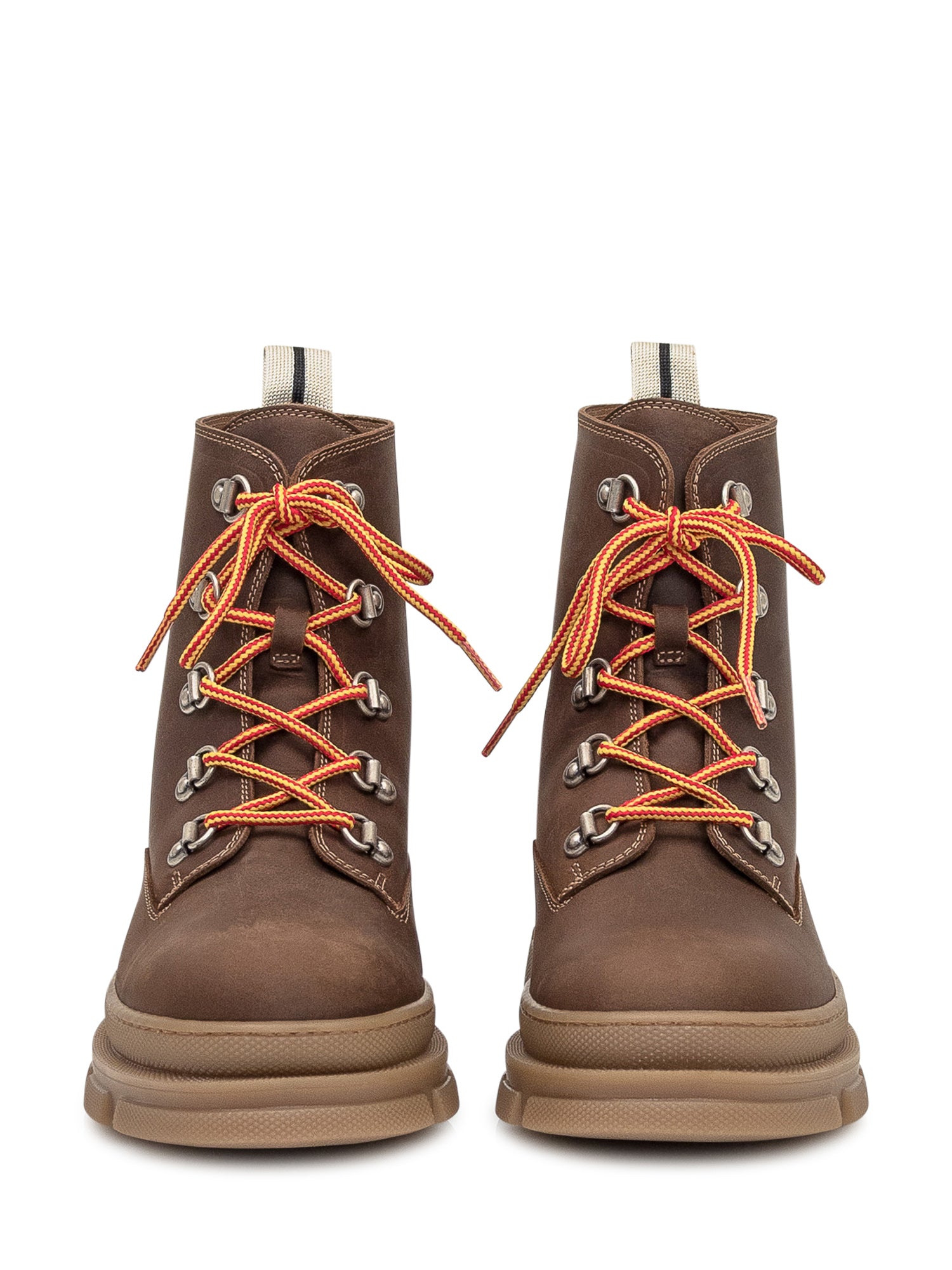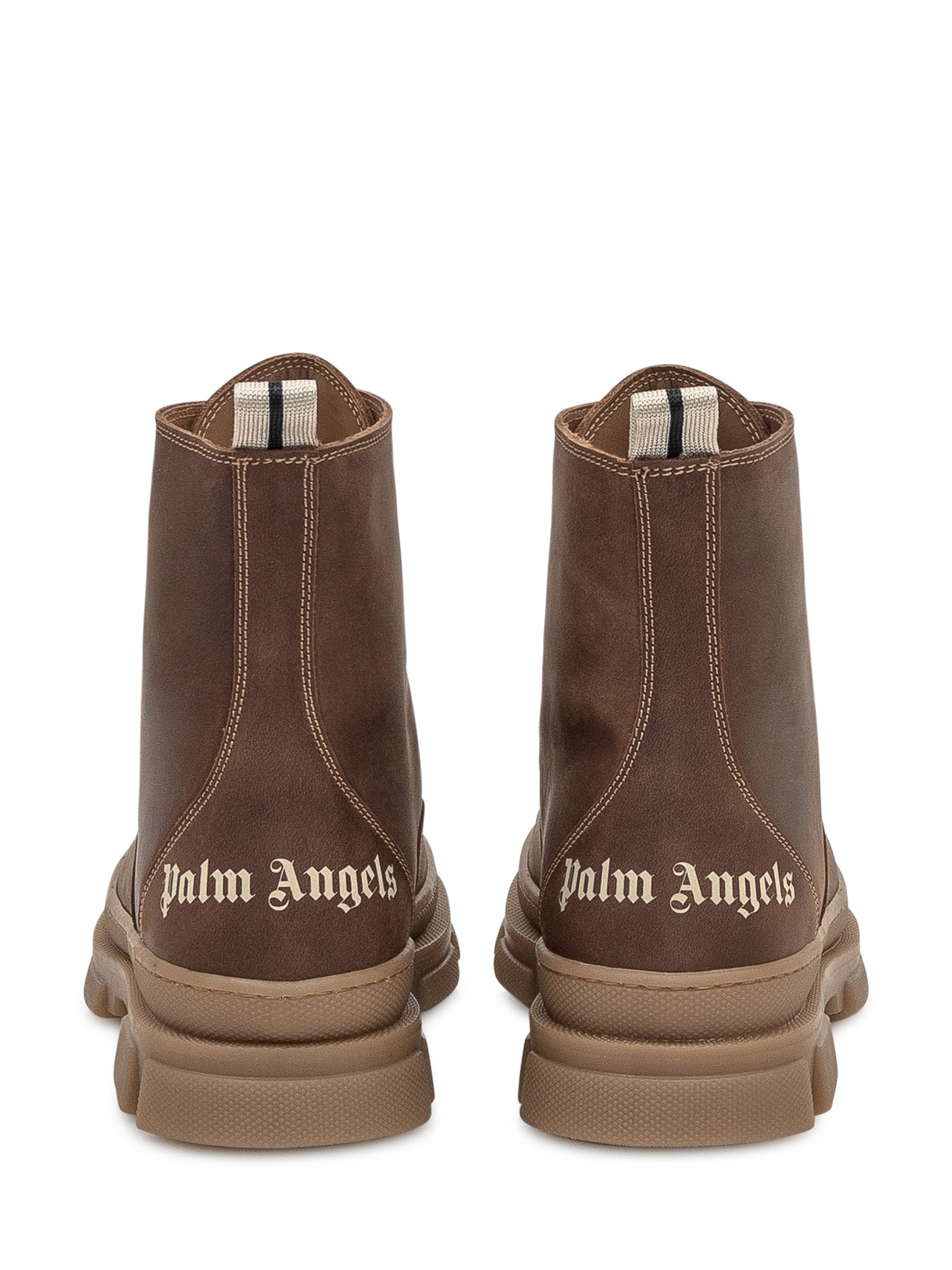 Anfibi Palm Angels Kids in pelle marrone con suola chunky e lacci arancioni a contrasto.