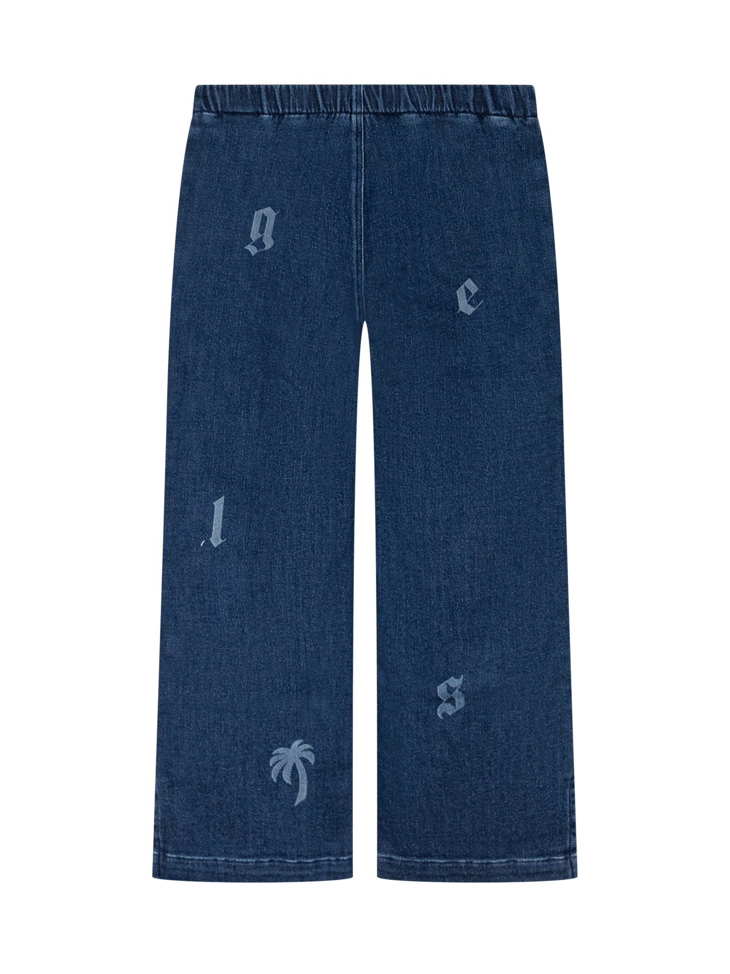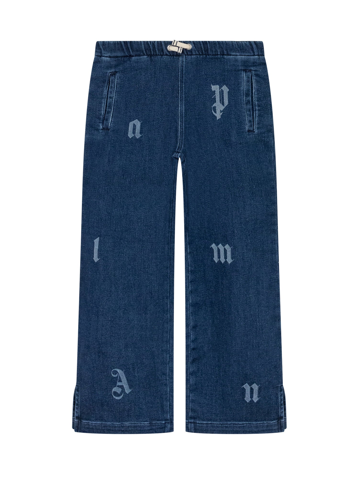 Pantaloni in denim Palm Angels Kids a gamba dritta con stampa lettere logo all-over. Vita elastica con coulisse e tasche laterali.