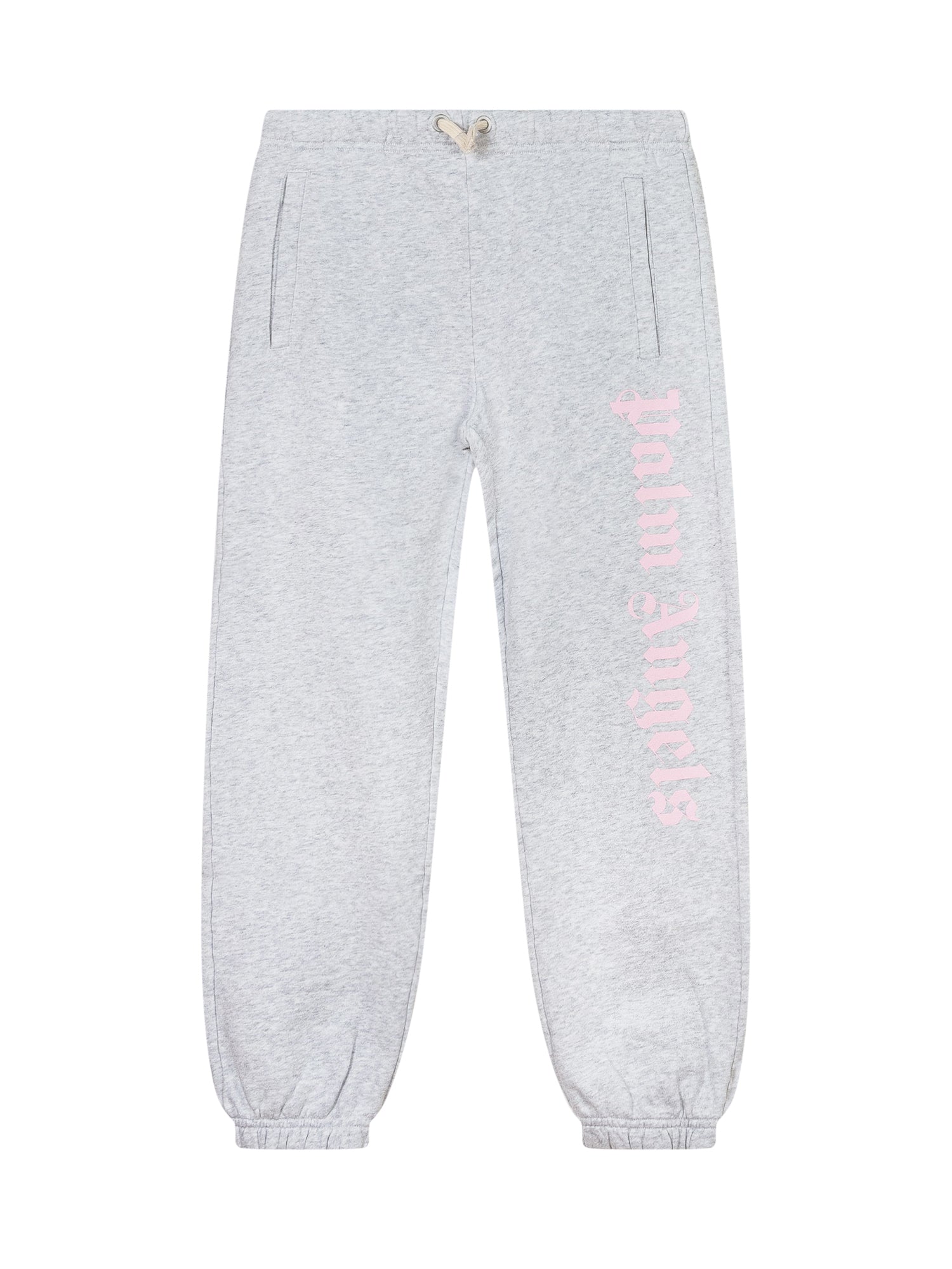 Pantaloni jogger Palm Angels Kids in cotone grigio melange con logo rosa a contrasto, vita regolabile e fondo elasticizzato.