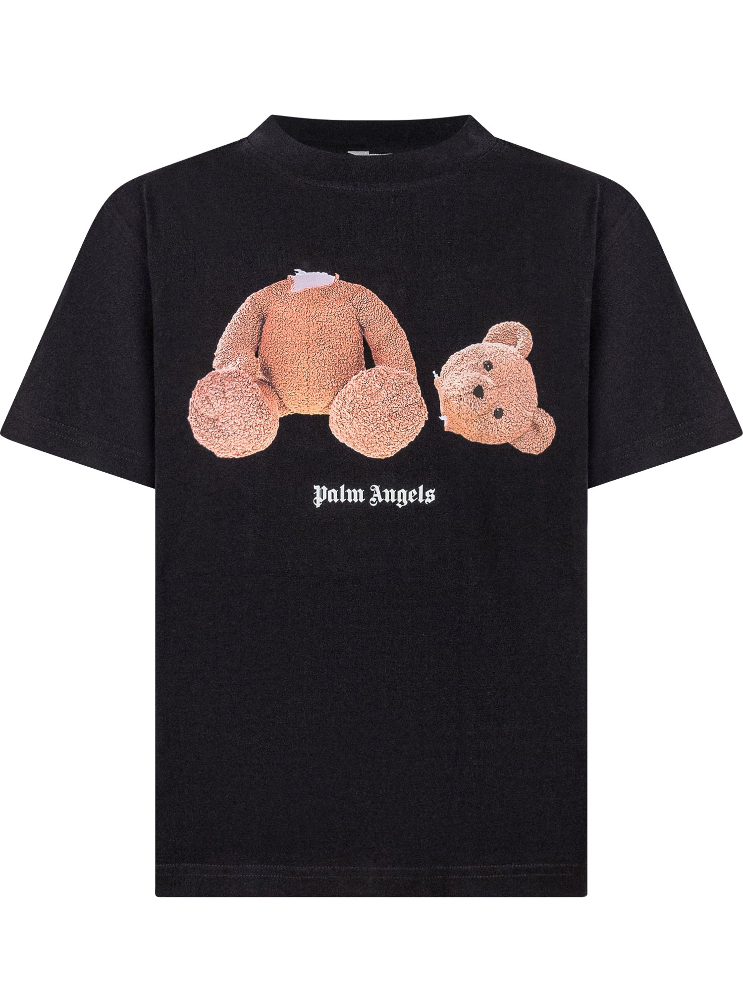 T-shirt Palm Angels Kids in cotone nero con iconica stampa teddy bear sul fronte e logo gotico.