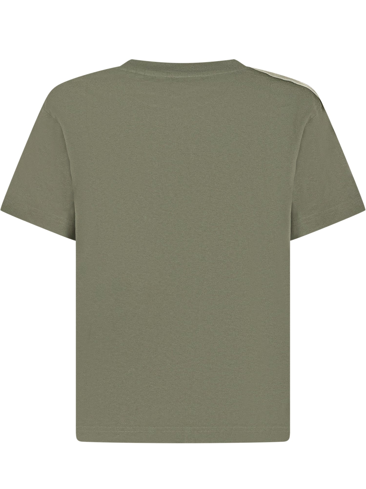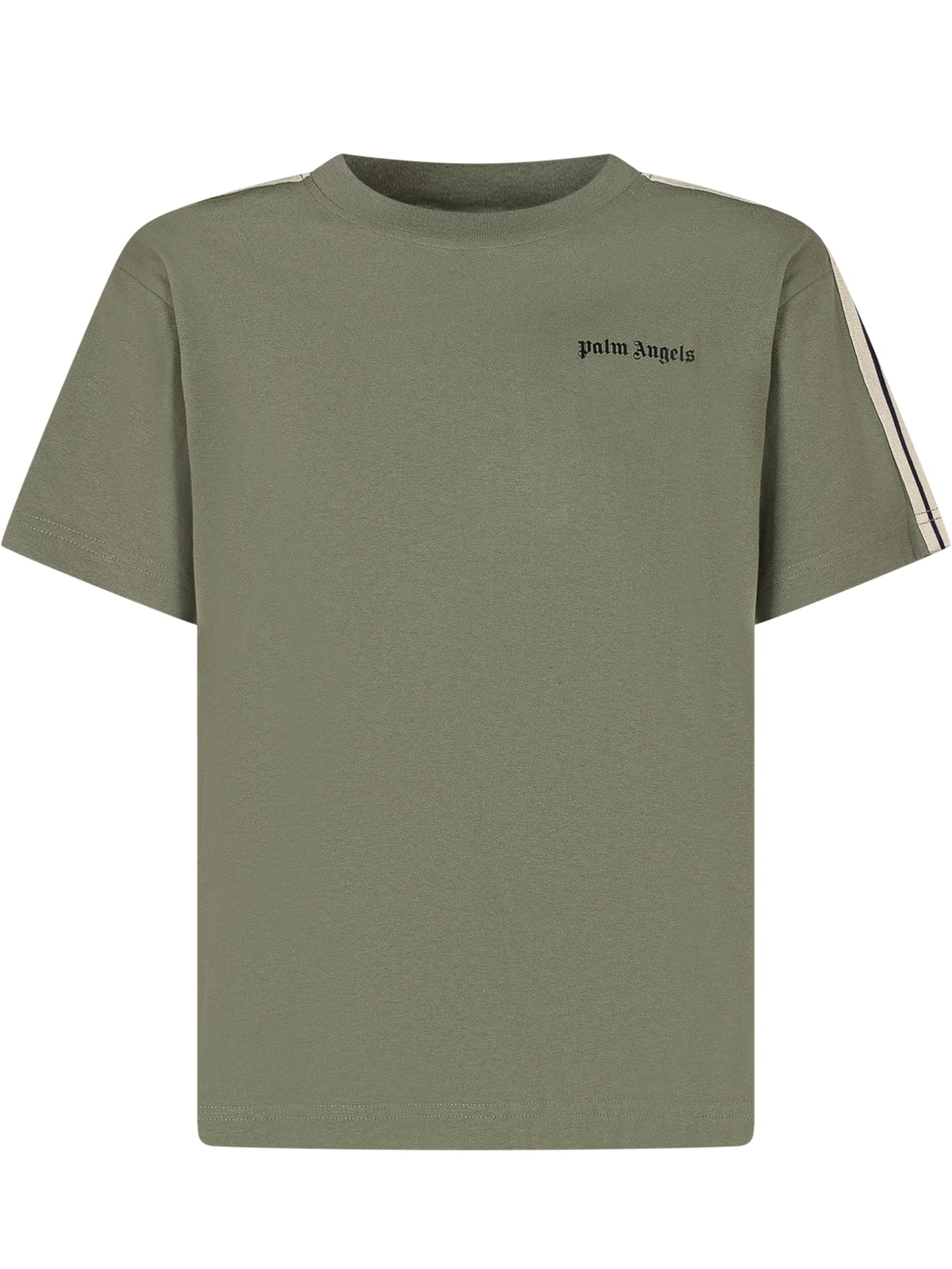 T-shirt Palm Angels Kids in cotone verde con logo ricamato sul petto e bande a contrasto lungo le maniche.