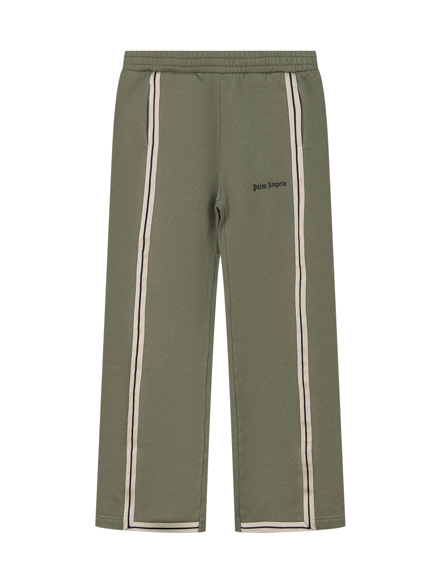 Pantaloni Palm Angels verdi con bande laterali a contrasto e logo stampato. Realizzati in cotone con vestibilità relaxed e vita elasticizzata.