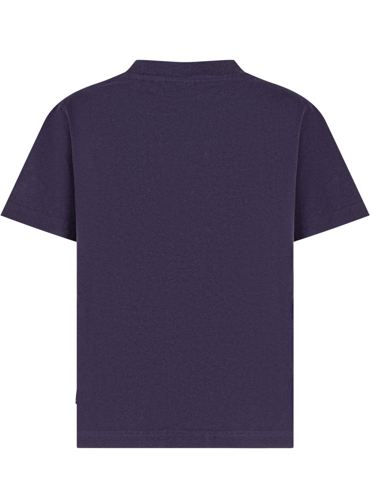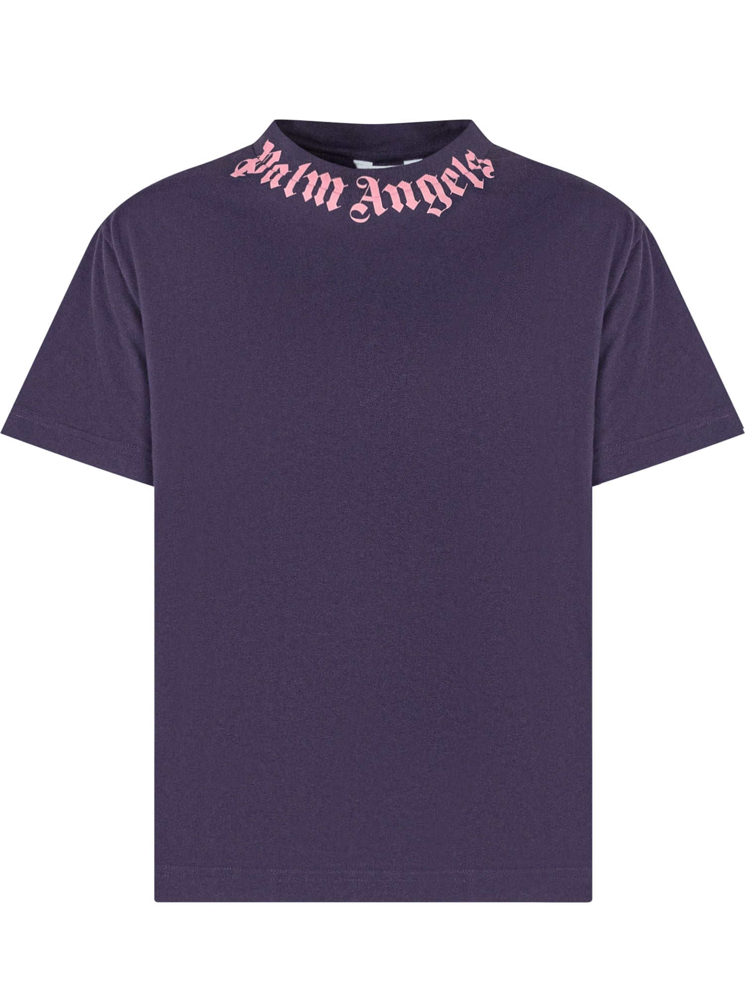 T-shirt Palm Angels in cotone viola con logo rosa stampato sul collo. Linea minimal e vestibilità regolare.