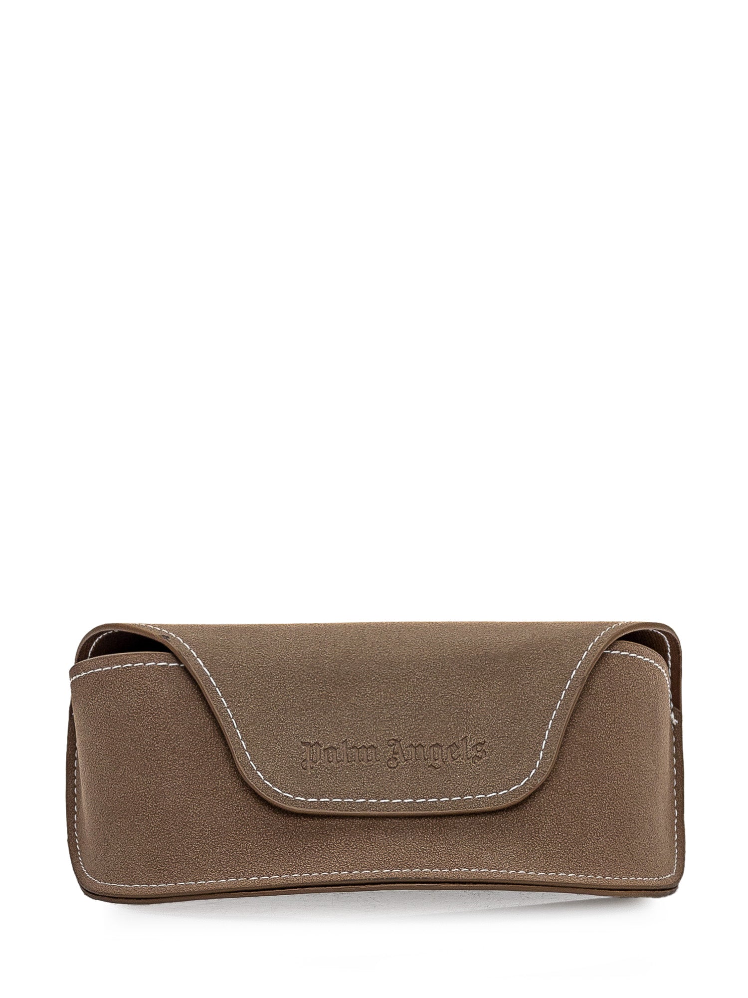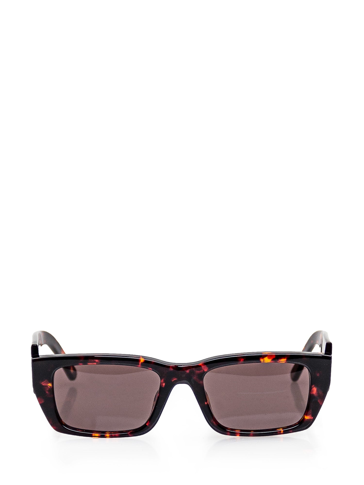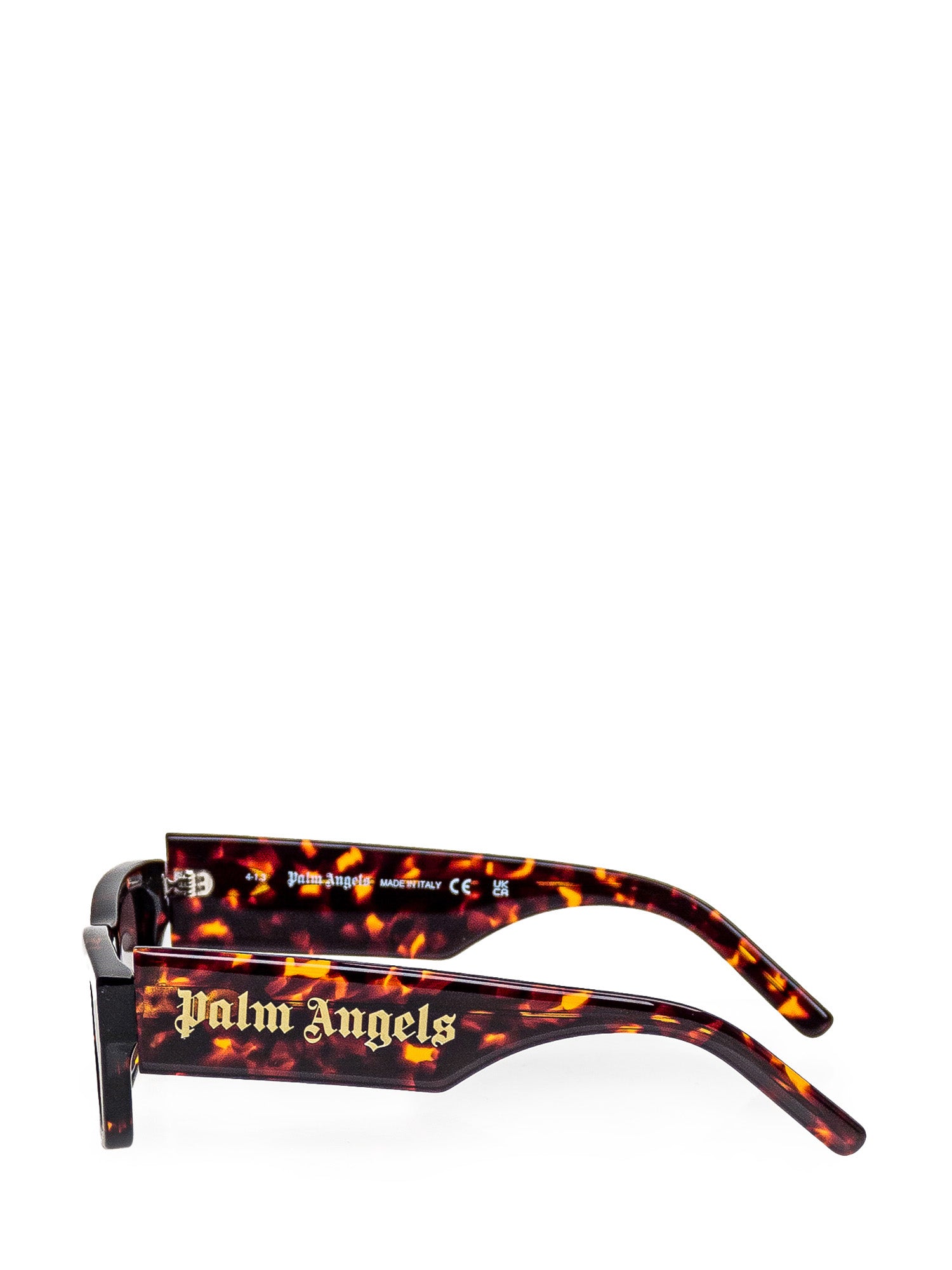 Occhiali da sole con montatura rettangolare. Lenti scure. Logo dorato stampato sul lato.