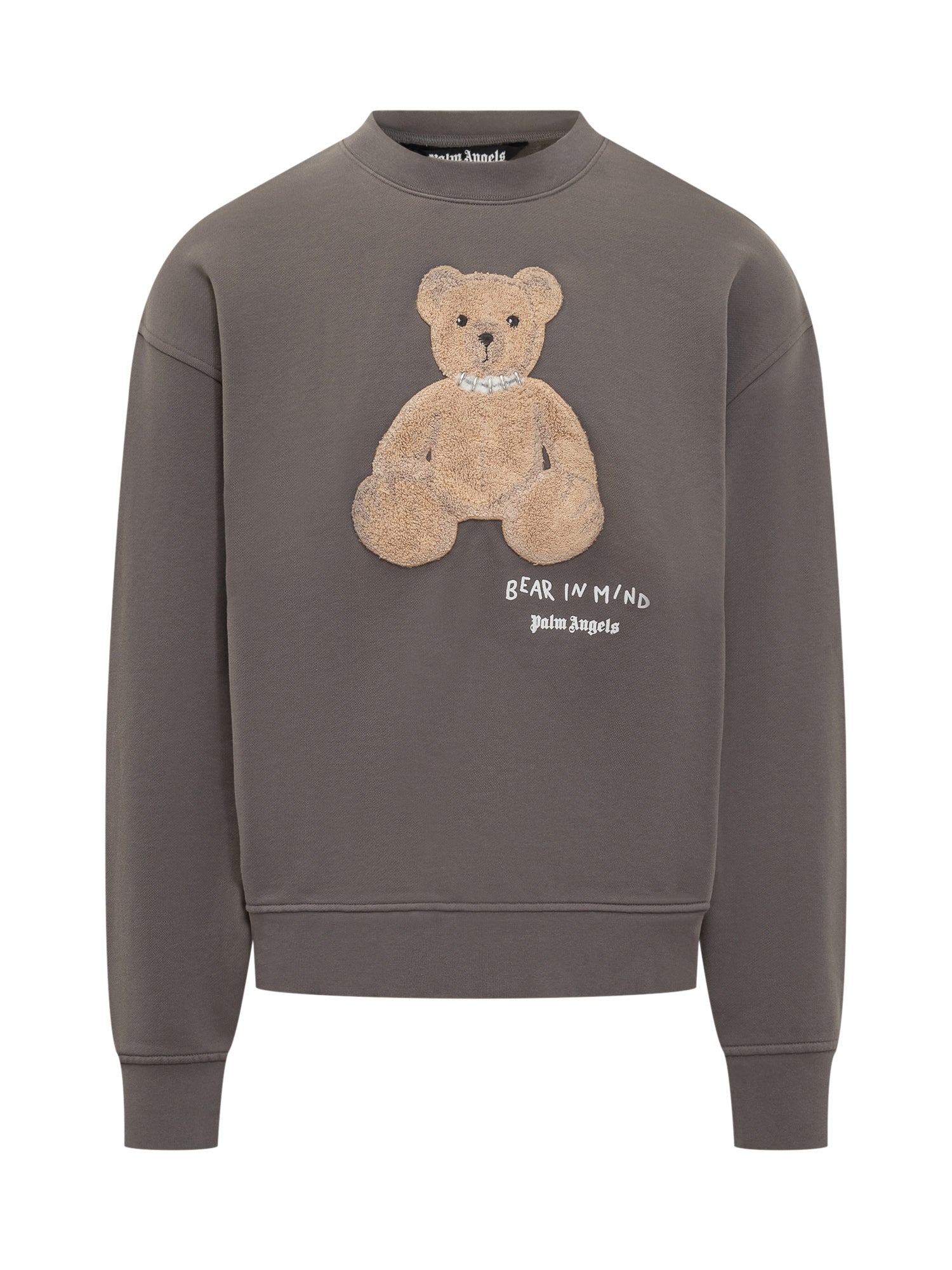 Felpa Palm Angels in cotone grigio con orsetto ricamato e scritta Bear In Mind. Modello regular con girocollo e bordi a costine.