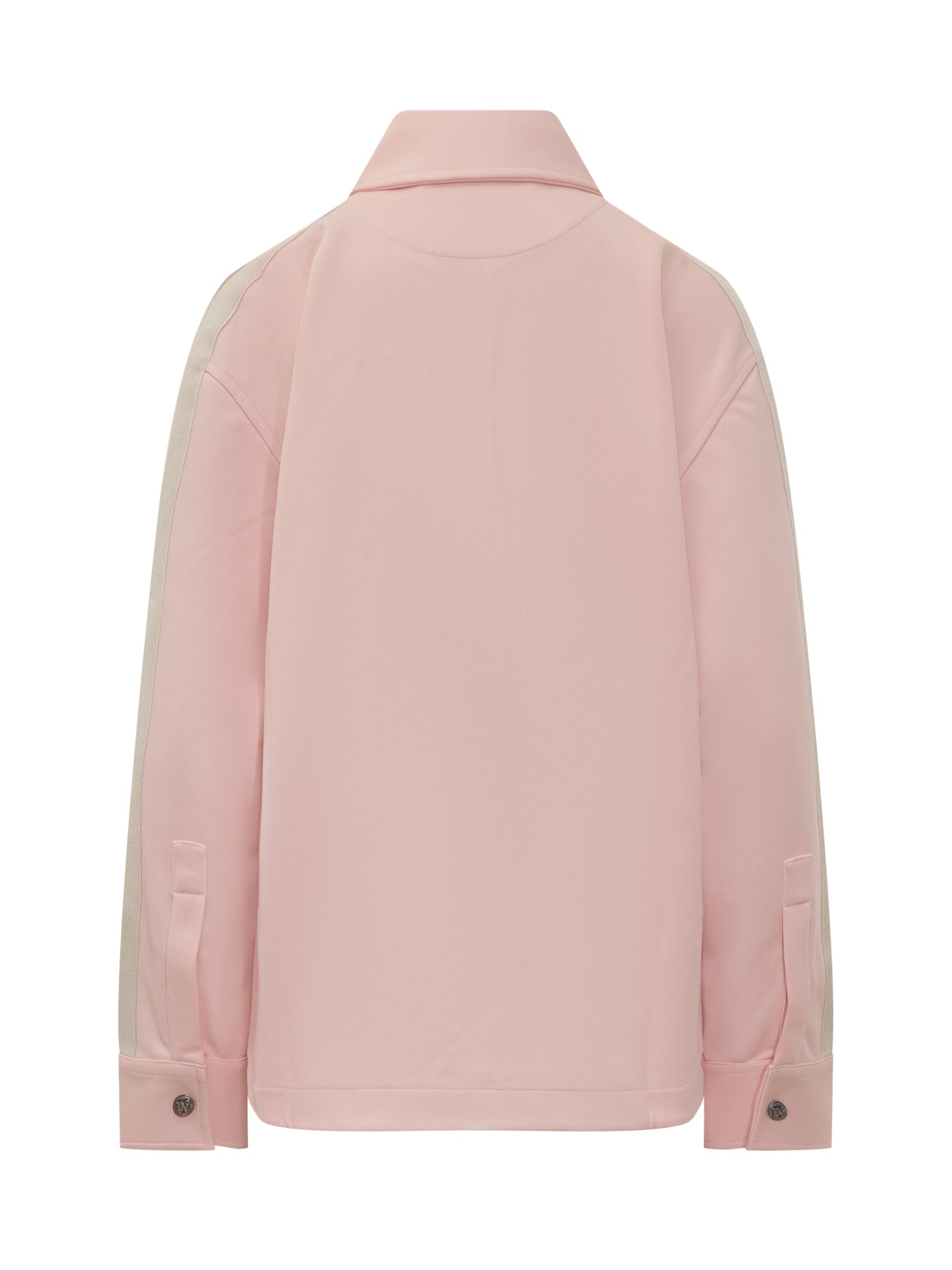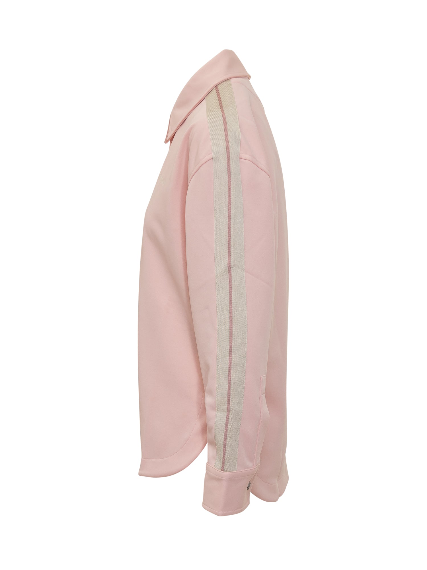 Giacca Palm Angels in tessuto tecnico rosa con bande laterali a contrasto e logo ricamato. Chiusura frontale con bottoni automatici e colletto classico.