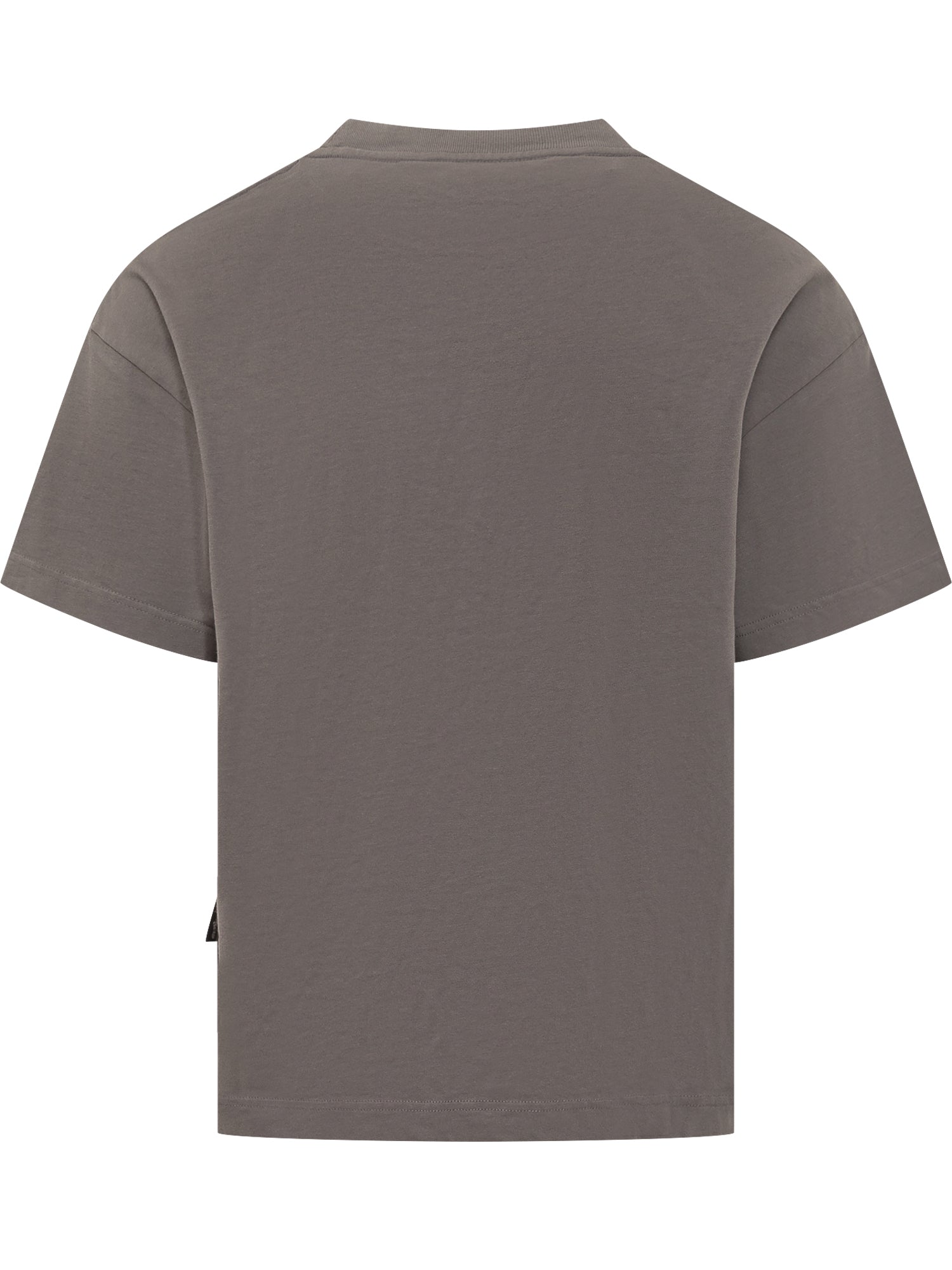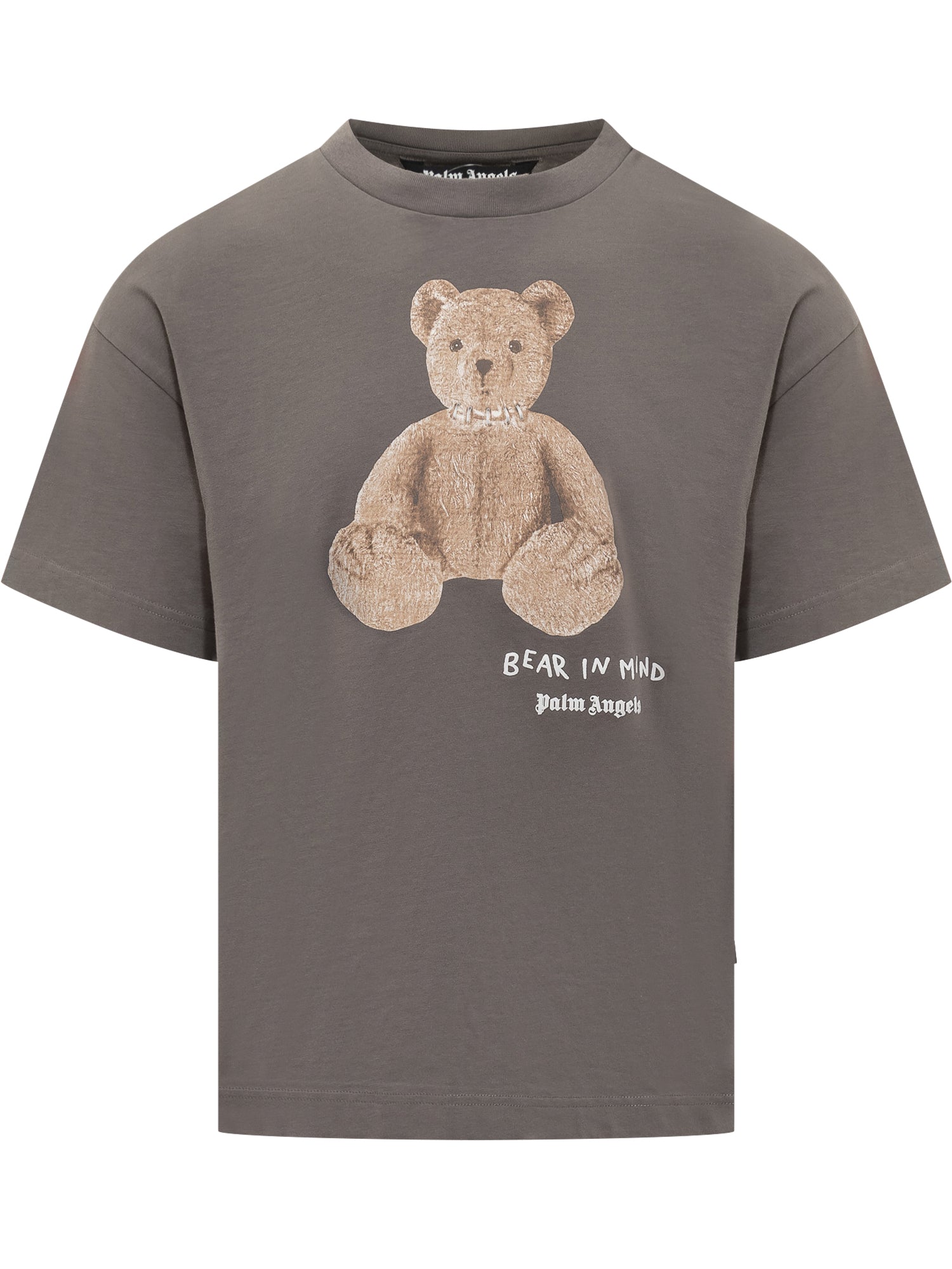T-shirt Palm Angels in cotone grigio con stampa orsetto frontale e scritta Bear In Mind.