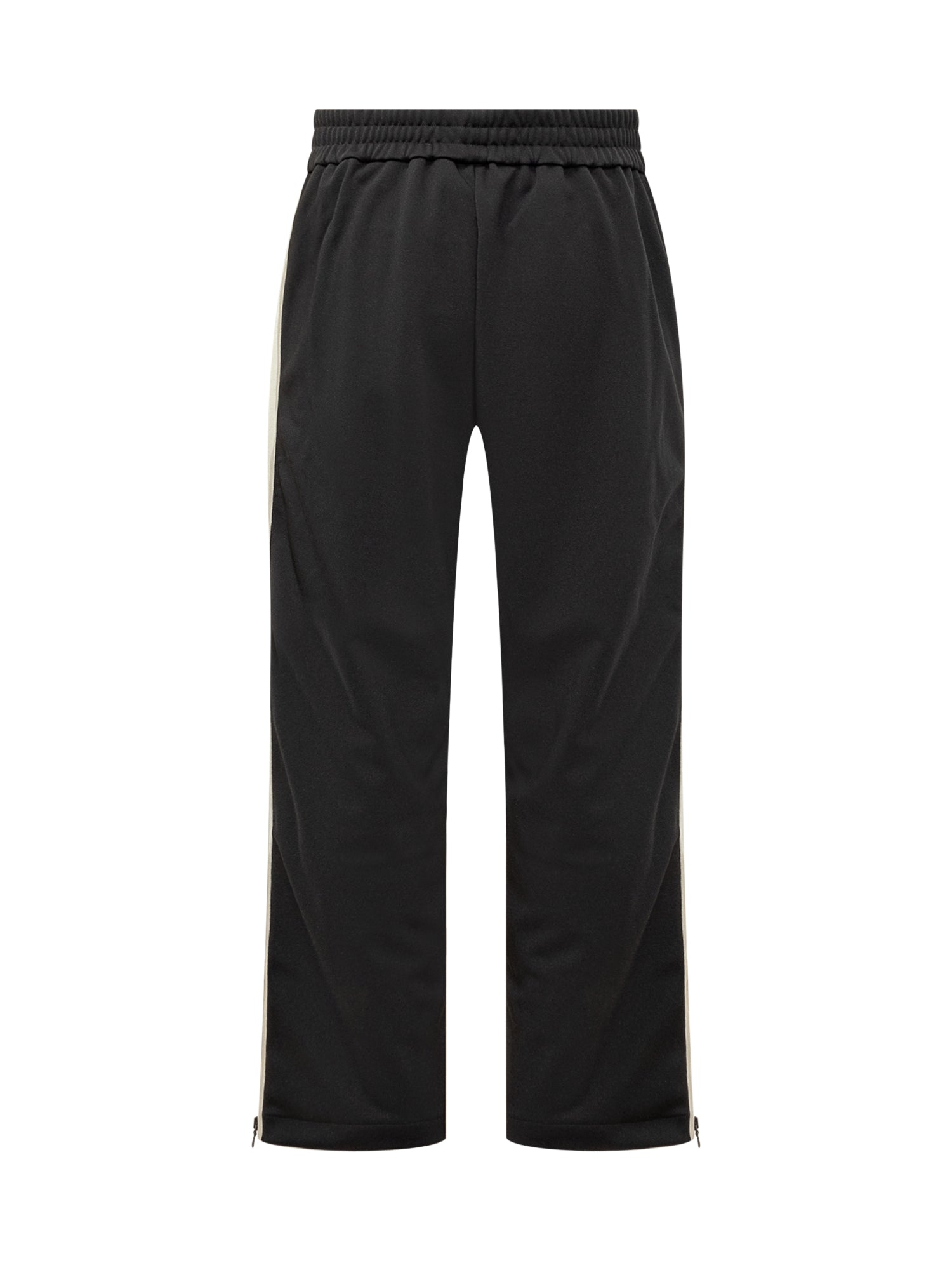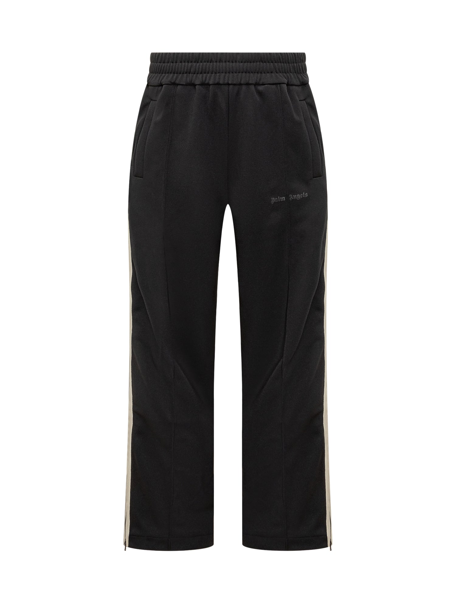 Pantaloni Palm Angels Zip Track neri con bande laterali e logo sul davanti. Vita elasticizzata per un comfort ottimale.