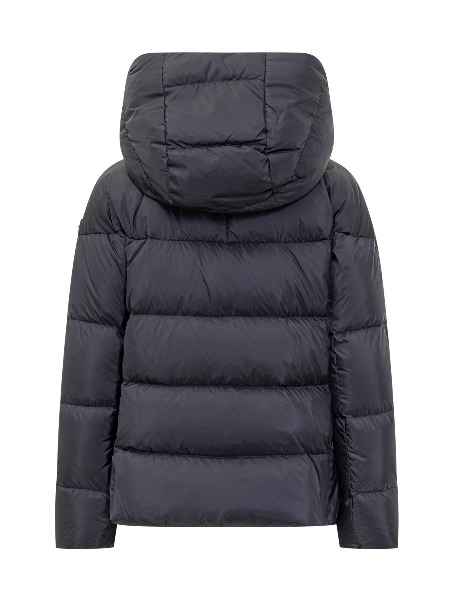 Piumino Peuterey in tonalità cammello con cappuccio avvolgente e trapuntatura a maxi quadri.