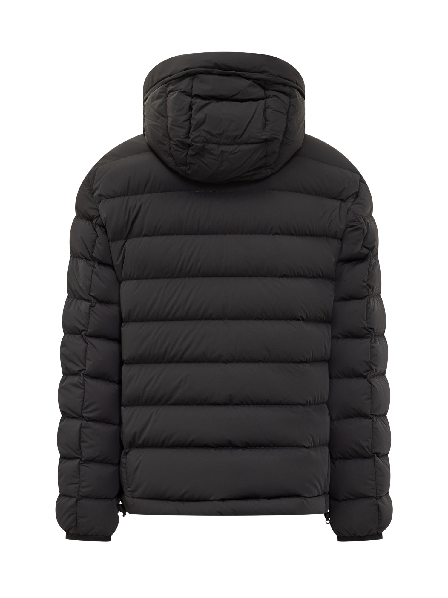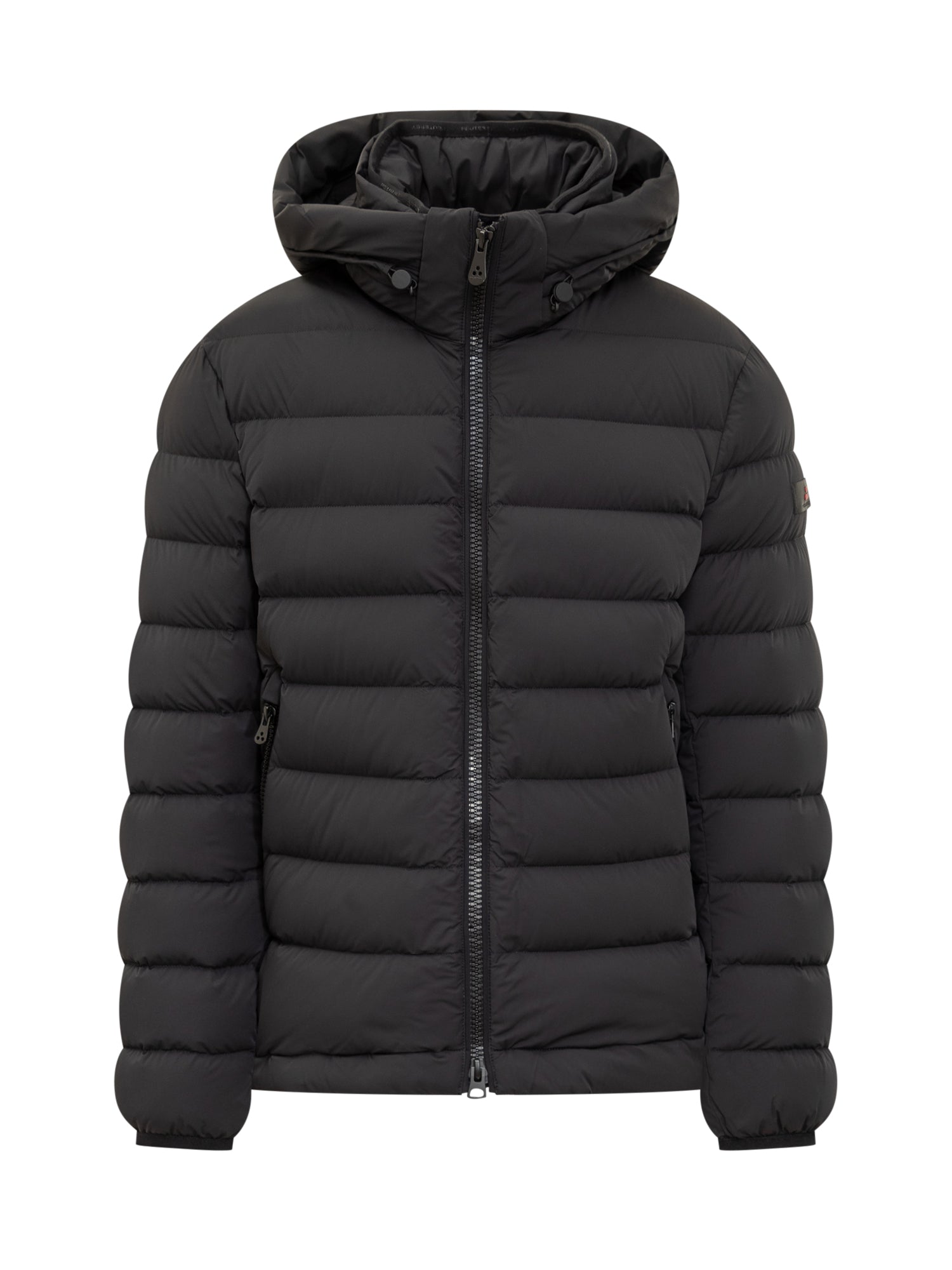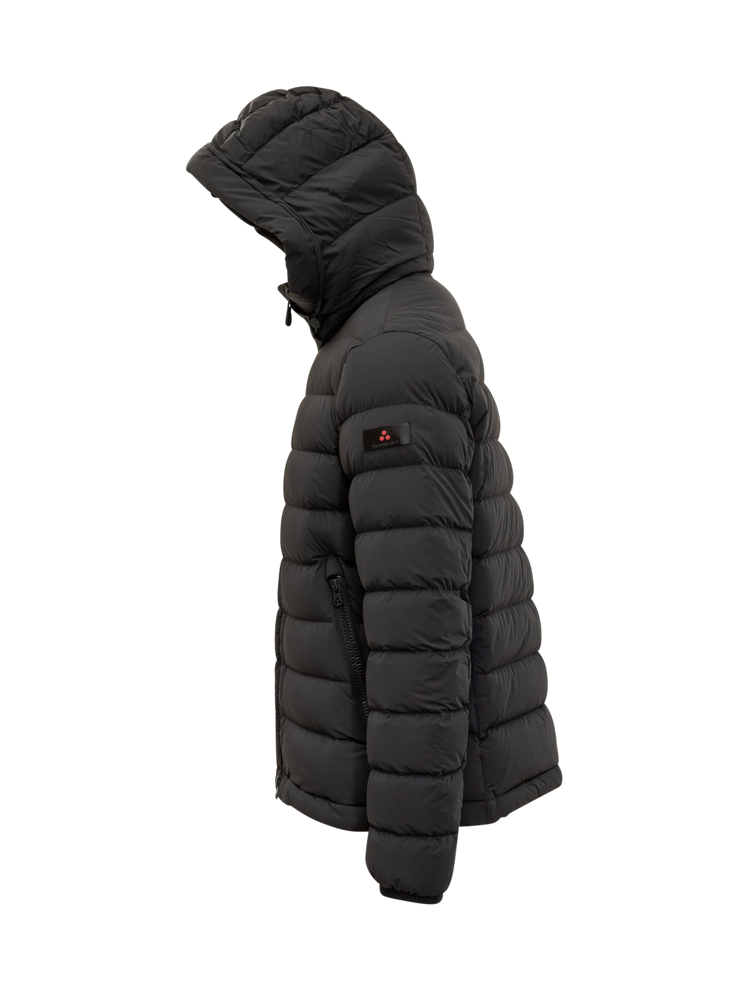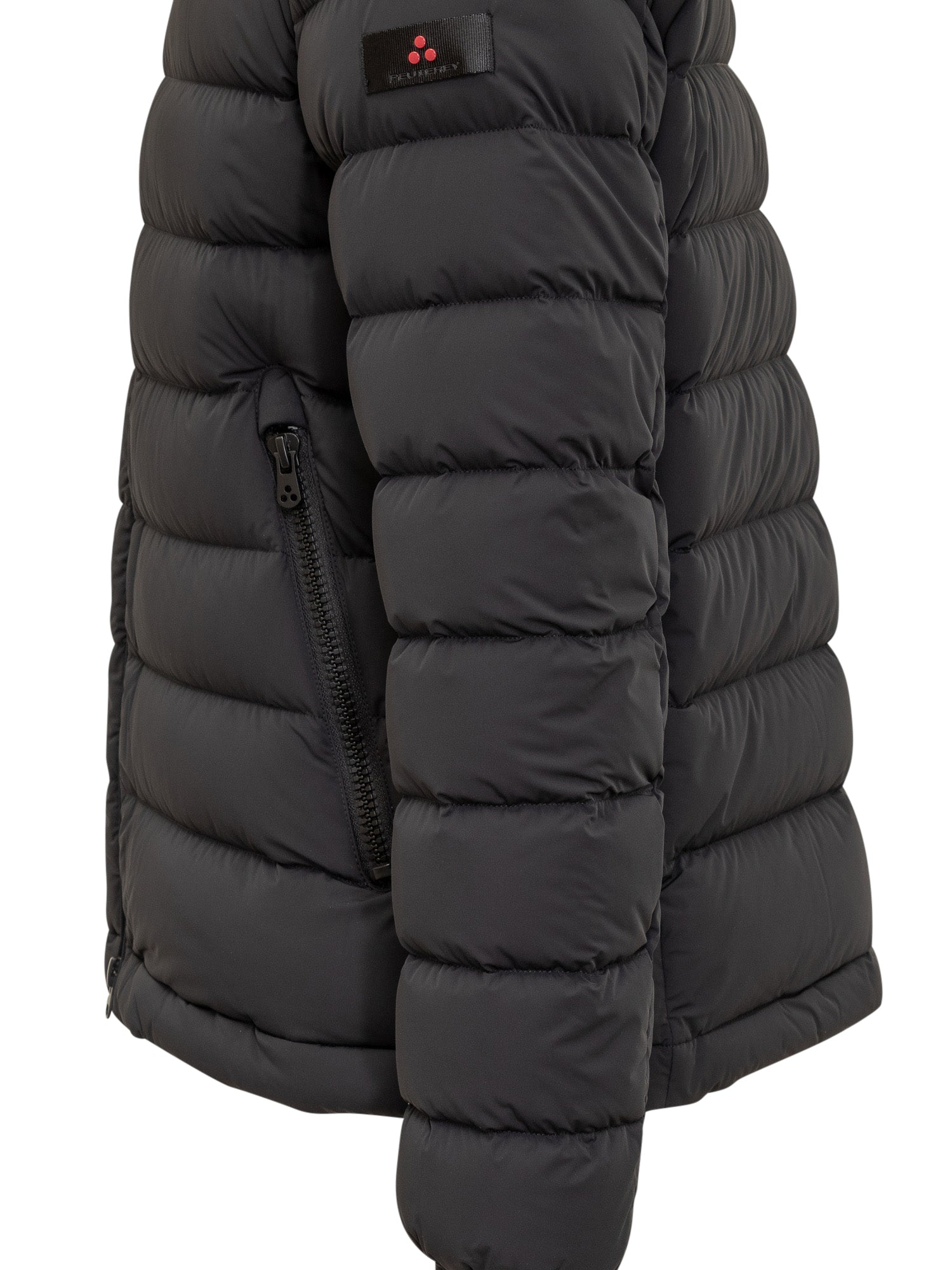 Piumino Peuterey nero con cappuccio, chiusura zip e imbottitura calda. Design trapuntato orizzontale per un look moderno e funzionale.
