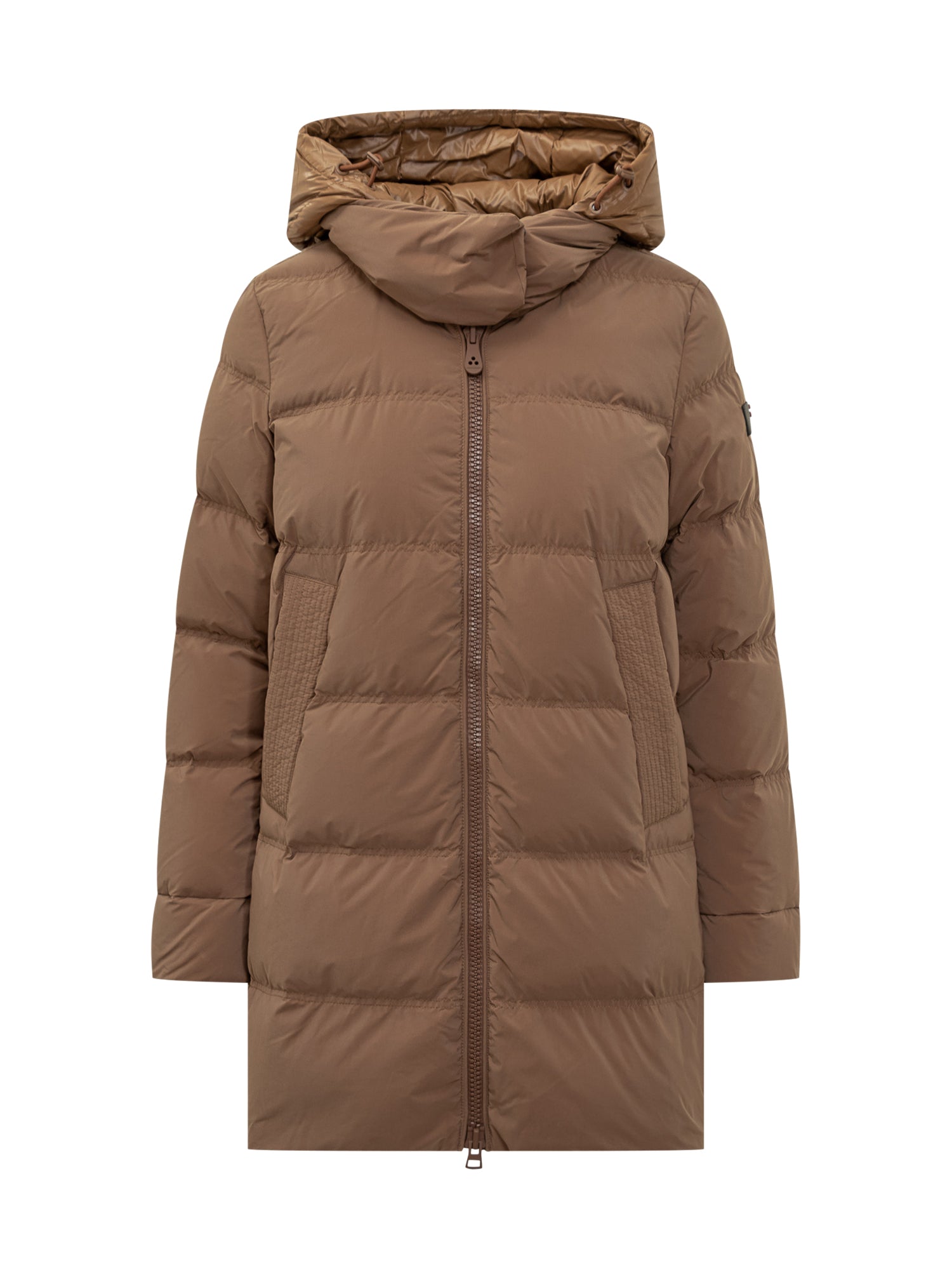 Piumino Peuterey nero con collo alto avvolgente e trapuntatura orizzontale.