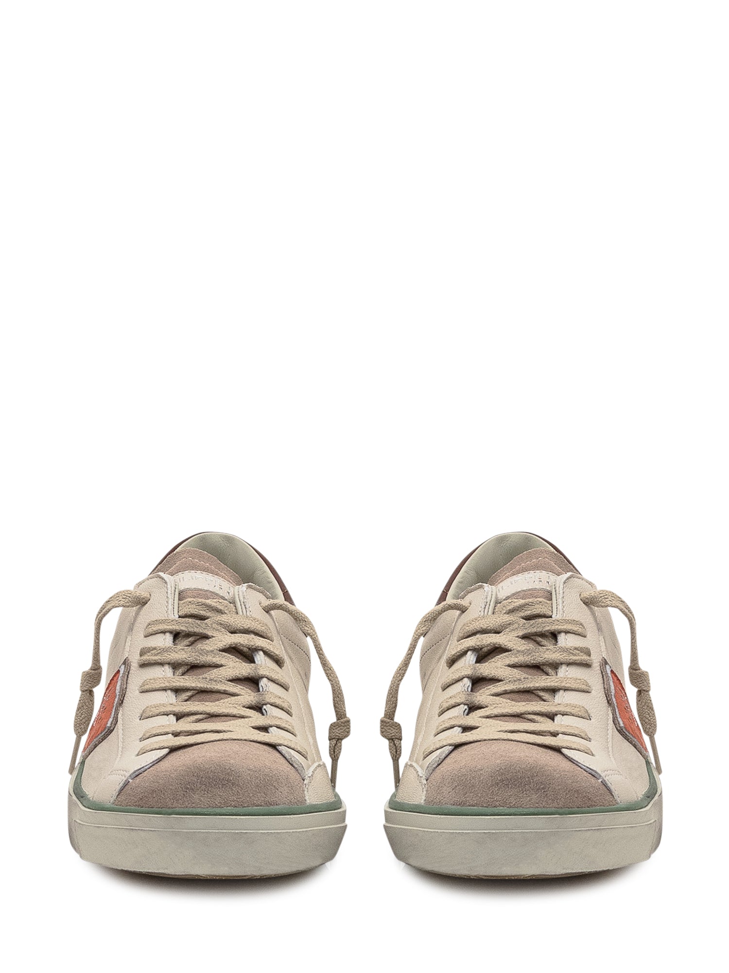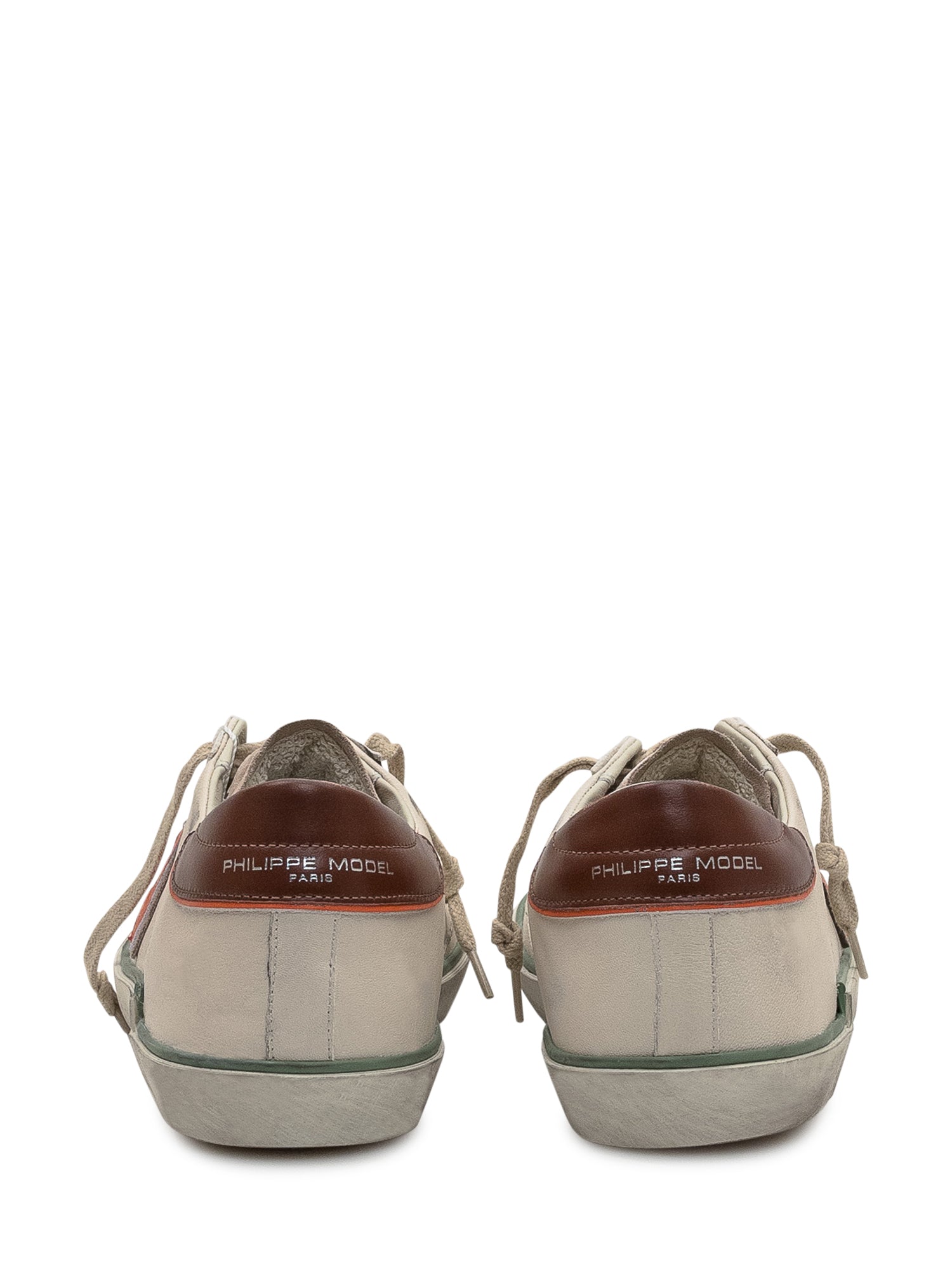 Sneaker Philippe Model Paris in pelle e suede beige con dettagli in pelle marrone. Design vintage con logo scudetto laterale arancione e suola effetto used.