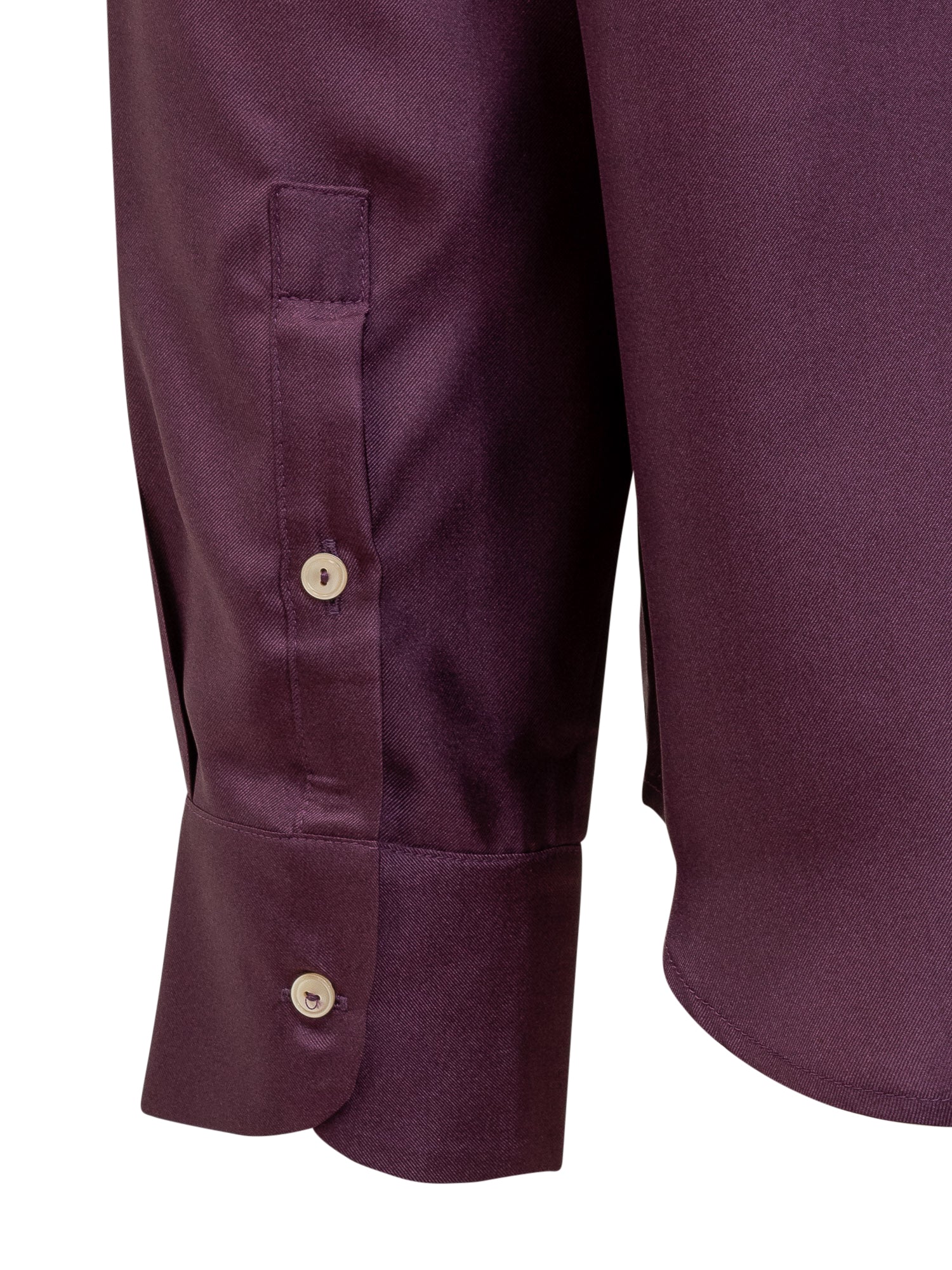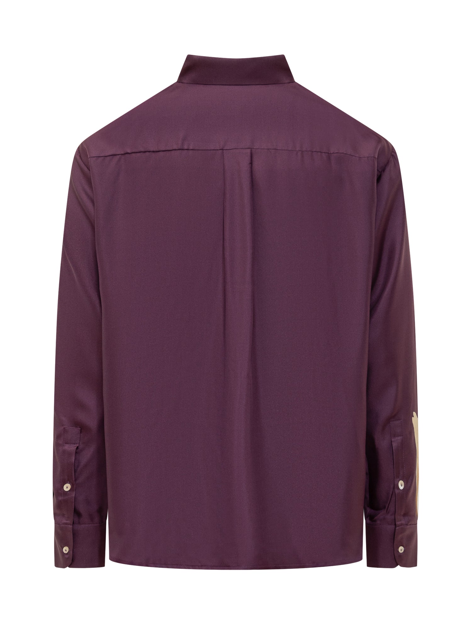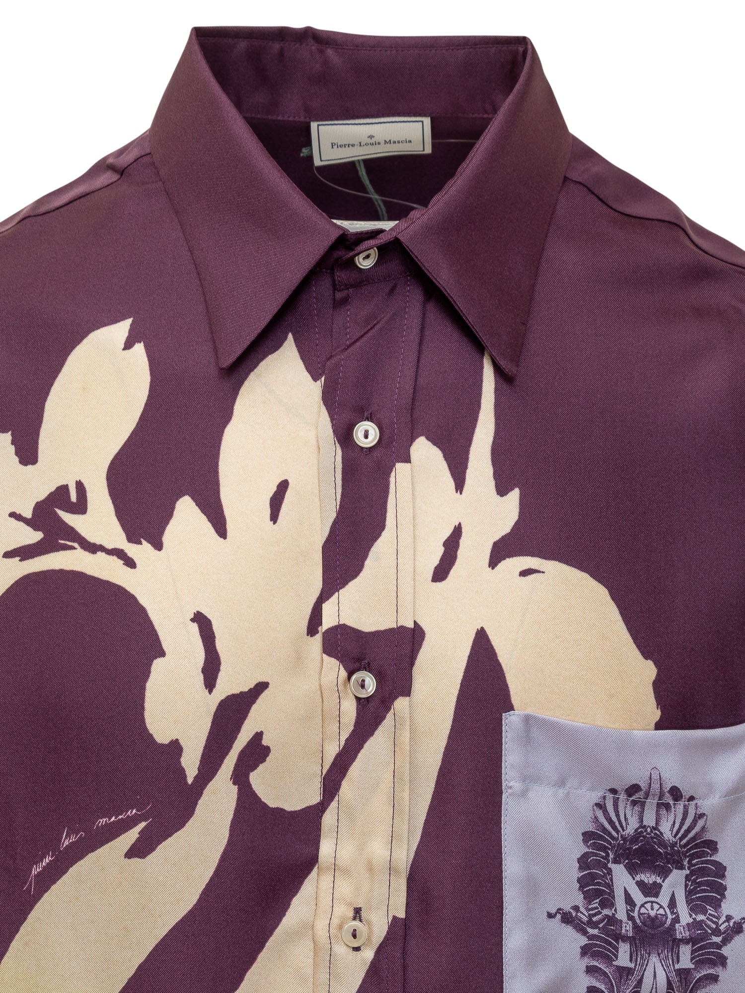 Camicia viola in seta a maniche lunghe. Colletto classico. Tasca applicata sul petto. Chiusura con bottoni. Polsini con bottoni. Stampa floreale.