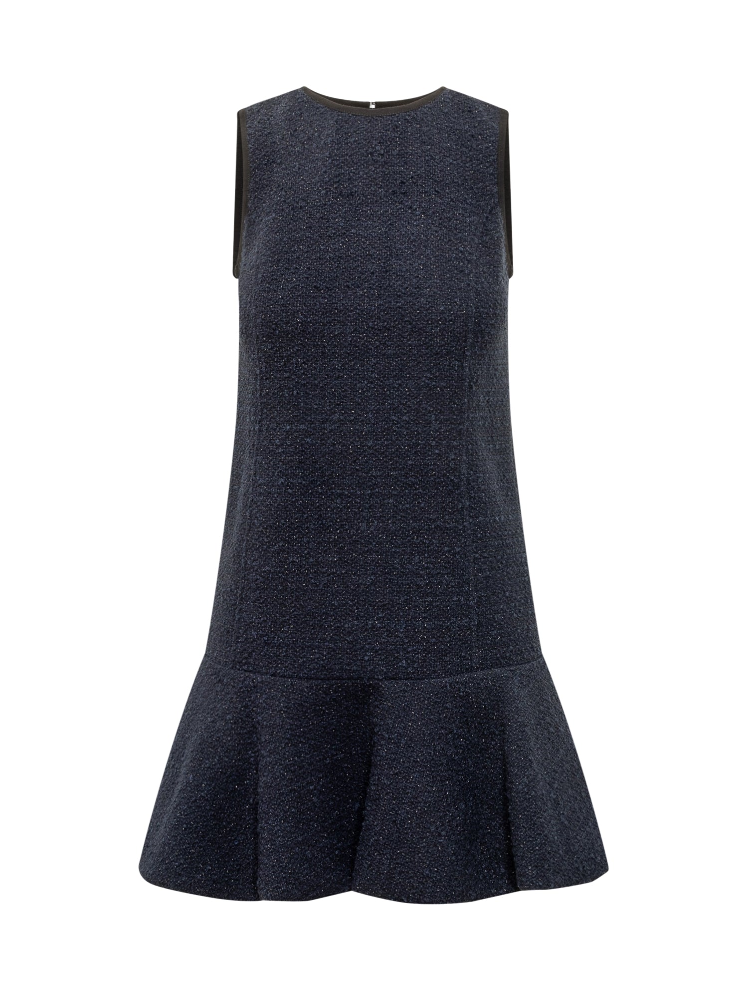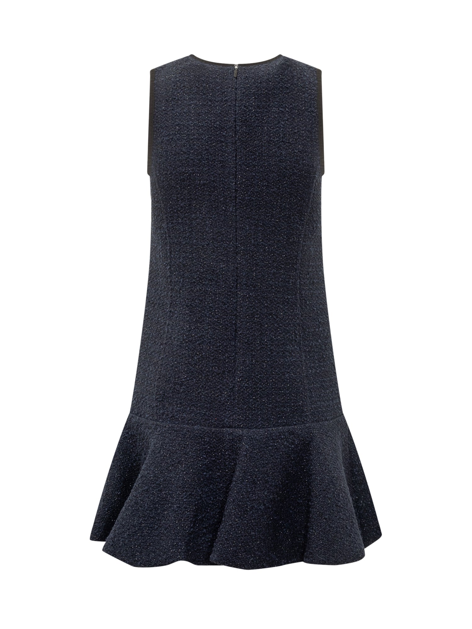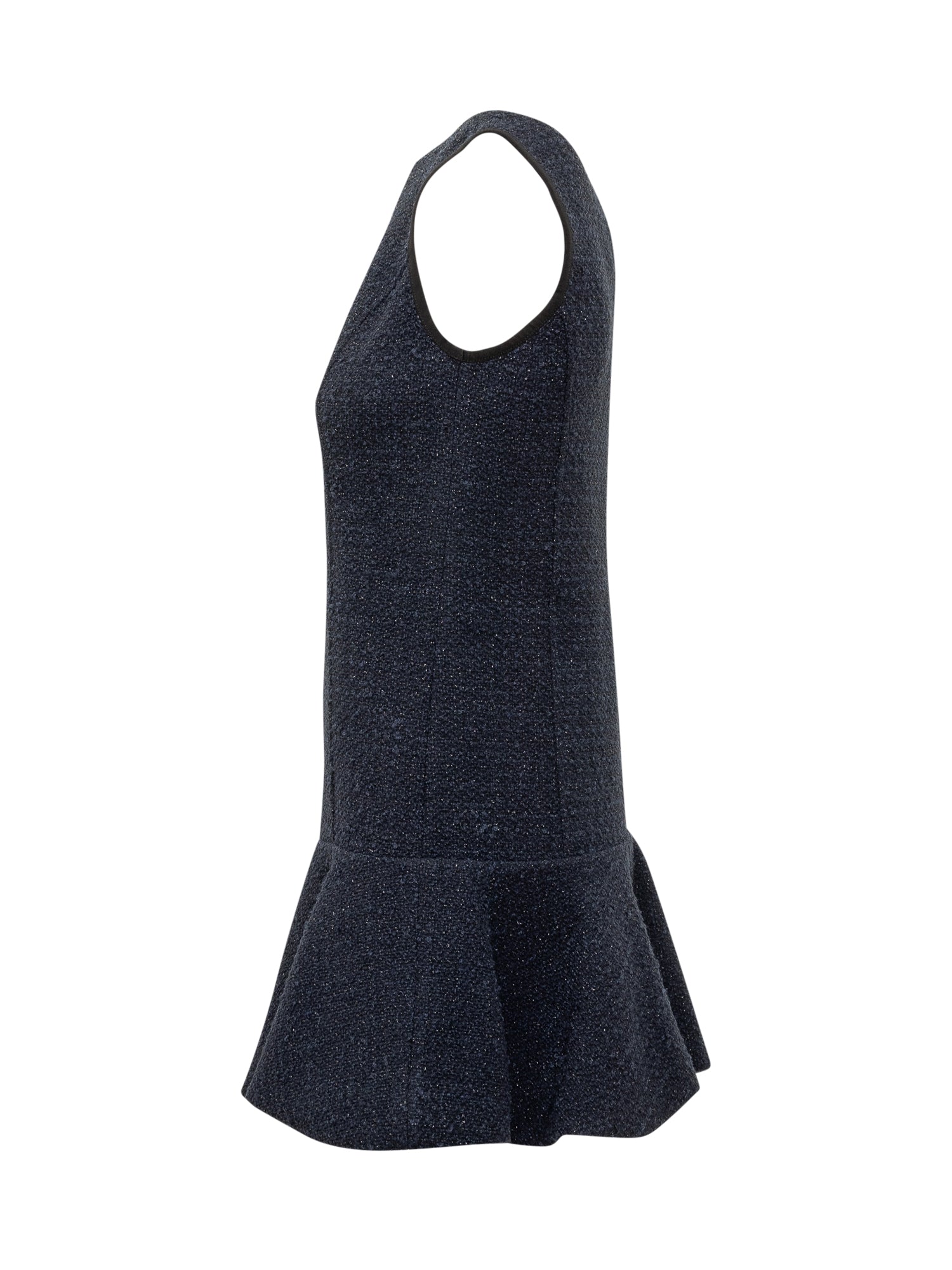 Abito Pinko modello Arrosto in tweed blu notte con taglio svasato e volant al fondo.