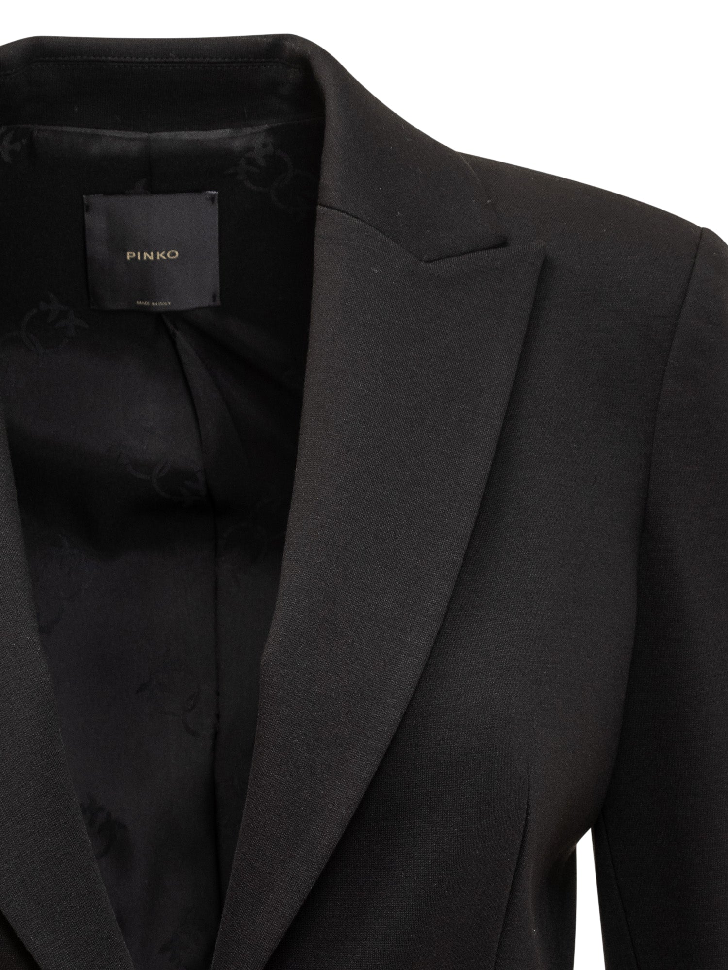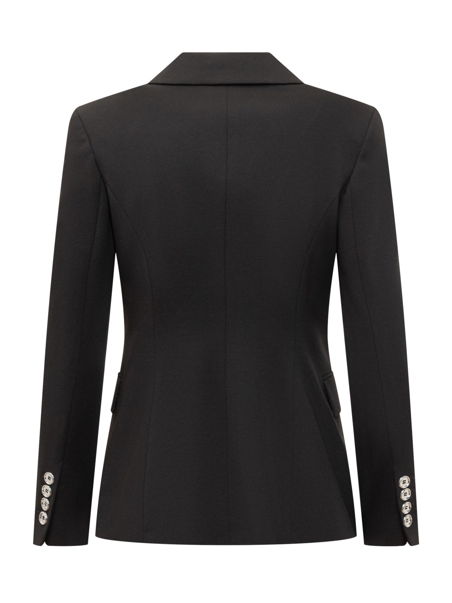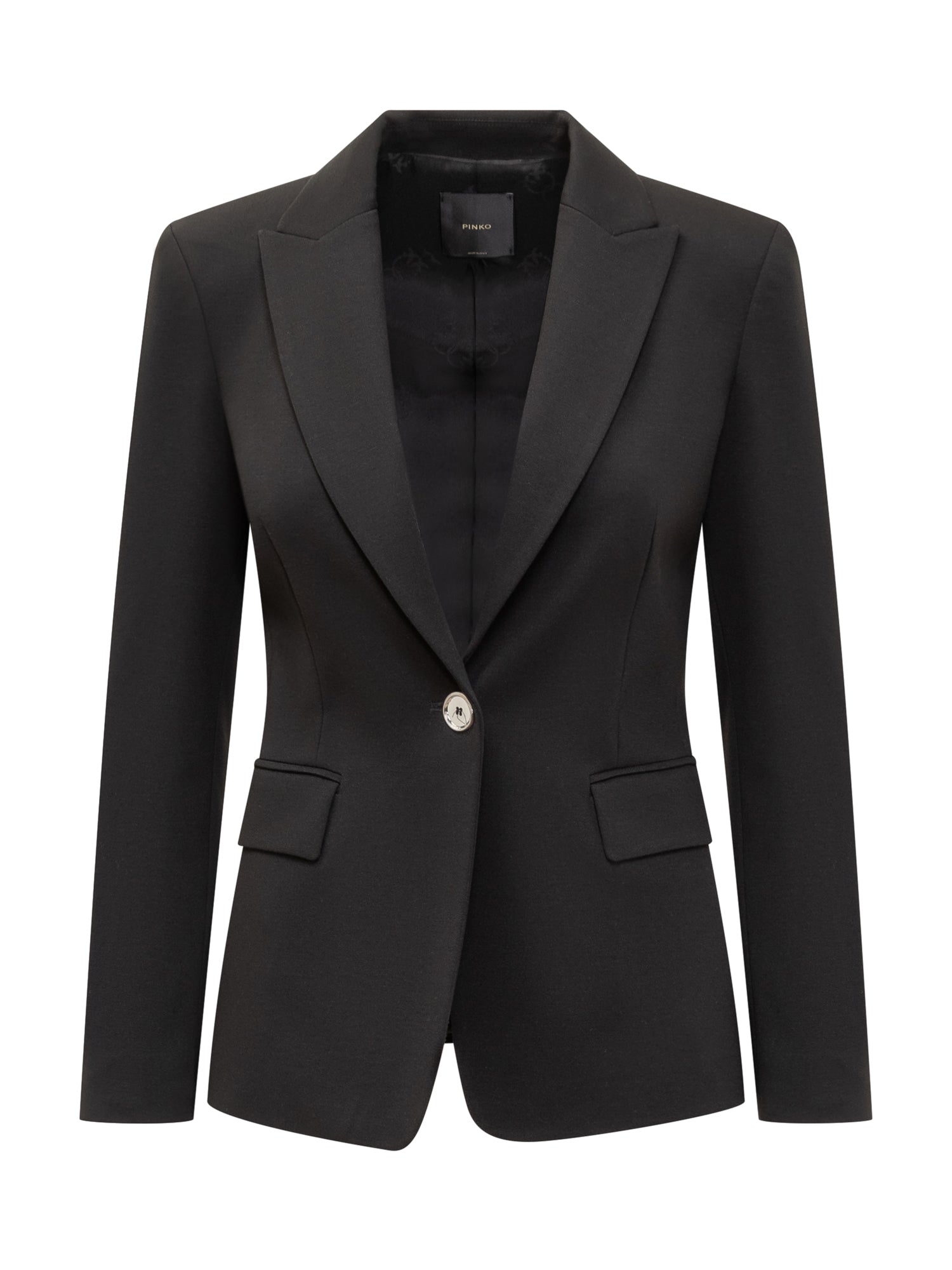 Giacca blazer in tessuto tecnico di viscosa stretch lavorata a punto stoffa effetto scuba. Collo revers. Chiusura monopetto con bottone singolo in metallo. Polsini con bottoni. Due tasche con patta sui fianchi. Foderata.
