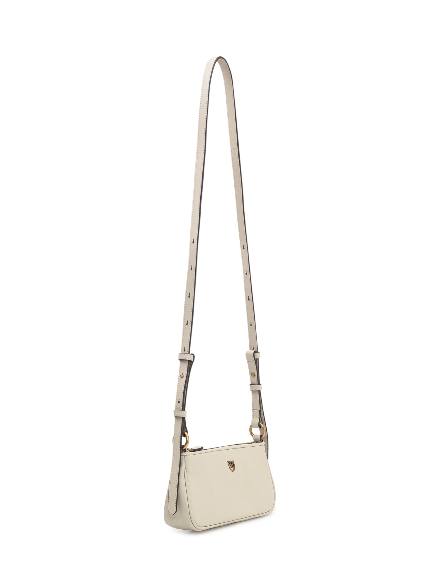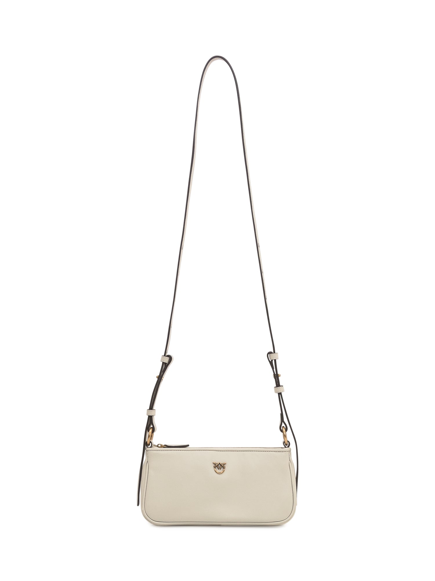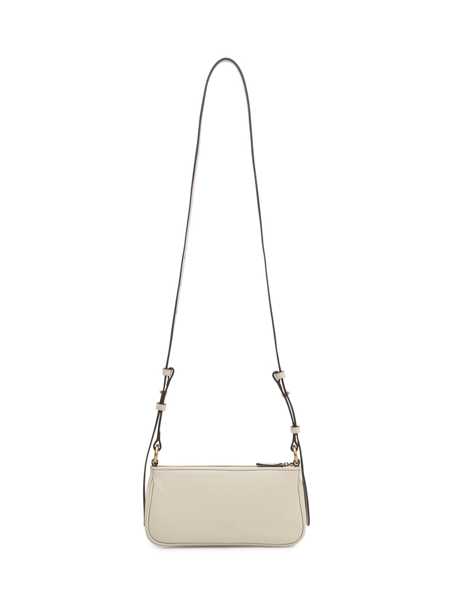 Borsa a tracolla in pelle beige con logo dorato e cinturino regolabile.