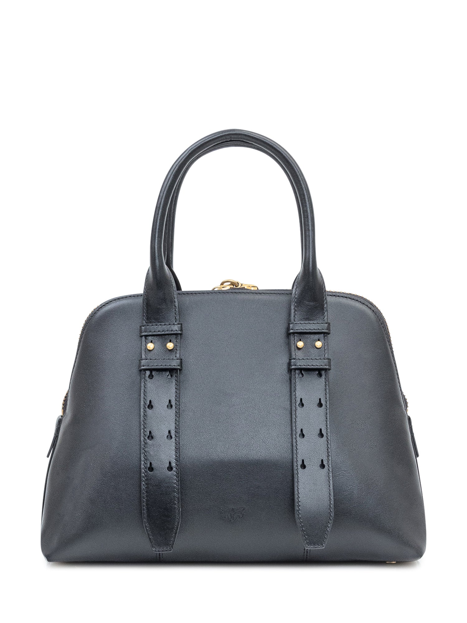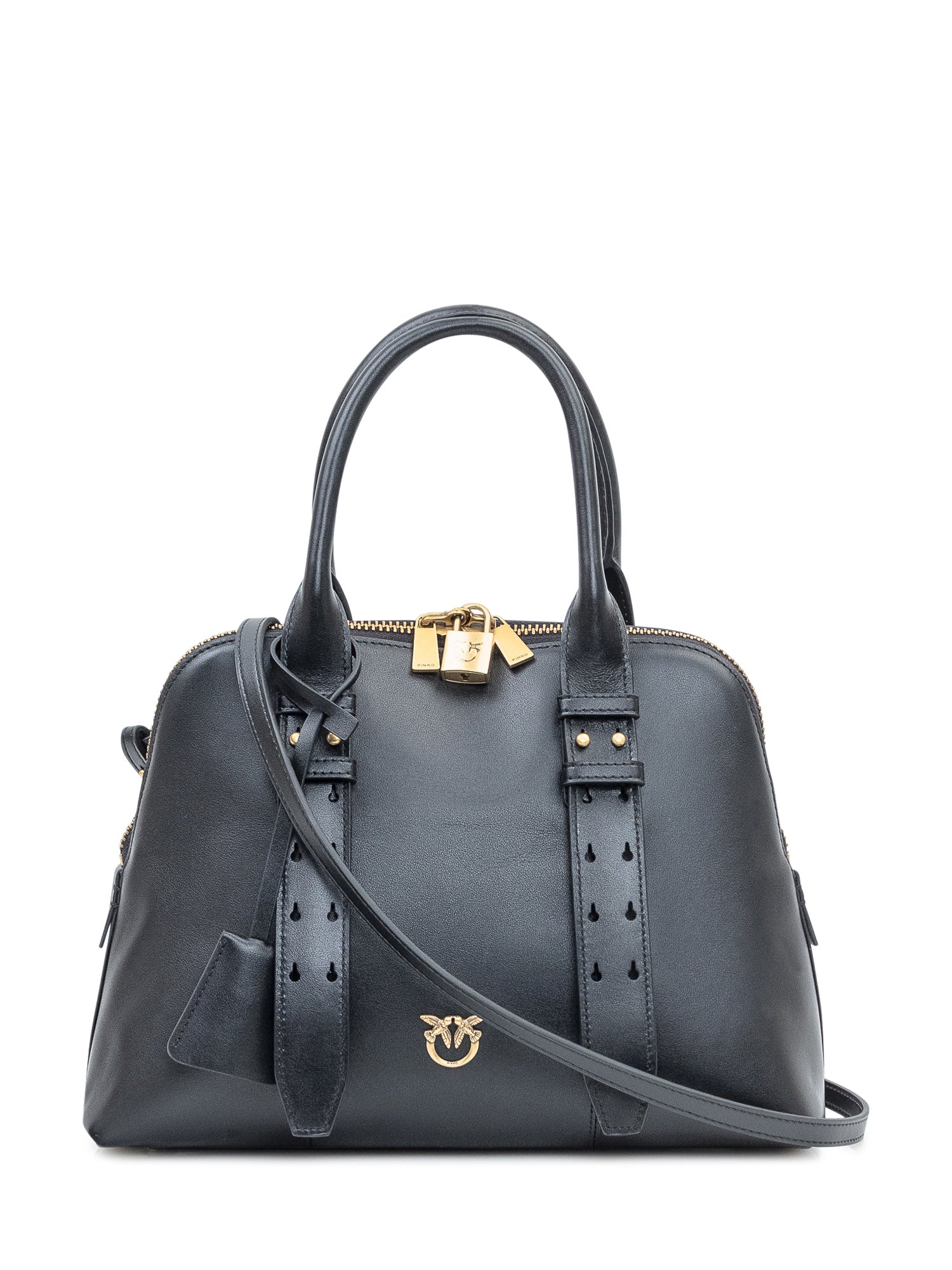 Borsa Pinko Bowling Medium in pelle nera con doppio manico, fibbia dorata e logo Love Birds frontale.