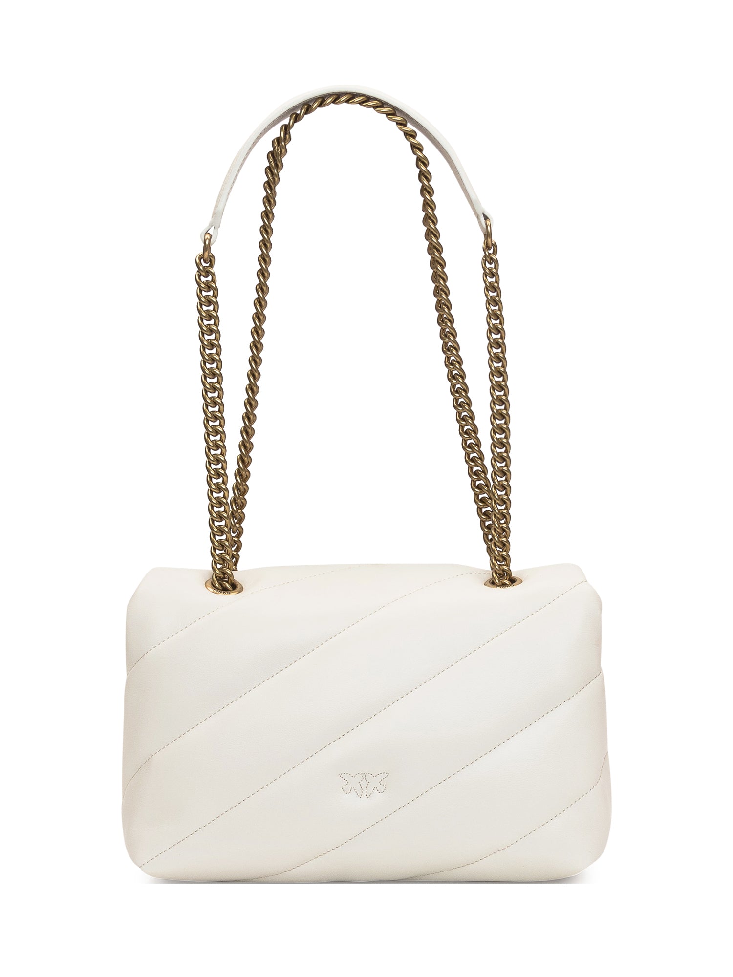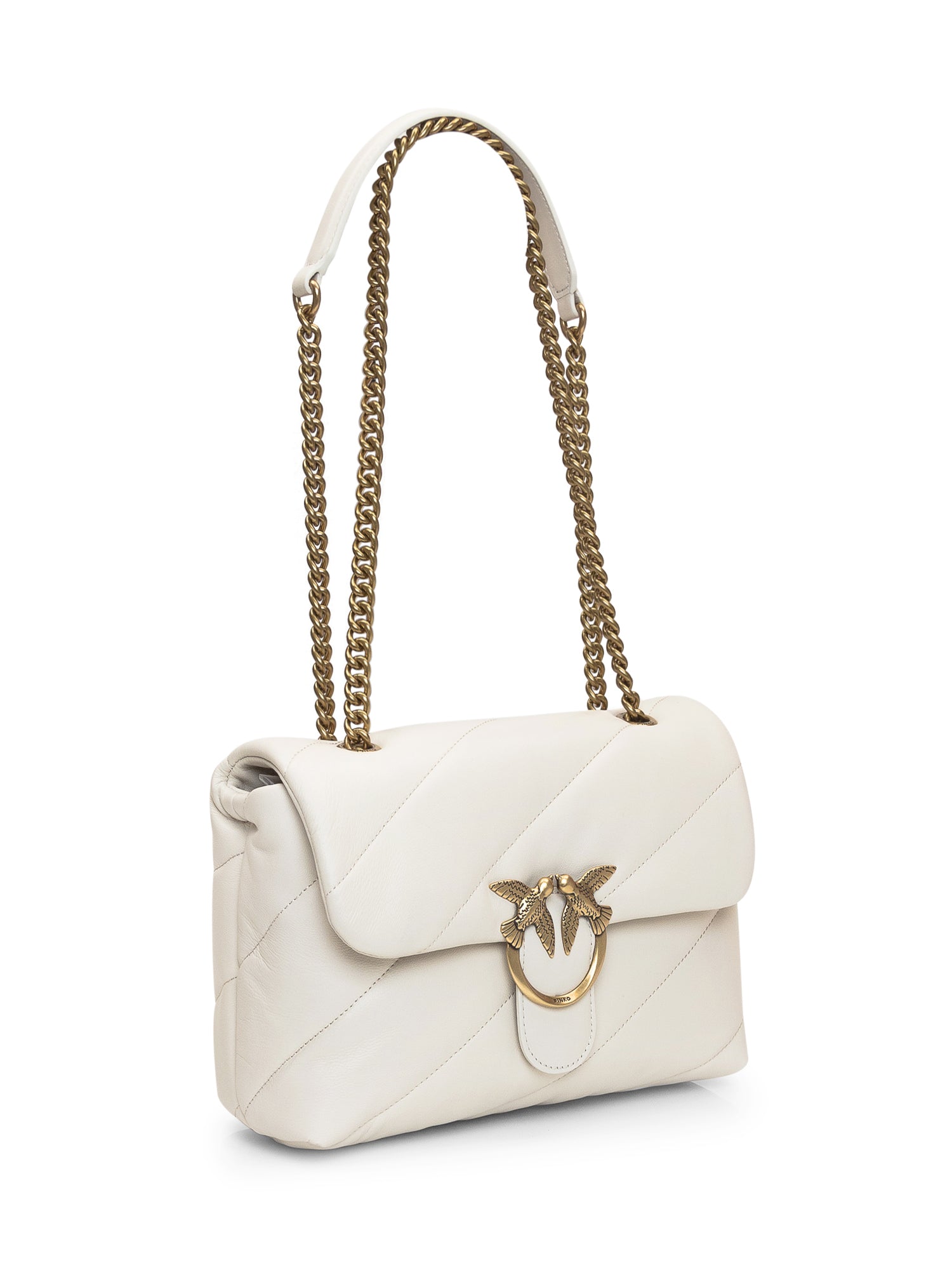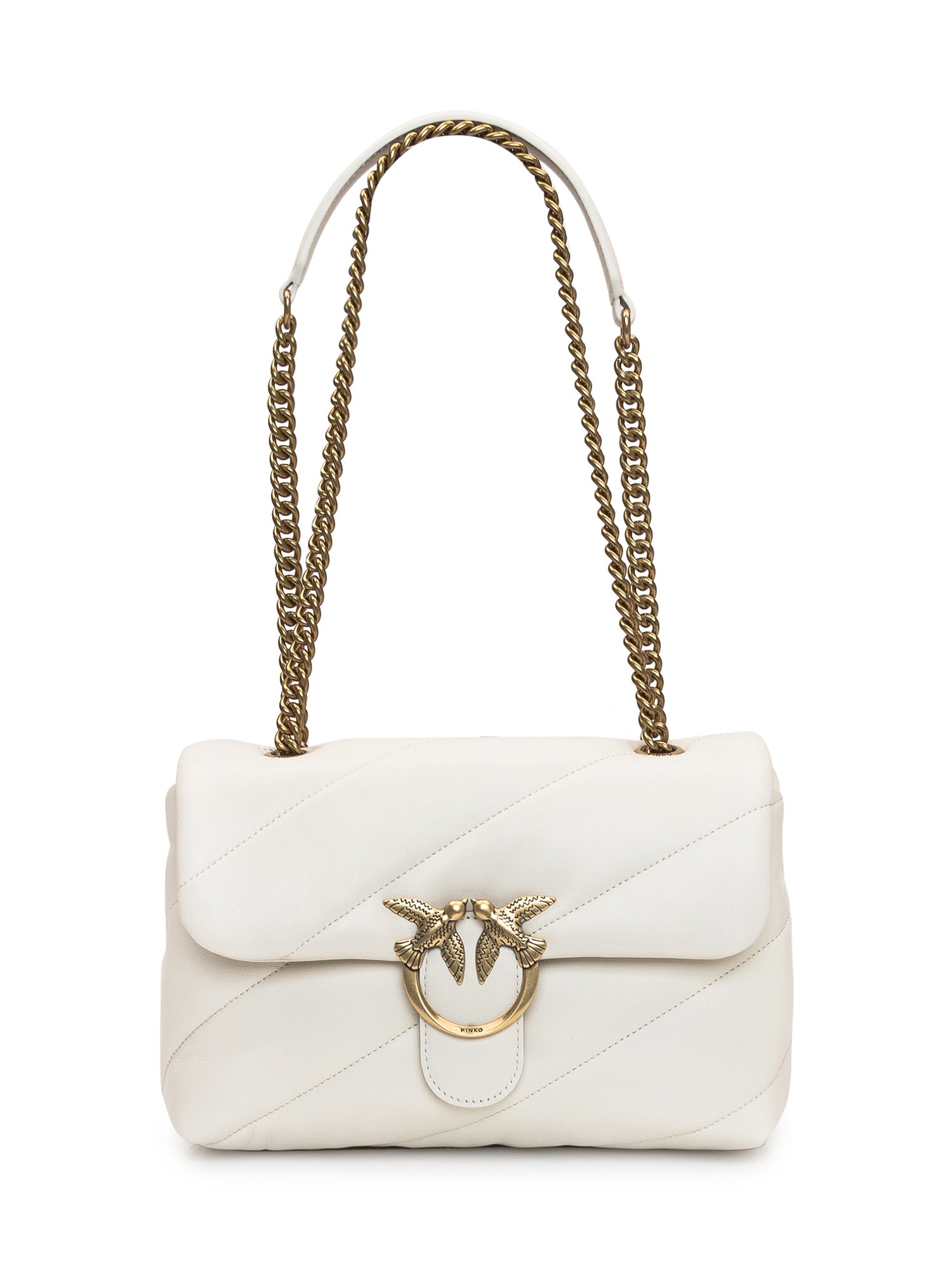 Borsa bianca in pelle. Tracolla in catena. Chiusura con patta e incastro. Fibbia con Logo Love Bird Diamond Cut. Due scomparti con tasca con zip.