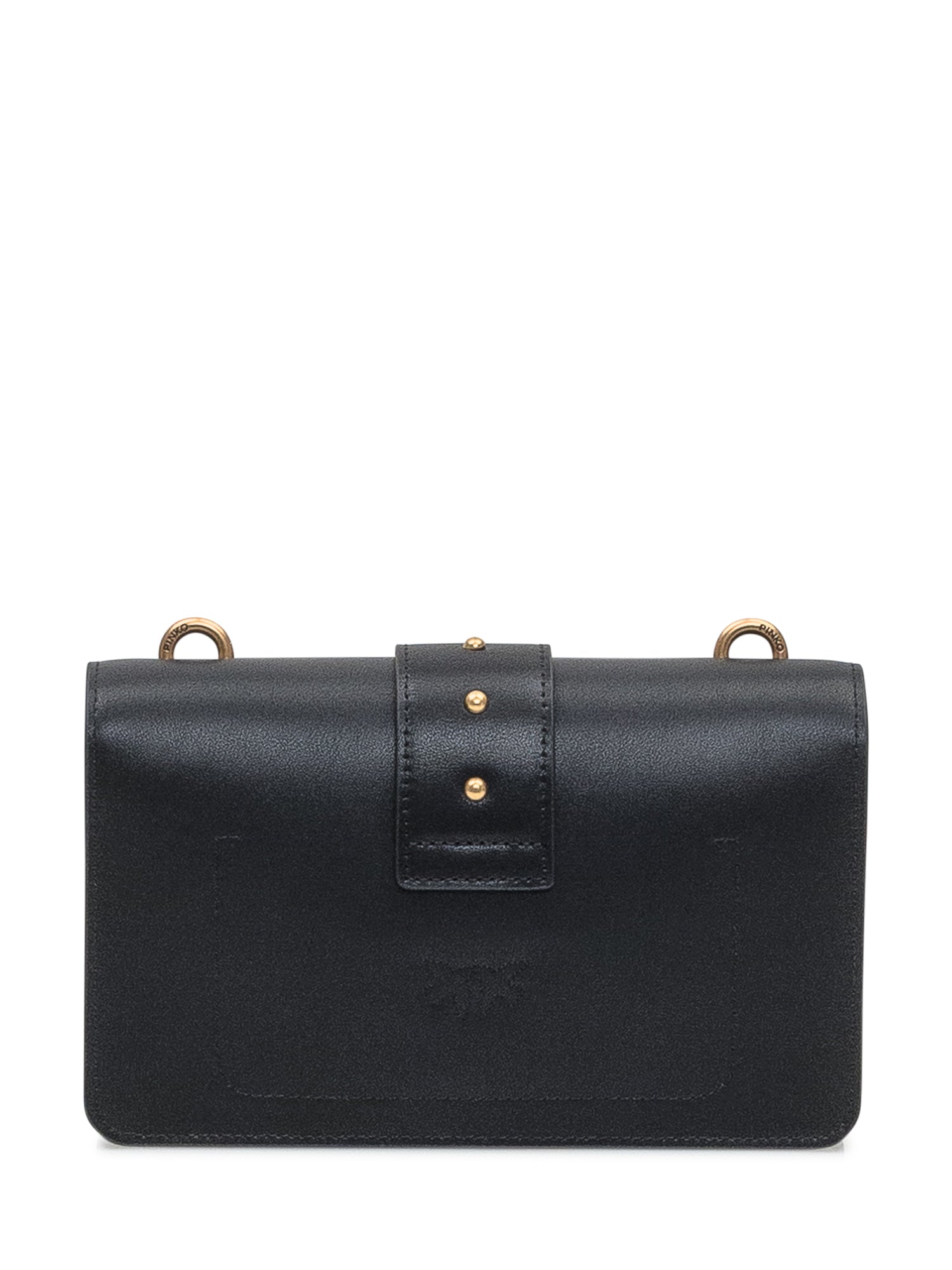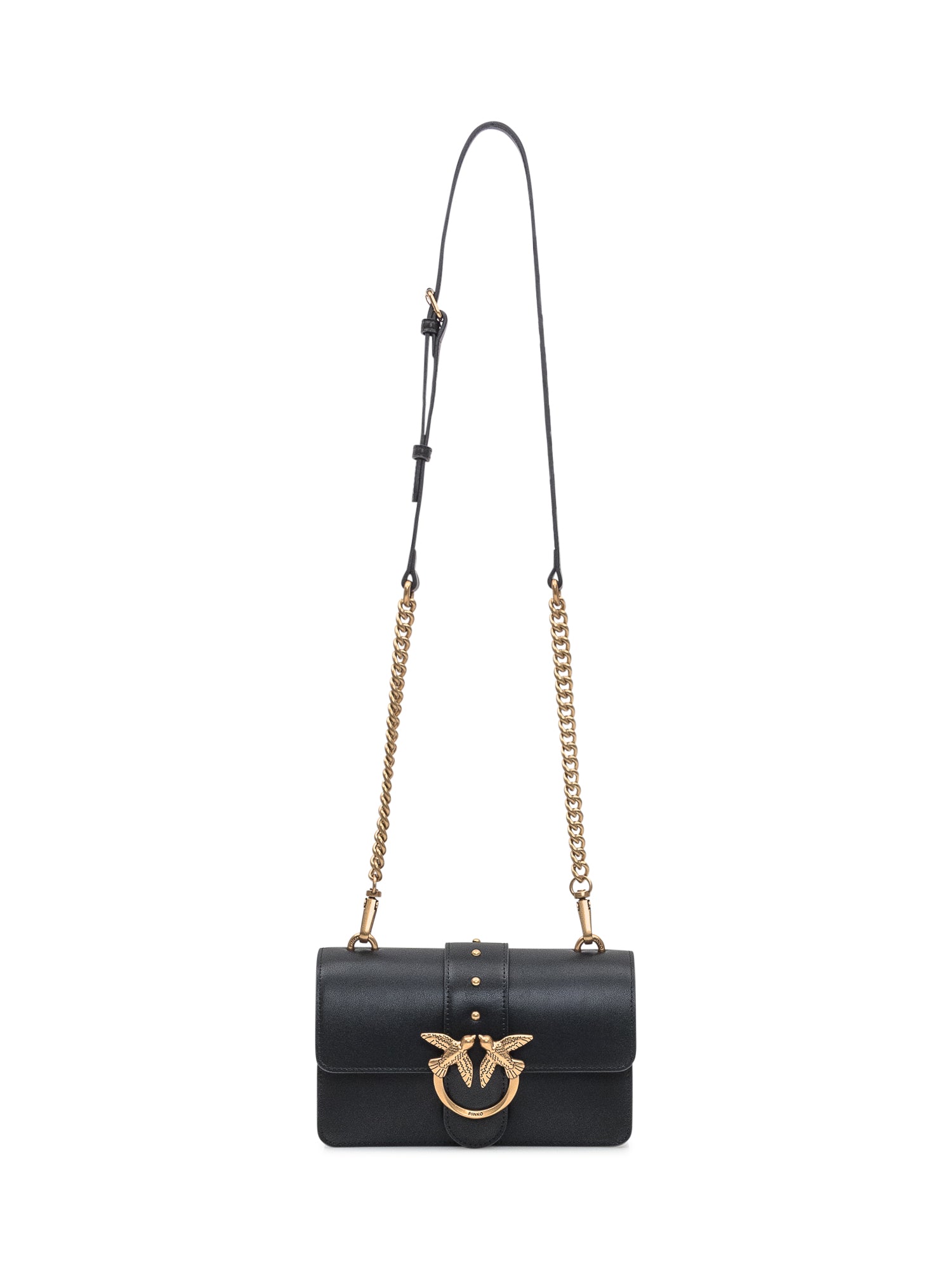 Borsa a tracolla Pinko modello Love One Mini in pelle liscia nera, con chiusura ad incastro arricchita dall iconico dettaglio delle rondini in metallo dorato.